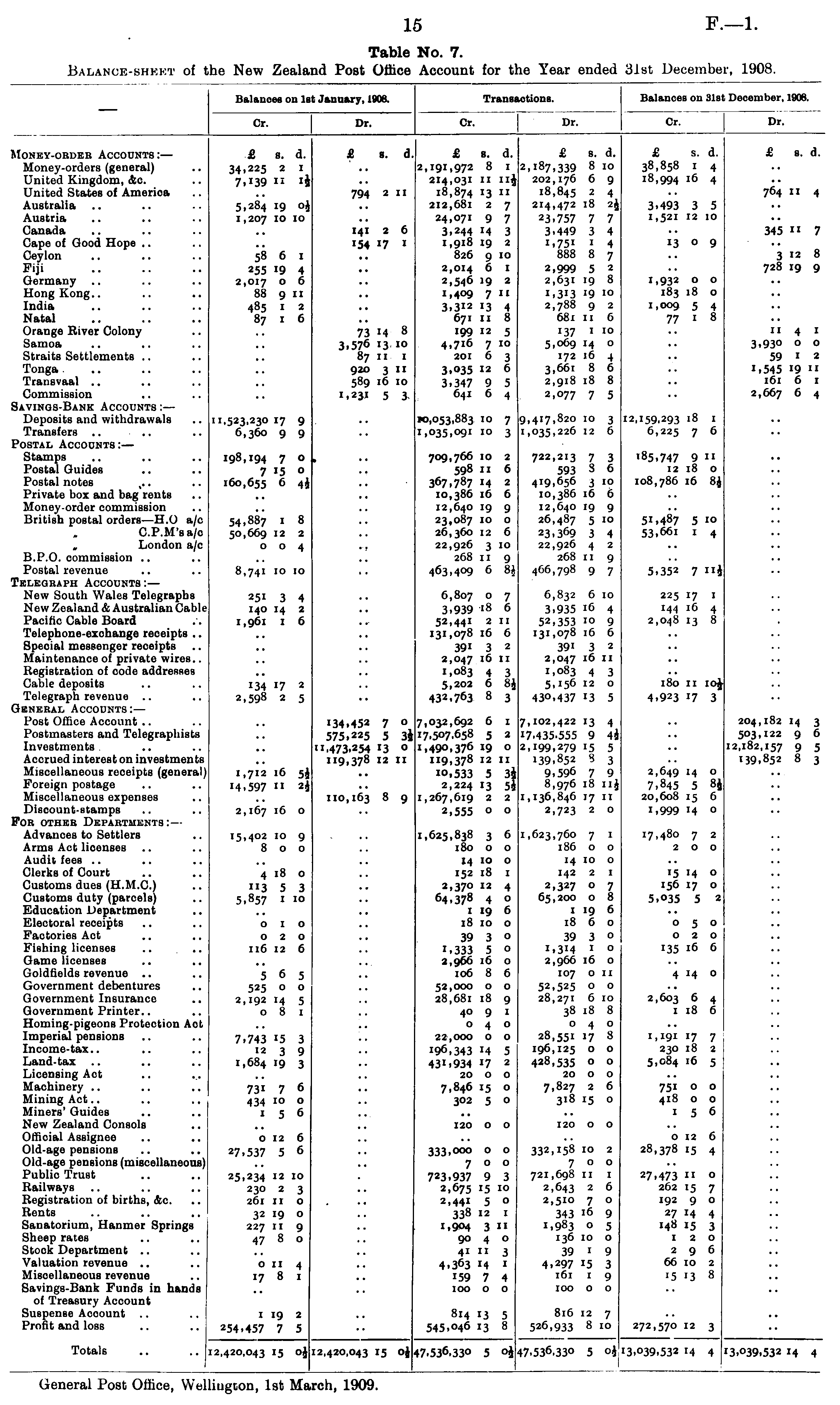 Balances on 1st January, 1908. Transactions. Balances on 31s December, 1908. Cr. Dr. Or, Dr. Cr. Dr. Money-order Accounts :— Money-orders (general) United Kingdom, &c. United States of America Australia Austria Canada Cape of Good Hope Ceylon Fiji Germany Hong Kong.. India Natal Orange River Colony Samoa Straits Settlements Tonga Transvaal Commission Savings-Bank Accounts :— Deposits and withdrawals Transfers .. Postal Accounts :— Stamps Postal Guides Postal notes Private box and bag rents Money-order commission British postal orders—H.O a/c C.P.M'sa/e London a/c B.P.O. commission .. Postal revenue Telegraph Accounts :— New South Wales Telegraphs New Zealand & Australian Cable Pacific Cable Board Telephone-exchange receipts .. Special messenger receipts Maintenance of private wires.. Registration of code addresses Cable deposits Telegraph revenue .. Gknkral Accounts: — Post Office Account Postmasters and Telegraphists Investments Accrued interest on investments Miscellaneous receipts (general) Foreign postage Miscellaneous expenses Discount-stamps For other Departments:— Advances to Settlers Arms Act licenses Audit fees Clerks of Court Customs dues (H.M.C.) Customs duty (parcels) Education Department Electoral receipts Factories Act Fishing licenses Game licenses Goldfields revenue Government debentures Government Insurance Government Printer.. Homing-pigeons Protection Act Imperial pensions Income-tax.. Land-tax Licensing Act Machinery Mining Act.. .. Miners' Guides New Zealand Consols Official Assignee .. .. Old-age pensions .. .. j Old-age pensions (miscellaneous) Public Trust .. .. | Railways Registration of births, &c. Rents .. .. .. I Sanatorium, Hanmer Springs Sheep rates Stock Department Valuation revenue Miscellaneous revenue Savings-Bank Funds in hands of Treasury Account Suspense Acoount Profit and loss £ s. d. 34,225 2 1 7,139 11 ij £ a. d. £ s. d. 2,191,972 8 1 214,031 11 11J 18,874 13 11 212,681 2 7 24,071 9 7 3,244 14 3 1,918 19 2 826 9 10 2,014 6 1 2,546 19 2 1,409 7 11 3,312 13 4 671 11 8 199 12 5 4,7i6 7 10 201 6 3 3,035 12 6 3,347 9 5 641 6 4 £ s. d. 2,187,339 8 10 202,176 6 9 18,845 2 4 214,472 18 2j 23,757 7 7 3,449 3 4 i,75i 1 4 888 8 7 2,999 5 2 2,631 19 8 1,313 19 10 2,788 9 2 681 11 6 137 1 10 5,069 14 o 172 16 4 3,661 8 6 2,918 18 8 2,077 7 5 £ s. d. 38,858 1 4 18,994 16 4 £ 8. d. 794 2 n 764 11 4 5,284 19 oj 1,207 10 10 3,493 3 5 1,521 12 10 141 2 6 154 17 1 13 o 9 345 II 7 58 6 1 255 19 4 2,017 o 6 88 9 11 485 1 2 87 1 6 1,932 o o 183 18 o 1,009 5 4 77 1 8 3 12 8 728 19 9 73 14 8 3,576 13 10 87 11 1 920 3 n 589 16 10 1,231 5 3 11 4 1 3.93° o o 59 1 2 1,545 19 11 161 6 1 2,667 6 4 11,523,230 17 9 6,360 9 9 ,0,053,883 10 7 1,035,091 10 3 9,417,820 10 3 1,035,226 12 6 12,159,293 18 1 6,225 7 6 198,194 7 o 7 15 o 160,655 6 4J 54,887 1 8 50,669 12 2 004 709,766 10 2 598 11 6 367,787 14 2 10,386 16 6 12,640 19 9 23,087 10 o 26,360 12 6 22,926 3 10 268 11 9 463,409 6 8J 722,213 7 3 593 3 6 419,656 3 10 10,386 16 6 12,640 19 9 26,487 5 10 23,369 3 4 22,926 4 2 268 11 9 466,798 9 7 i85,747 9 11 12 18 o 108,786 16 8i 51,487 5 IO 53,661 1 4 8,741 10 10 5,352 7 nj 251 3 4 140 14 2 1,961 1 6 6,807 o 7 3,939 18 6 52,441 2 11 131,078 16 6 391 3 2 2,047 16 n 1,083 4 3 5,202 6 8J 432,763 8 3 6,832 6 10 3,935 16 4 52,353 10 9 131,078 16 6 39i 3 2 2,047 16 11 1,083 4 3 5,156 12 o 430,437 13 5 225 17 1 144 16 4 2,048 13 8 134 17 2 2,598 2 5 180 11 io_ 4,923 17 3 1,712 16 5J 14,597 11 24 134,452 7 o 575,225 5 3_ n.473.254 13 o 119,378 12 11 7,032,692 6 1 17,507,658 5 2 i,49o,376 19 o 119,378 12 11 io,533 5 3. 2,224 13 5* 1,267,619 2 2 2,555 o o 7,102,422 13 4 17.435.555 9 4i 2,199,279 15 5 139,852 9 3 9,596 7 9 8,976 18 nj 1,136,846 17 11 2,723 2 o 2,649 14 o 7,845 5 8J 20,608 15 6 1,999 M o 204,182 14 3 503,122 9 6 12,182,157 9 5 139,852 8 3 110,163 8 9 2,167 16 o 15,402 10 9 800 1,625,838 3 6 180 o o 14 10 o 152 18 1 2,37° 12 4 64,378 4 o 1 19 6 18 10 o 39 3 o 1.333 5 o 2,966 16 o 106 8 6 52,000 o o 28,681 18 9 4° 9 1 040 22,000 o o 196,343 14 5 431.934 17 2 20 o o 7,846 15 o 302 5 o 1,623,760 7 1 186 o o 14 IO o I42 2 I 2,327 o 7 65,200 o 8 1 19 6 18 6 o 39 3 o i,3M 1 o 2,966 16 o 107 on 52,525 o o 28,271 6 10 38 18 8 040 28,551 17 8 196,125 o o 428,535 o o 20 O O 7,827 2 6 318 15 o 17,480 7 2 200 4 18 o "3 5 3 5,857 1 10 15 14 o 156 17 o 5,035 5 2 010 020 116 12 6 050 020 135 16 6 "5 6 5 525 o o 2,192 14 5 o 8 1 4 14 o 2,603 6 4 1 18 6 7,743 15 3 12 3 9 1,684 19 3 1,191 17 7 230 18 2 5,084 16 5 73i 7 6 434 10 o 1 5 6 751 o o 418 o o 1 5 6 120 o o 120 o o o 12 6 28,378 15 4 o 12 6 27,537 5 6 333,000 o o 700 723.937 9 3 2,675 15 10 2,441 5 o 338 12 1 1,904 3 11 90 4 o 41 11 3 4.363 14 1 159 7 4 100 o o 332,158 10 2 700 721,698 11 1 2,643 2 6 2,510 7 o 343 16 9 1,983 o 5 136 10 o 39 1 9 4.297 15 3 161 1 9 100 o o 25,234 12 10 230 2 3 261 11 o 32 19 o 227 11 9 47 8 o 27,473 11 o 262 15 7 192 9 o 27 14 4 M 8 15 3 120 296 66 10 2 15 13 8 on 4 17 8 1 1 19 2 254,457 7 5 814 13 5 545,046 13 8 816 12 7 526,933 8 10 272,570 12 3 Totals .. .. : 47.536,330 5 o_ 47.536,330 5 oj 12,420,043 15 oj 12,420,043 15 o. 13,039,532 14 4 13,039,532 14 4 General Post Office, Welliii; ;con, 1st Mi ,rch, 1909.