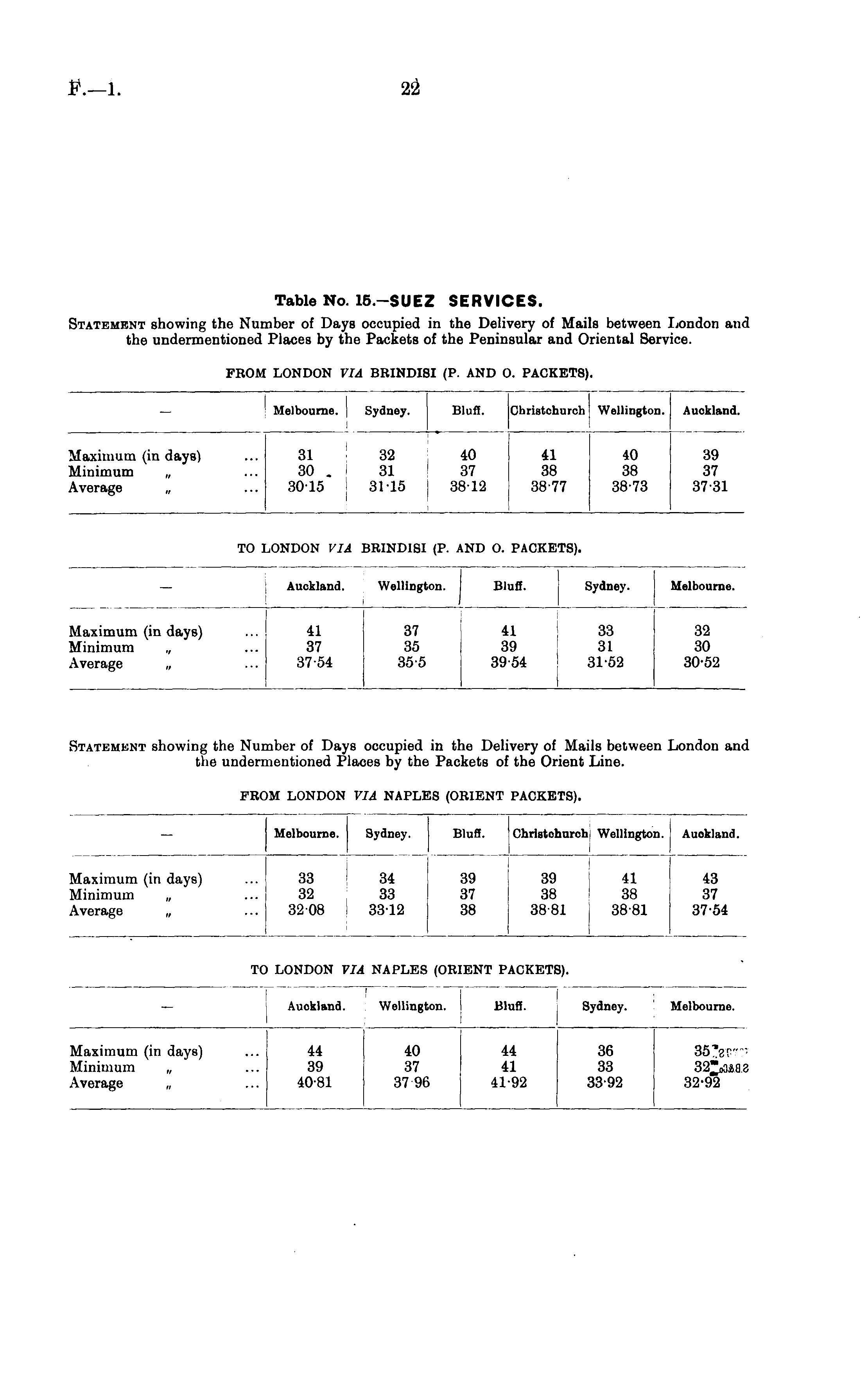 FRi Melbourne. Sydney. Bluff. Christchurch Wellington. Auckland. laximum (in days) linimum „ .verage 31 30 . 3015 32 31 31-15 40 37 38-12 41 38 3877 40 38 38-73 39 37 37-31 TO LONDON VIA BRINDI8I (P. AND O. PACKETS). Auckland. Wellington. I I Bluff. Sydney. Melbourne. laximum (in days) [inimum „ verage 41 37 37-54 37 35 35-5 41 39 39-54 33 31 31-52 32 30 30-52 Itatement showing the Number of Days occupied in the Delivery of Mails between London an the undermentioned Places by the Packets of the Orient Line. PROM LONDON VIA NAPLES (ORIENT PACKETS). Melbourne. Sydney. Bluff. Christchurch Wellington. Auokland. laximum (in days) linimum „ .verage 33 32 32 08 34 33 3312 39 37 38 39 38 38-81 41 38 38-81 43 37 37-54 TO LONDON VIA NAPLES (OR: ENT PACKET! I). I I Auckland. Wellington. Bluff. Sydney. Melbourne. Maximum (in days) Minimum „ Average „ 44 39 40-81 40 37 37 96 44 41 41-92 36 33 33-92 85...-" 322___a.8 32-92