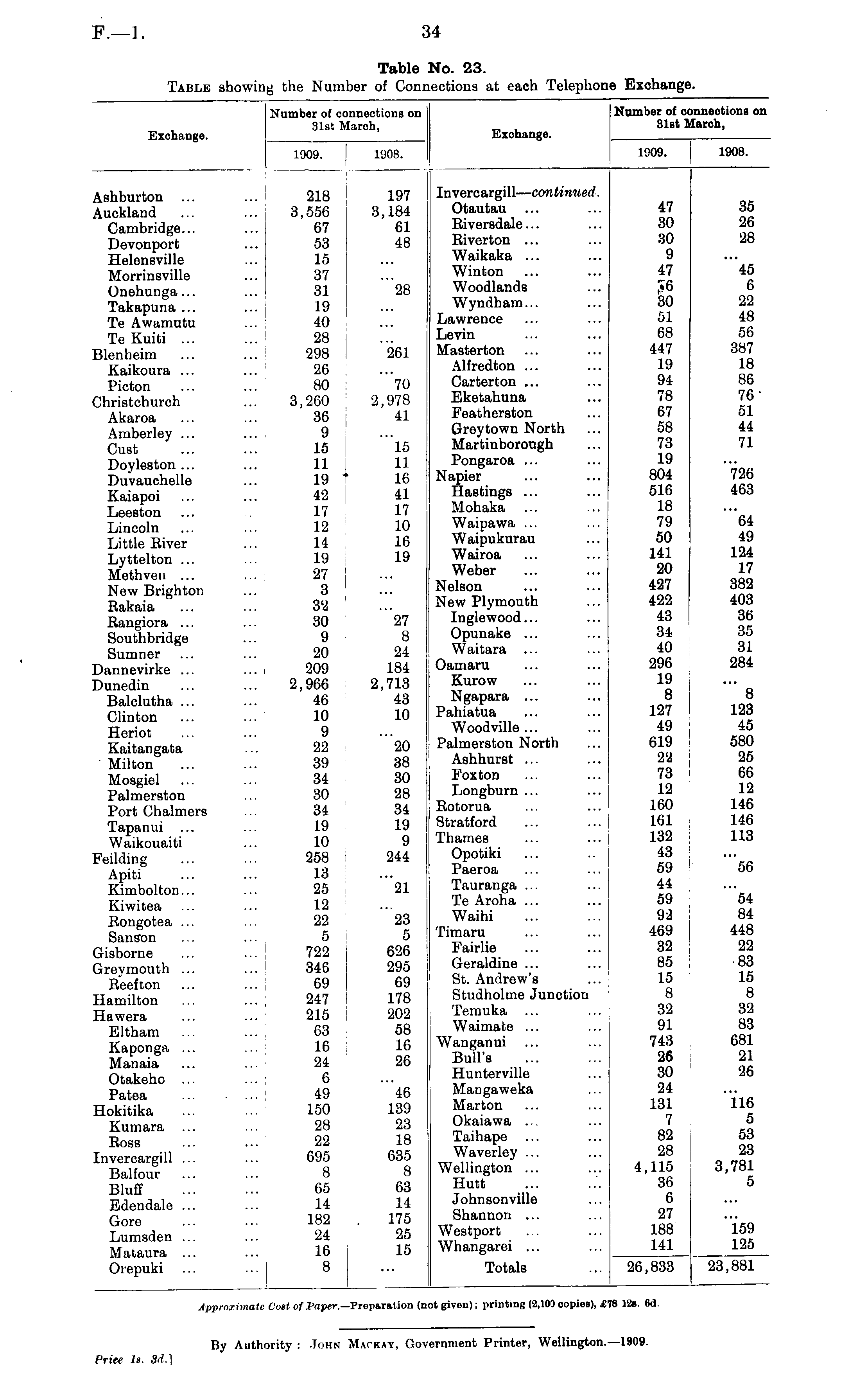 Number of connections on 31st March, Number of connections on 31st March, Exchange. Exchange. 1909. ! 1908. 1909. 1908. Ashbur ton Auckland Cambridge... Devonport Helensville Morrinsville Onehunga... Takapuna ... Te Awamutu Te Kuiti ... Blenheim Kaikoura ... Picton Christchurch Akaroa Amberley ... Cust Doyleston ... Duvauchelle Kaiapoi Leeston Lincoln Little River Lyttelton ... Methven ... New Brighton Rakaia Rangiora ... Southbridge Sumner Dannevirke ... Dunedin Balclutha ... Clinton Heriot Kaitangata Milton Mosgiel Palmerston Port Chalmers Tapanui ... Waikouaiti Feilding Apiti Kimbolton... Kiwitea Rongotea ... Sanson Gisborne Greymouth ... Reef ton Hamilton Hawera Eltham Kaponga ... Manaia Otakeho ... Patea Hokitika Kumara ... Ross Invercargill ... Balfour Bluff Edendale ... Gore Lumsden ... Mataura ... Orepuki ... ... ... I 218 3,55(1 67 53 15 37 31 19 40 28 298 26 80 3,260 36 9 15 11 19 42 17 12 14 19 27 3 32 30 9 20 209 2,966 46 10 9 22 39 34 30 34 19 10 258 13 25 12 22 5 722 346 69 247 215 63 16 24 6 49 150 28 22 695 8 65 14 182 24 16 8 197 3,184 61 48 '"28 "261 '"70 2,978 41 "l5 11 16 41 17 10 16 19 '"27 8 24 184 2,713 43 10 "*20 38 30 28 34 19 9 244 "21 "as 5 626 295 69 178 202 58 16 26 "46 139 23 18 635 8 63 14 175 25 15 Invercargill— continued. Otautau Riversdale... Riverton ... Waikaka ... Winton Woodlands Wyndham... Lawrence Levin Masterton Alfredton ... Carterton ... Eketahuna Featherston Grey town North Martinborough Pongaroa ... Napier Hastings ... Mohaka Waipawa ... Waipukurau Wairoa Weber Nelson New Plymouth Inglewood... Opunake ... Waitara ... 47 30 .30 9 47 .<; 30 51 68 447 19 94 78 67 58 73 19 804 516 18 79 50 141 20 427 422 43 34 40 296 19 8 127 49 619 22 73 12 160 161 132 43 59 44 59 92 469 32 85 15 8 32 91 743 26 30 24 131 7 82 28 4,115 36 6 27 188 141 35 26 28 "45 6 22 48 56 387 18 86 76' 51 44 71 726 463 "64 49 124 17 382 403 36 35 31 284 " 8 123 45 580 25 66 12 146 146 113 "56 "54 84 448 22 83 15 8 32 83 681 21 26 116 5 53 23 3,781 5 'l59 125 Oamaru Kurow Ngapara ... Pahiatua Woodville ... Palmerston North Ashhurst ... Foxton Longburn ... Rotorua Stratford Thames Opotiki Paeroa Tauranga ... Te Aroha ... Waihi Timaru Fairlie Geraldine ... St. Andrew's Studholme Junction Temuka Waimate ... Wanganui Bull's Hunterville Mangaweka Marton Okaiawa Taihape Waveriey ... Wellington ... Hutt Johnsonville Shannon ... Westport Whangarei ... Totals 26,833 23,881