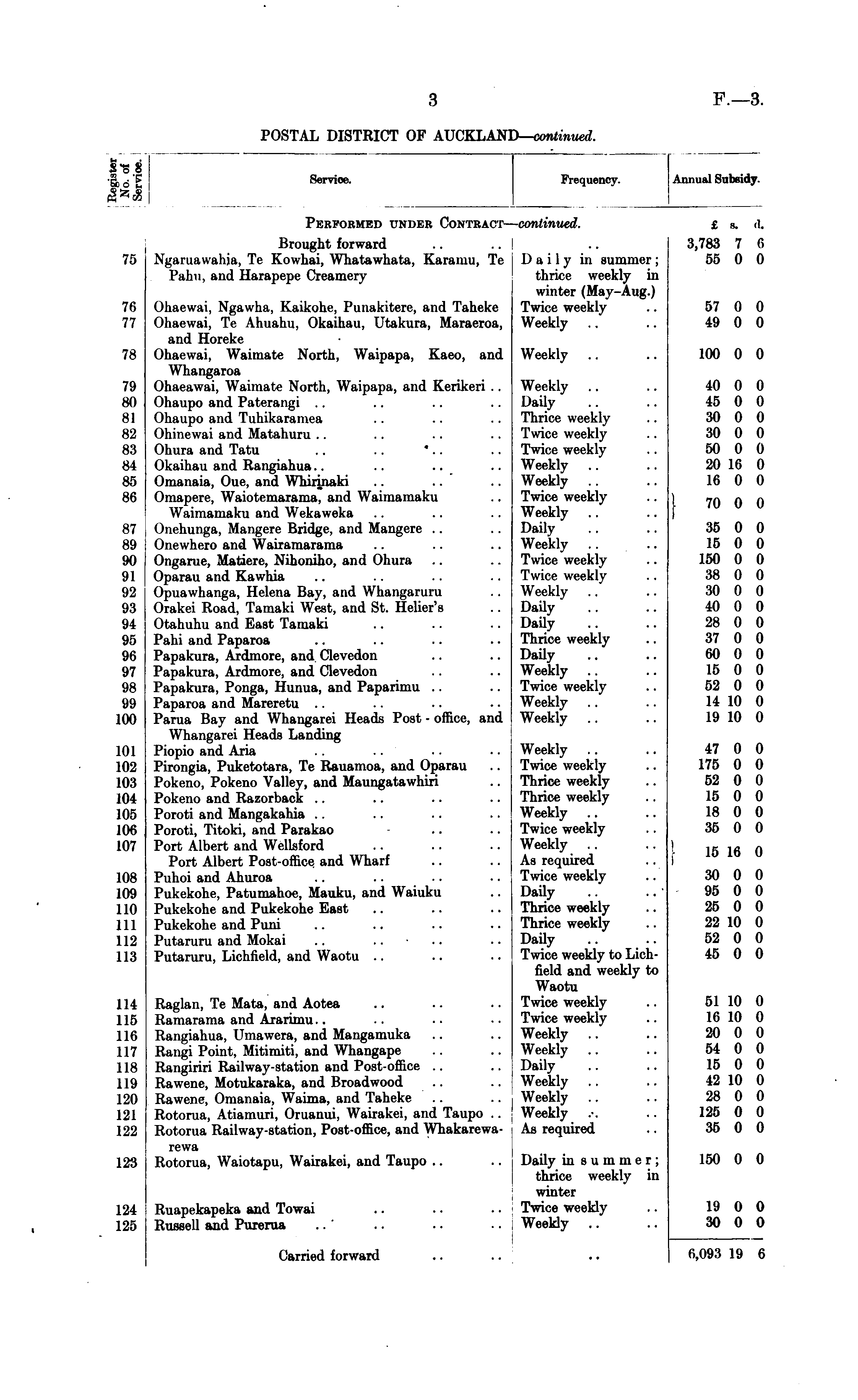 Hi en -r" •ad £ Service. Frequency. Annual Subsidy. Performed under Contract■continued. £ s. d. 75 75 Brought forward Ngaruawahia, Te Kowhai, Whatawhata, Karamu, Te Pahu, and Harapepe Creamery Daily in summer; thrice weekly in winter (May-Aug.) Twice weekly Weekly 3,783 7 6 55 0 0 76 77 78 79 80 81 82 83 84 85 86 87 89 90 91 92 93 94 95 96 97 98 99 100 101 102 103 104 105 106 107 108 109 110 111 112 113 76 77 Ohaewai, Ngawha, Kaikohe, Punakitere, and Taheke Ohaewai, Te Ahuahu, Okaihau, Utakura, Maraeroa, and Horeke Ohaewai, Waimate North, Waipapa, Kaeo, and Whangaroa Ohaeawai, Waimate North, Waipapa, and Kerikeri .. Ohaupo and Paterangi Ohaupo and Tuhikaramea Ohinewai and Matahuru Ohura and Tatu .. *.. Okaihau and Rangiahua Omanaia, Oue, and Whirinaki Omapere, Waiotemarama, and Waimamaku Waimamaku and Wekaweka Onehunga, Mangere Bridge, and Mangere Onewhero and Wairamarama Ongarue, Matiere, Nihoniho, and Ohura Oparau and Kawhia Opuawhanga, Helena Bay, and Whangaruru Orakei Road, Tamaki West, and St. Helier's Otahuhu and East Tamaki Pahi and Paparoa Papakura, Ardmore, and Clevedon Papakura, Ardmore, and Clevedon Papakura, Ponga, Hunua, and Paparimu Paparoa and Mareretu Parua Bay and Whangarei Heads Post - office, and Whangarei Heads Landing Piopio and Aria Pirongia, Puketotara, Te Rauamoa, and Oparau Pokeno, Pokeno Valley, and Maungatawhiri Pokeno and Razorback Poroti and Mangakahia Poroti, Titoki, and Parakao Port Albert and Wellsford Port Albert Post-office and Wharf Puhoi and Ahuroa Pukekohe, Patumahoe, Mauku, and Waiuku Pukekohe and Pukekohe East Pukekohe and Puni Putaruru and Mokai Putaruru, Lichfield, and Waotu 57 0 0 49 0 0 78 Weekly 100 0 0 79 80 81 82 83 84 85 86 Weekly Daily Thrice weekly Twice weekly Twice weekly Weekly Weekly Twice weekly Weekly Daily Weekly Twice weekly Twice weekly Weekly Daily Daily Thrice weekly Daily Weekly Twice weekly Weekly Weekly 40 0 0 45 0 0 30 0 0 30 0 0 50 0 0 20 16 0 16 0 0 : 70 0 0 87 89 90 91 92 93 94 95 96 97 98 99 100 35 0 0 15 0 0 150 0 0 38 0 0 30 0 0 40 0 0 28 0 0 37 0 0 60 0 0 15 0 0 52 0 0 14 10 0 19 10 0 101 102 103 104 105 106 107 Weekly Twice weekly Thrice weekly Thrice weekly Weekly Twice weekly Weekly As required Twice weekly Daily Thrice weekly Thrice weekly Daily Twice weekly to Lichfield and weekly to Waotu Twice weekly Twice weekly Weekly Weekly Daily Weekly Weekly Weekly As required 47 0 0 175 0 0 52 0 0 15 0 0 18 0 0 35 0 0 i 15 16 0 108 109 110 111 112 113 30 0 0 95 0 0 25 0 0 22 10 0 52 0 0 45 0 0 114 115 116 117 118 119 120 121 122 114 115 116 117 118 119 120 121 122 Raglan, Te Mata, and Aotea Ramarama and Ararimu Rangiahua, Umawera, and Mangamuka Rangi Point, Mitimiti, and Whangape Rangiriri Railway-station and Post-office Rawene, Motukaraka, and Broadwood Rawene, Omanaia, Waima, and Taheke Rotoma, Atiamuri, Oruanui, Wairakei, and Taupo .. Rotorua Railway-station, Post-office, and Whakarewa51 10 0 16 10 0 20 0 0 54 0 0 15 0 0 42 10 0 28 0 0 125 0 0 35 0 0 123 123 rewa Rotorua, Waiotapu, Wairakei, and Taupo Daily in summer; thrice weekly in winter Twice weekly Weekly 150 0 0 124 125 124 125 Ruapekapeka and Towai Russell and Purerua 19 0 0 30 0 0 Carried forward 6,093 19 6