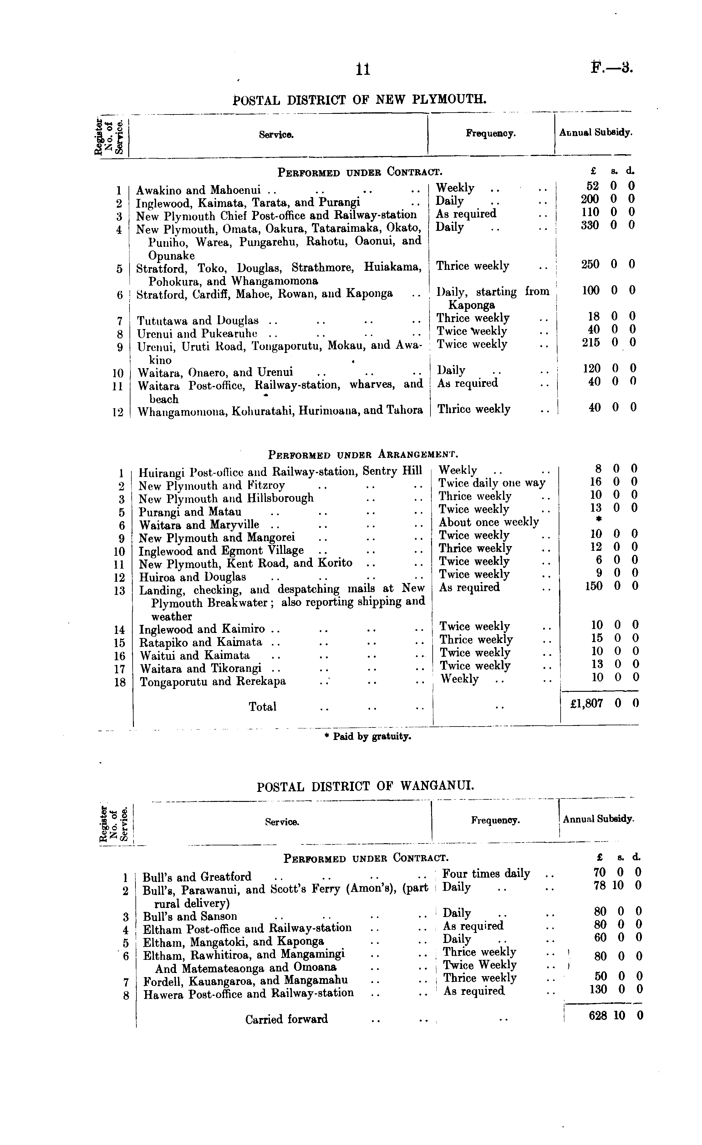 I"S 8 X '■ x Servioe. Frequenoy. Ann Annual Subsidy. nual Subsidy. Performed under Contract. £ s. d. 1 2 Bull's and Greatford .. • • • ■ Four times daily Bull's, Parawanui, and Scott's Ferry (Anion's), (part Daily rural delivery) Bull's and Sanson .. .. • • • • Daily .. Eltham Post-office and Railway-station .. .. As required Eltham, Mangatoki, and Kaponga .. • ■ Daily Eltham, Rawhitiroa, and Mangamingi .. .. Thrice weekly And Matemateaonga and Omoana .. .. Twice Weekly Fordell, Kauangaroa, and Mangamahu .. .. Thrice weekly Hawera Post-office and Railway-station .. .. As required . . I 70 0 0 78 10 0 80 0 0 80 0 0 60 0 0 80 0 0 50 0 0 130 0 0 3 4 5 6 7 8 Carried forward 628 10 0
