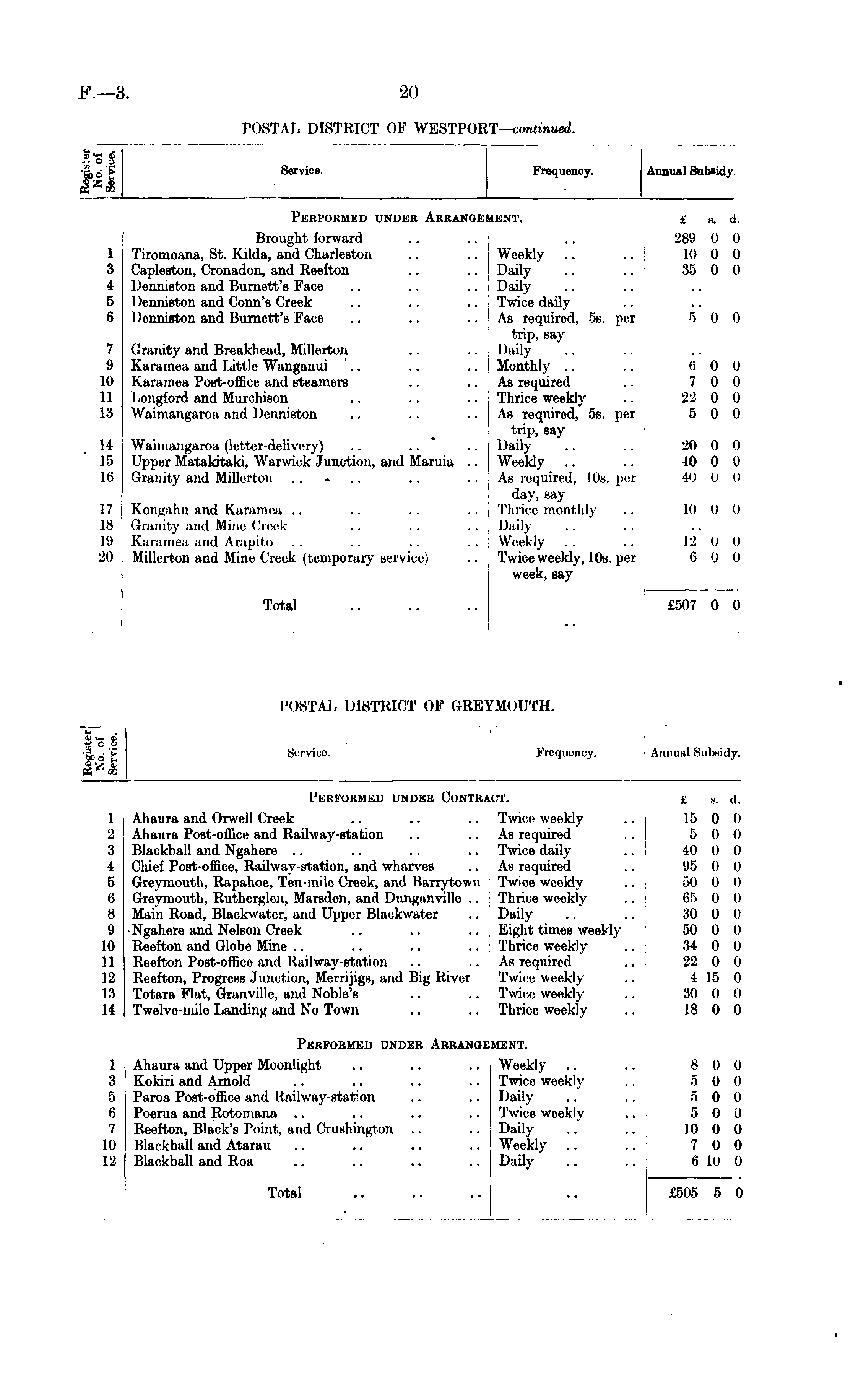 Ll '5)6 £ Service. Frequenoy. Annual Subsidy Performed under Arrange [ENT. £ s. d. 1 3 4 5 6 Brought forward Tiromoana, St. Kilda, and Charleston Capleston, Cronadon, and Reefton Denniston and Burnett's Face Denniston and Conn's Creek Denniston and Burnett's Face Weekly Daily Daily Twice daily As required, 5s. per trip, say Daily Monthly .. As required Thrice weekly As required, 5s. per trip, say Daily Weekly As required, 10s. per day, say Thrice monthly Daily Weekly Twice weekly, 10s. per week, say 289 () 10 0 35 0 5 0 6 0 7 0 22 0 5 0 20 0 10 0 40 0 10 0 12 0 6 0 0 0 0 0 0 0 0 0 0 0 o 0 0 0 7 9 10 11 13 Granity and Breakhead, Millerton Karamea and Little Wanganui Karamea Post-office and steamers Longford and Murchison Waimangaroa and Denniston 14 15 16 Waimangaroa (letter-delivery) Upper Matakitaki, Warwick Junction, and Maruia .. Granity and Millerton .. ... 17 is 19 20 Kongahu and Karamea .. Granity and Mine Creek Karamea and Arapito Millerton and Mine Creek (temporary sen ice) Total £607 0 o