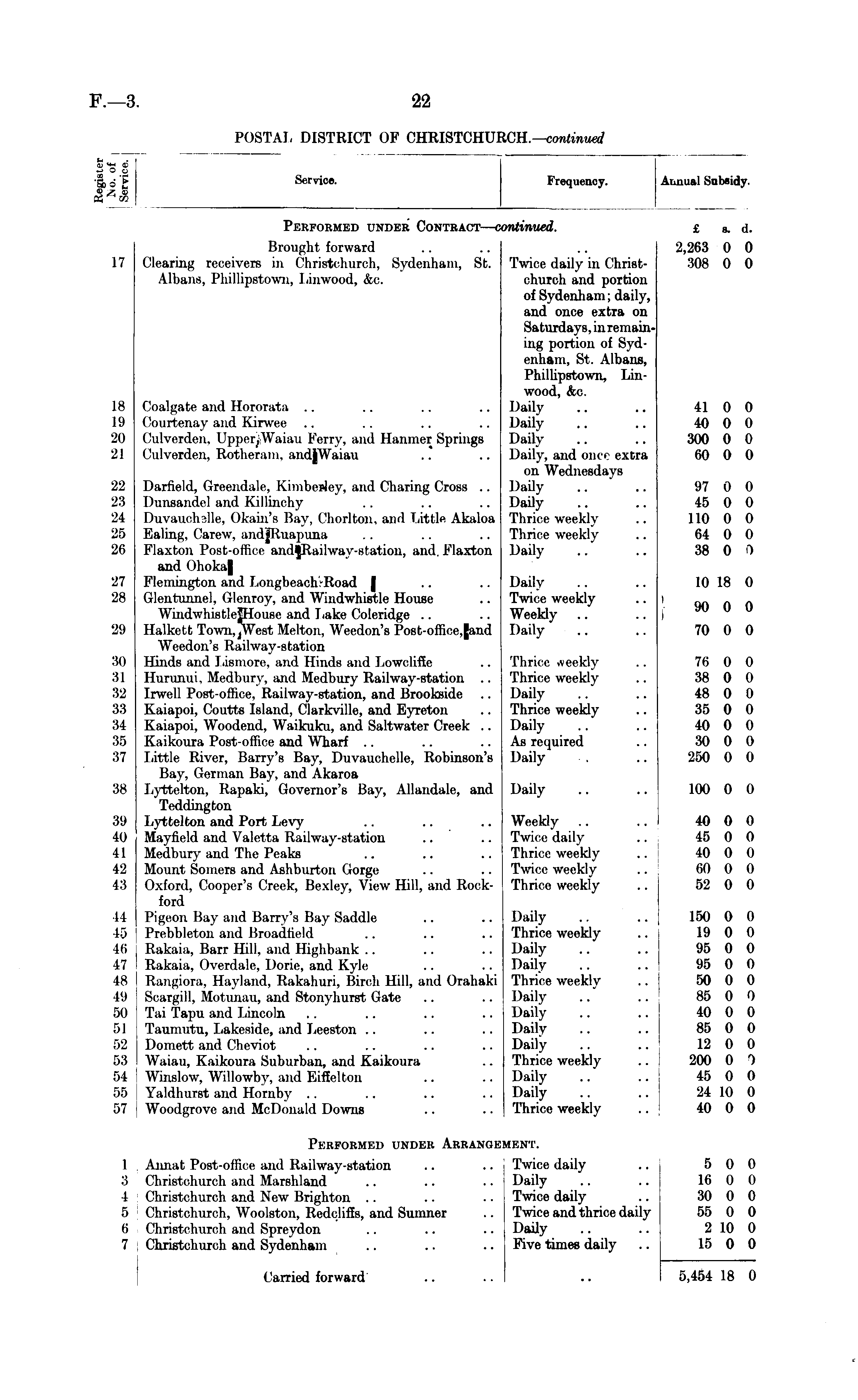 •3>o £ Service. Frequency. Annual Subsidy. Performed under Contract — a ntinued. £ s. d. 17 Brought forward 7 Clearing receivers in Christchurch, Sydenham, St. Albans, Phillipstown, Linwood, &c. Twice daily in Christchurch and portion of Sydenham; daily, and once extra on Saturdays, in remaining portion of Sydenham, St. Albans, Phillipstown, Linwood, &c. Daily Dairy Daily Daily, and once extra on Wednesdays Daily Daily Thrice weekly Thrice weekly Daily 2,263 0 0 308 0 0 is ID 20 21 3 Coalgate and Hororata .. 9 Courtenay and Kirwee 0 Culverden, Upper, Waiau Ferry, and Hanmer Springs 1 Culverden, Rotherani. andfWaiau 41 0 0 40 0 0 300 0 0 60 0 0 22 83 21 86 26 2 Darfield, Greendale, Kimbesley, and Charing Cross .. 3 Dunsandel and Killinchy 4 Duvauchslle, Okain's Bay, Chorlton, and Tattle Akaloa 5 Ealing, Carew, andjRuapuna 6 Flaxton Post-office and|Railway-station, and. Flaxton and OhokaJ 7 Flemington and Longbeach.-Road | 8 Glentunnel, Glenroy, and Windwhistle House WindwhistleJHouse and Lake Coleridge .. 9 Halkett Town,jWest Melton, Weedon's Post-offioe,{and Weedon's Railway-station 0 Hinds and Lismore, and Hinds and Lowcliffe 1 Hurunui, Medbury, and Medbury Railway-station .. 2 Irwell Post-office, Railway-station, and Brookside 3 Kaiapoi, Courts Island, Clarkville, and Eyreton 4 Kaiapoi, Woodend, Waikuku, and Saltwater Creek .. 5 Kaikoura Post-office and Wharf 7 Little River, Barry's Bay, Duvauchelle, Robinson's Bay, German Bay, and Akaroa 8 Lyttelton, Rapaki, Governor's Bay, Allandale, and Teddington 9 Lyttelton and Port Levy 0 Mayfield and Valetta Railway-station 1 Medbury and The Peaks 2 Mount Somers and Ashburton Gorge 3 Oxford, Cooper's Creek, Bexley, View Hill, and Rockford 4 Pigeon Bay and Barry's Bay Saddle 6 1'i'ebbleton and Broadfield 6 Rakaia, Barr Hill, and Highbank 7 Rakaia, Overdale, Doric, and Kyle 8 Rangiora, Hayland, Rakahuri, Birch Hill, and Orahaki 9 Scargill, Motunau, and Stonyhurst Gate 0 Tai Tapu and Lincoln 1 Taumutu, Lakeside, and Leeston 2 Domett and Cheviot 3 Waiau, Kaikoura Suburban, and Kaikoura I Winslow, Willowby, and Eiffelton 5 Yaldhurst and Hornby .. 7 | Woodgrove and McDonald Downs 97 0 0 45 0 0 110 0 0 64 0 0 38 0 o 27 88 Daily Twice weekly Weekly Daily 10 18 0 i i 90 0 0 89 70 0 0 30 31 38 38 34 36 37 Thrice weekly Thrice weekly Daily Thrice weekly Daily As required Daily 76 0 0 38 0 0 48 0 0 35 0 0 40 0 0 30 0 0 250 0 0 38 Daily 100 0 0 39 lo II 12 43 Weekly Twice daily Thrice weekly Twice weekly Thrice weekly 40 0 0 45 0 0 40 0 0 60 0 0 52 0 0 11 15 16 17 IS 49 60 51 68 63 64 66 57 Daily Thrice weekly Daily Daily Thrice weekly Daily Daily Daily Daily Thrice weekly Daily Daily Thrice weekly 150 0 0 19 0 0 95 0 0 95 0 0 50 0 0 85 0 0 40 0 0 85 0 0 12 0 0 200 0 0 45 0 0 24 10 0 40 0 0 Performed under Arrange ient. 5 0 0 16 0 0 30 0 0 55 0 0 2 10 0 15 0 0 I Annat Post-office and Railway-station 3 Christchurch and Marshland 4 Christchurch and New Brighton 5 Christchurch, Woolston, Redcliffs, and Sumner 6 Christchurch and Spreydon 7 Christchurch and Sydenham Twice daily Daily Twice daily Twice and thrice daily Daily Five times daily Carried forward 5,454 18