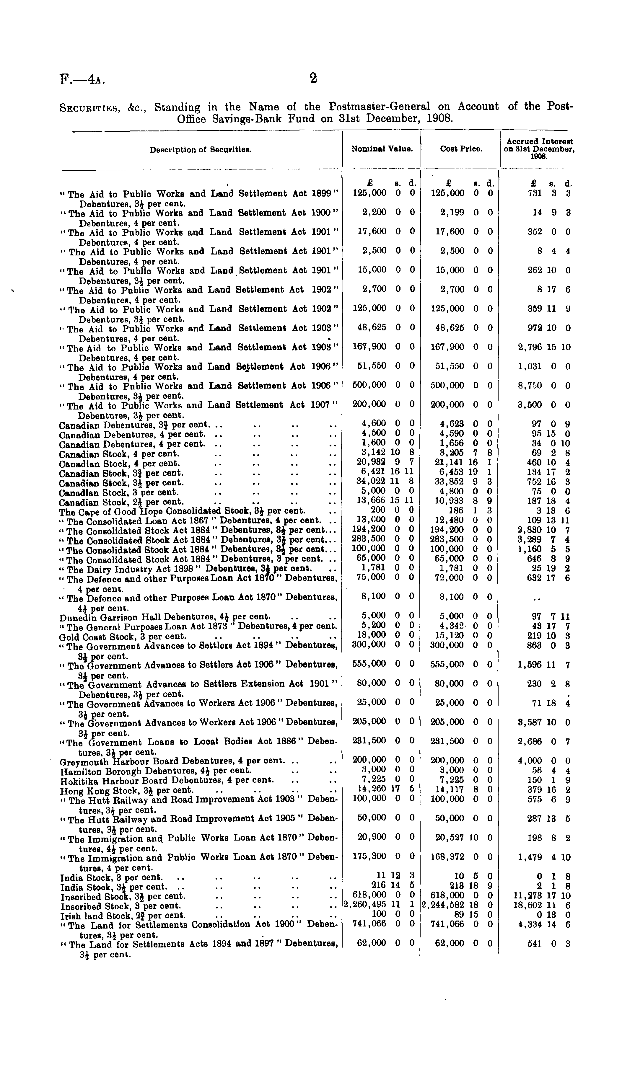 Description of Securities. Nominal Value. CoBt Price. Accrued Interest on 3] st December, 1908. " The Aid to Publio Works and Land Settlement Aot 1899" Debentures, 34 per cent. "The Aid to Public Works and Land Settlement Aot 1900" Debentures, 4 per cent. " The Aid to Publio Works and Land Settlement Aot 1901 " Debentures, 4 per cent. "The Aid to Public Works and Land Settlement Act 1901" Debentures, 4 per cent. "The Aid to Public Works and Land Settlement Act 1901" Debentures, 34 per cent. " The Aid to Publio Works and Land Settlement Act 1902 " Debentures, 4 per cent. "The Aid to Public Works and Land Settlement Act 1902" Debentures, 34 per cent. "The Aid to Public Works and Land Settlement Aot 1903" Debentures, 4 per oent. " The Aid to Public Works and Land Settlement Act 1903" Debentures, 4 per cent. "The Aid to Publio Works and Land Settlement Act 1906" Debentures, 4 per cent. "The Aid to Public Works and Land Settlement Aot 1906" Debentures, 34 per oent. "The Aid to Public Works and Land Settlement Aot 1907" Debentures, 34 per oent. Canadian Debentures, 3j per cent. Canadian Debentures, 4 per cent. .. Canadian Debentures, 4 per oent. Canadian Stook, 4 per cent. Canadian Stock, 4 per cent. Canadian Stock, 3} per cent. Canadian Stock, 34 per cent. Canadian Stook, 3 per oent. Canadian Stook, 24 per cent. The Cape of Good Hope Consolidated Stook, 34 per cent. " The Consolidated Loan Act 1867 " Debentures, 4 per oent. .. " The Consolidated Stock Aot 1884 " Debentures, 34 per cent... " The Consolidated Stock Act 1884 " Debentures, 34 per cent... " The Consolidated Stock Act 1884 " Debentures, 3| per cent... " The Consolidated Stock Act 1884 " Debentures, 3 per cent. .. " The Dairy Industry Act 1898 " Debentures, 34 per oent. " The Defence and other Purposes Loan Act 1870 " Debentures, 4 per cent. " The Defence and other Purposes Loan Act 1870" Debentures, 44 per cent. Dunedin Garrison Hall Debentures, 44 per cent. " The General Purposes Loan Act 1873 " Debentures, 4 per oent. Gold Coast Stock, 3 per cent. "The Government Advances to Settlers Act 1894 " Debentures, 34 per cent. " The Government Advanoes to Settlers Aot 1906 " Debentures, 34 per cent. "The Government Advances to Settlers Extension Aot 1901 " Debentures, 34 per cent. " The Government Advances to Workers Act 1906 " Debentures, 34 per cent. " The Government Advances to Workers Aot 1906 " Debentures, 34 per oent. "The Government Loans to Looal Bodies Aot 1886" Debentures, 34 per oent. Greymouth Harbour Board Debentures, 4 per cent. .. Hamilton Borough Debentures, 44 per cent. Hokitika Harbour Board Debentures, 4 per cent. Hong Kong Stock, 34 per cent. " The Hutt Railway and Road Improvement Act 1903 " Debentures, 34 per cent. " The Hutt Railway and Road Improvement Act 1905 " Debentures, 34 per cent. "The Immigration and Public Works Loan Act 1870" Debentures, 44 per cent. "The Immigration and Public Works Loan Act 1870 " Debentures, 4 per cent. India Stock, 3 per cent. India Stook, 3* per cent. Inscribed Stock, 34 per cent. Inscribed Stock, 3 per cent. Irish land Stook, 2J per oent. " The Land for Settlements Consolidation Act 1900 " Debentures, 34 per oent. " The Land for Settlements Acts 1894 and 1897 " Debentures, 34 per cent. £ s. d. 125,000 0 0 £ 8. d. 125,000 0 0 £ s. d. 731 3 3 2,200 0 0 2,199 0 0 14 9 3 17,600 0 0 17,600 0 0 352 0 0 2,500 0 0 2,500 0 0 8 4 4 15,000 0 0 15,000 0 0 262 10 0 2,700 0 0 2,700 0 0 8 17 6 125,000 0 0 125,000 0 0 359 11 9 48,625 0 0 48,625 0 0 972 10 0 167,900 0 0 167,900 0 0 2,796 15 10 51,550 0 0 51,550 0 0 1,031 0 0 500,000 0 0 500,000 0 0 8,750 0 0 200,000 0 0 200,000 0 0 3,500 0 0 4,600 0 0 4,500 0 0 1,600 0 0 3,142 10 8 20,932 9 7 6,421 16 11 34,022 11 8 5,000 0 0 13,666 15 11 200 0 0 13,000 0 0 194,200 0 0 283,500 0 0 100,000 0 0 65,000 0 0 1,781 0 0 75,000 0 0 4,623 0 0 4,590 0 0 1,656 0 0 3,205 7 8 21,141 16 1 6,453 19 1 33,852 9 3 4,800 0 0 10,933 8 9 186 1 3 12,480 0 0 194,200 0 0 283,500 0 0 100,000 0 0 65,000 0 0 1,781 0 0 72,000 0 0 97 0 9 95 15 0 34 0 10 69 2 8 460 10 4 134 17 2 752 16 3 75 0 0 187 18 4 3 13 6 109 13 11 2,830 10 7 3,289 7 4 1,160 5 5 646 8 9 25 19 2 632 17 6 8,100 0 0 8,100 0 0 5,000 0 0 5,200 0 0 18,000 0 0 300,000 0 0 5,000 0 0 4,342- 0 0 15,120 0 0 300,000 0 0 97 7 11 43 17 7 219 10 3 863 0 3 555,000 0 0 555,000 0 0 1,596 11 7 80,000 0 0 80,000 0 0 230 2 8 25,000 0 0 25,000 0 0 71 18 4 205,000 0 0 205,000 0 0 3,587 10 0 231,500 0 0 231,500 0 0 2,686 0 7 200,000 0 0 3,000 0 0 7,225 0 0 14,260 17 5 100,000 0 0 200,000 0 0 3,000 0 0 7,225 0 0 14,117 8 0 100,000 0 0 4,000 0 0 56 4 4 150 1 9 379 16 2 575 6 9 50,000 0 0 50,000 0 0 287 13 5 20,900 0 0 20,527 10 0 198 8 2 175,300 0 0 168,372 0 0 1,479 4 10 11 12 3 216 14 5 618,000 0 0 2,260,495 11 1 100 0 0 741,066 0 0 10 5 0 213 18 9 618,000 0 0 2,244,582 18 0 89 15 0 741,066 0 0 0 18 2 18 11,273 17 10 18,602 11 6 0 13 0 4,334 14 6 62,000 0 0 62,000 0 0 541 0 3