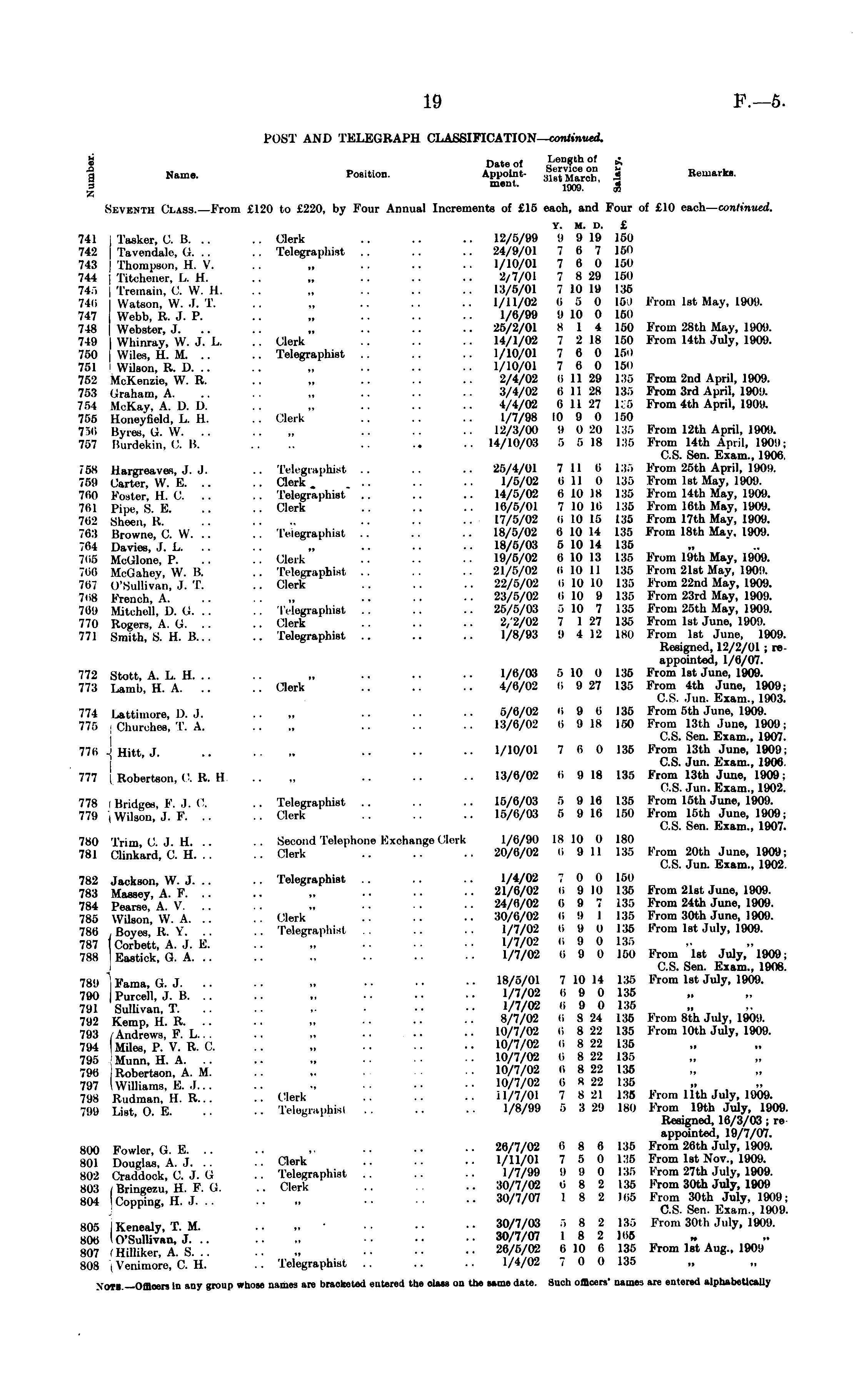 POST AND TELEGRAPH CLASSIFICATION— continued. 8 Date of length of £ | Name. Position. Appoint- guj m 0 * Remarks. | meD< - 1909. ' tg Skventh Class.—From £120 to £220, by Four Annual Increments of £15 each, and Four of £10 each— continued. Y. M. D. £ 741 | Tasker, C. B. .. .. Clerk .. .. .. 12/5/99 9 919 150 742 j Tavendale, G. .. . . Telegraphist .. .. .. 24/9/01 76 7 150 743 | Thompson, H. V. .. „ .. .. .. 1/10/01 7 6 0 150 744 I Titchener, L. H. .. „ .. .. .. 2/7/01 7 829 150 745 | Tremain, C. W. 11. .. „ .. .. .. 13/5/01 710 19 135 740 Watson W. J. T. „ .. .. .. 1/11/02 0 5 0 169 From Ist May, 1909. 747 Webb, R. J. P. .. „ .. • • 1/6/99 910 0 150 748 Webster, J. .. .. „ .. .. .. 25/2/01 8 1 4 150 From 28th May, 1909. 749 Whinray, W. J. L. .. Clerk .. .. .. 14/1/02 7 218 150 From 14th July, 1909. 750 Wiles, H. M. .. .. Telegraphist .. .. .. 1/10/01 7 6 0 160 751 I Wilson, R. D. .. .. „ .. .. 1/10/01 7 6 0 15" 752 McKenzie, W. R. .. „ .. .. .. 2/4/02 0 1129 136 From 2nd April, 1909. 753 t.raham, A. .. .. „ .. •• •• 3/4/02 6 1128 186 From 3rd April, 1909. 751 McKay, A D.I). .. „ .. .. •• 4/4/02 6 1127 L's From 4th April, 1909. 755 Honeyfield, L. H. .. Clerk 1/7/98 10 9 0 150 750 Hyres GW. .. .. .. •• •• 12/3/00 9 020 136 From 12th April, 1909. 757 Burdekin C. B .... .. .. .. 14/10/03 5 518 135 From 14th April, 1909; C.S. Sen. Exam., 1906. 788 Hargreaves, J. .1. Telegraphist .. .. .. 25/4/01 711 6 136 From 25th April, 1909. 759 Carter, W. E. .. .. Clerk .. .. .. 1/5/02 011 O 1.15 From Ist May, 1909. 760 Foster, H. C. .. .. Telegraphist* .. .. .. 14/5/02 610 18 135 From 14th May, 1909. 761 Pipe SE. .. •• Clerk .. .. .. 16/5/01 710 10 135 From 16th May, 1909. 702 Sheen R .... .. •- •• 17/5/02 010 15 135 From 17th May, 1909. 703 Browne, C. W. .. .. Telegraphist .. .. .. 18/5/02 610 14 135 From 18th May. 1909. 704 Davies, .]. L. .. .. „ .. • ■ • • 18/5/03 510 14 135 106 M.-Glone, P. .. .. Clerk .. .. .. 19/5/02 010 13 135 From 19th May, 1909. 760 M.Cahev, W. B. .. Telegraphist .. .. .. 21/5/02 010 11 135 From 21st May, 1909. 707 O'Sullivan, J. T. .. Clerk .. .. .. 22/5/02 010 10 135 From 22nd May, 1909. 768 French, A. .. .. „ .. • • • • 23/5/02 010 9 135 From 23rd May, 1909. 709 Mitchell, D. G. . . Telegraphist .. .. .. 25/5/03 510 7 135 From 25th May, 1909. 770 Rogers, A. G. .. .. Clerk .. .. .. 2/2/02 7 127 135 From Ist June, 1909. 771 Smith, S. H. 8... .. Telegraphist .. .. .. 1/8/93 9 412 180 From Ist June, 1909. Resigned, 12/2/01 ; reappointed, 1/6/07. 772 Stott AL H . „ .. •• •• 1/6/03 510 0 136 From Ist June, 1909. 773 Lamb, H. A. .. .. Clerk .. .. .. 4/6/02 6 927 135 From 4th June, 1909; C.S. Jun. Exam., 1903. 774 Lattimore D.l .. .. •• •• 5/6/02 0 9 0 135 From sth June, 1909. 775 i Churches' T A „ .. •• 13/6/02 0 918 150 From 13th June, 1909; C.S. Sen. Exam., 1907. 776 J Hitt J .. .... .. •• ■• 1/10/01 7 6 0 136 From 13th June, 1909; C.S. Jun. Exam., 1906. 777 Robertson, C. R. H .. „ 13/6/02 6 918 135 From 13th June, 1909; C.S. Jun. Exam., 1902. 778 ißridires F.l. <'. .. Telegraphist .. .. .. 15/6/03 5 916 135 From 15th June, 1909. 779 (Wilson, J. F. .. .. Clerk .. .. .. 15/6/03 5 916 150 From 15th June, 1909; C.S. Sen. Exam., 1907. 780 Trim, C. J. H. .. .. Second Telephone Exchange Clerk 1/6/90 18 10 0 180 781 Clinkard. C. H. . .. Clerk .. .. .. 20/6/02 0 911 135 From 20th June, 1909; C.S. Jun. Exam., 1902. 782 Jackson, W. J. .. .. Telegraphist .. .. .. 1/4/02 7 0 0 150 783 Massev A F „ .. •• •• 21/6/02 o 910 135 From 21st June, 1909. 784 PearseA V ~ ■• 24/0/02 6 9 7 135 From 24th June, 1909. 785 Wilson WA. '.'. .. Clerk .. .. .. 30/0/02 0 9 I 135 From 30th June, 1909. 786 , Boves.'R. Y. .. .. Telegraphist .. •• 1/7/02 69 0 135 From Ist July, 1909. 787 Corbett, A. J. E 1/7/02 o 9 0 135 .. „ 788 Eastick, G. A , 1/7/02 0 9 0 150 From Ist July, 1909; C.S. Sen. Exam., 1908. 789 Faraa G J . „ •• •• •• 18/5/01 710 14 135 From Ist July, 1909. 790 | Purcell, j. B 1/7/02 0 9 0 135 791 Sullivan. T , 1/7/02 6 9 0 135 .. 792 Kemp H R . „ ■ • • • ■ • 8/7/02 0 824 135 From Bth July, 1909. 793 Andrews F L . „ • • • • • • 10/7/02 0 822 135 From 10th July, 1909. 794 Miles, P.V. R. C. .. „ 10/7/02 o 822 135 795 Munn, H. A 10/7/02 0 822 135 796 I Robertson, A. M. .. ~ ■• 10/7/02 0 822 135 797 I Williams, E. J 10/7/02 6 822 135 .. 798 Rodman, H. R Clerk il/7/01 7 821 135 From 11th July, 1909. 799 List O E .. Telenraphisl .. •• 1/8/99 5 329 180 From 19th July, 1909. Resigned, 16/3/03 ; re appointed, 19/7/07. 800 Fowler G E .. ~ •• •• •• 26/7/02 0 8 6 135 From 26th July, 1909. 801 Douglas, A. j. .'. .. Clerk 1/11/01 7 5 0 135 From Ist Nov., 1909. 802 Craddock, 0. J. G .. Telegraphist 1/7/99 9 9 0 135 From 27th July, 1909. 803 / Bringezu, H. F. G. .. Clerk 30/7/02 08 2 135 From 30th July, 1909 804 I Copping, H. J 30/7/07 1 8 2 105 From 30th July, 1909; FF 6 C.S. Sen. Exam., 1009. 805 iKenealv TM. ~ ■• •• 30/7/03 5 8 2 135 From 30th July, 1909. 806 I O'Sullivan, j" 30/7/07 I 8 2 105 807 (HiHiker, A. 8. .. .. „ •• •• •• 26/5/02 610 6 135 From Ist Aug., 1909 808 ( Venimore, C. H. Telegraphist .. .. .. 1/4/02 70 0 135 ,\ OTB—Officers in any group whose names are bracketed entered the class on the same date. Such officers' names are entered alphabetically