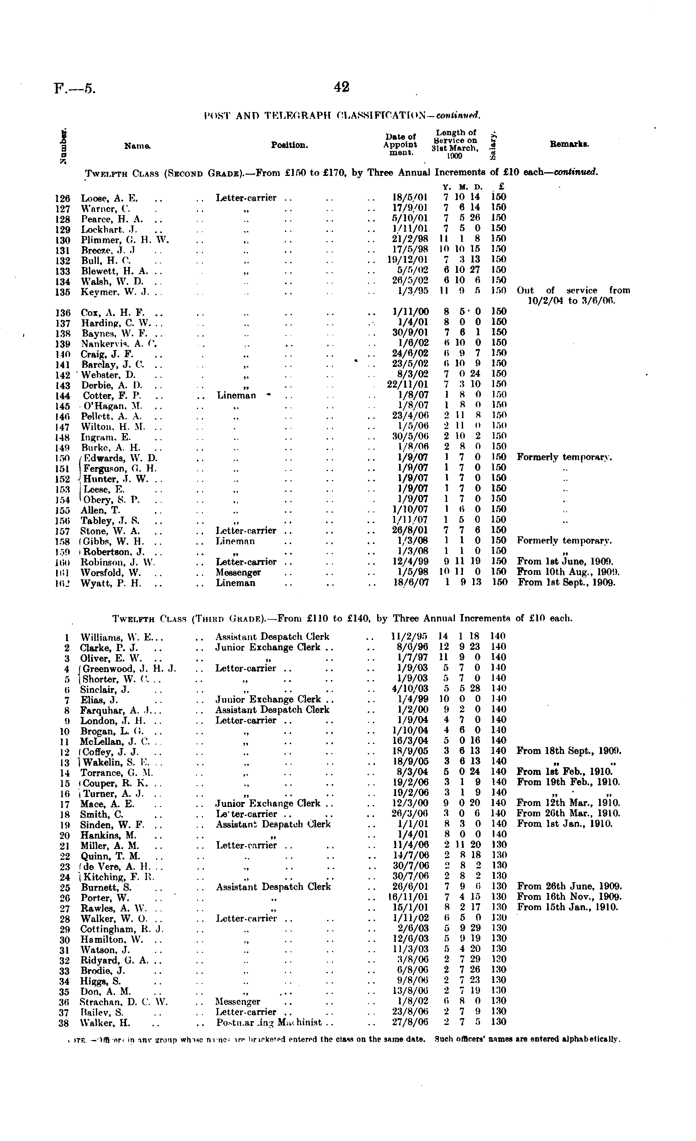 I'nsT AND TELEGRAPH CLASSIFICATION continued. S Date of Length of £ I Name. Position. Appoint 3 ",J March £ Remarks. o meut. xm ' = •/: Twelfth Class (Second Grade). —From £150 to £170, by Three Annual Increments of £10 each— continued. y. M. D. £ 126 Loose, A. E. .. Letter-carrier .. .. 18/5/01 710 14 160 127 Warner, C. .. „ .. .. 17/9/01 7 614 150 128 I'earec, H. A .. .. .. 5/10/01 7 526 150 129 Lookhart. J. .. .. .. •• •• l/11/oi 7 5 0 150 150 Plimmer, G. 11. XV. .. .. .. .. 21/2/98 11 I 8 150 131 Breeze. J. .1 .. .. .. 17/5/98 10 10 15 150 132 Bull, H. C. 19/12/01 7 313 150 133 Blewett. H. A. . . 5/5/02 610 27 150 134 Walsh, W. I). . .. 26/5/02 610 0 150 135 Kevmer. XV. J. .. .. 1/3/95 II 9 5 150 Out of service from 10/2/04 to 3/0/00. 130 Cox, A. H. F .. 1/11/00 8 5 0 150 137 Harding, C. W. . . 1/4/01 8 0 0 150 13s Baynea, W. F. .. . 30/9/01 7 6 1 150 139 N'ankervis. A. C . .. .. 1/6/02 010 0 150 llii Craig, J. F. .. ~ .. 24/0/02 0 9 7 150 111 Barclay, J. ('. .. ~ . . *. . 23/5/02 010 9 150 142 Webster, D. .. . „ .. 8/3/02 7 024 150 143 Dcrhie. A. I). .. „ .. 22/11/01 7 310 150 144 Cotter, F. P. .. .. Lineman - .. 1/8/07 1 8 0 160 145 ()*Hagan. M. .. .. .. .. 1/8/07 1 8 0 150 140 IVllctt. A. A. .. .. .. 23/4/00 2 11 R 160 147 Wilton. 11. M. .. . .. .. .. 1/5/00 2 II 0 160 148 Ingram, E. .. .. •• •• 80/6/06 210 2 160 I4C Burke. A 11. .. .. .. .. 1/8/06 2 8 0 150 160 (Edwards, W. D. .. .. 1/9/07 1 7 0 150 Formerly temporary. 161 'Ferguson, G. 11. .. .. .. 1/9/07 1 7 0 160 152 Hunter, J. W 1/9/07 1 7 0 150 153 Lease, E. .. .. .. ■• •• 1/9/07 1 7 0 150 151 lobery, 8. P. .. .. ■■ 1/9/07 1 7 0 150 155 Allen. T. .. .. 1/10/07 I 0 0 150 150 Tablev, J. 8. .. .. „ .. •• •• 1/11/07 1 6 0 150 157 Stone, W. A. .. .. Letter-carrier .. .. .. 26/8/01 7 7 6 150 108 [Gibbs, W. H. .. .. Lineman .. .. .. 1/3/08 1 1 0 150 Formerly temporary. 159 . Robertson. J. .. .. „ .. .. 1/3/08 1 1 0 150 100 Robinson. ,I. W. .. Letter-carrier .. .. .. 12/4/99 911 19 150 From Ist June, 1909. 101 Worsfold. W. .. .. Messenger .. .. 1/5/98 mil 0 150 From 10th Aug.. 1909. I6J Wyatl, P. H. .. .. Lineman .. .. .. 18/0/07 1 913 150 From Ist Sept.. 1909. Twelfth Cuss (Tnll:i. Ci.un:). From £110 to £140, by Three Annual Increments of £10 each. 1 Williams, W. F.... .. Assistant Despatch Clerk .. 11/2/95 14 118 140 2 Clarke, P. J. .. .. Junior Exchange Clerk .. .. 8/6/96 12 923 140 3 Oliver, E. W „ .. .. 1/7/97 11 9 0 140 4 (Greenwood, J. H. J. .. Letter-carrier .. .. .. 1/9/03 5 7 0 140 6 |Shorter, XV. C „ 1/9/03 6 7 0I K> 8 Sinclair, J .. •• .. 4/10/03 6 528 140 7 Elias, J. .. .. Junior Exchange Clerk .. .. 1/4/99 10 0 0 140 8 Farquhar, A. 1.. . .. Assistant Despatch Clerk .. 1/2/00 9 2 0 140 0 London, J. 11. .. .. Letter-carrier .. .. .. 1/9/04 4 7 0 140 10 Brogan, L. G. .. .. ~ .. .. .. 1/10/04 4 6 0 110 II McLellan, J. C. . . .. „ .. .. 16/3/04 6 016 140 12 I Coffey, J. J. .. .. .. .. .. 18/9/05 3 613 140 From 18th Sept., 1909. 13 iWakelin, S. I) ~ 18/9/05 3 613 140 14 Torrance, G. M. .. .. .. 8/3/04 5 024 140 From Ist Feb., 1910. 15 iCouper, R. K. .. ~ .. .. 19/2/06 3 1 9 140 From 19th Feb., 1910. 16 i Turner, A. J. . .. „ 19/2/06 3 1 9 110 „ ■ 17 Mace, A. E. .. .. Junior Exchange Clerk .. .. 12/3/00 9 020 140 From 12th Mar., 1910. 18 Smith, C. .. .. Le'ter-carrier .. .. .. 26/3/06 3 0 6 140 From 20th Mar., 1910. 10 Sinden, W. F. .. .. Assistant Despatch Clerk .. 1/1/01 8 3 0 140 From Ist Jan., 1910. 20 Hankins, M „ 1/4/01 8 0 0 140 21 Miller, A. M. .. .. Letter-carrier .. .. 11/4/00 211 20 130 22 Quinn, T. M 14/7/06 2 818 ISO 23 (de Vere, A. 11. . .. .. .. .. .. 30/7/06 2 8 2 130 24 (Kitching, F. 11. .. „ .. .. .. 30/7/06 2 8 2 130 25 Burnett, S. .. .. Assistant Despatch Clerk .. 26/6/01 7 9 0 130 From 26th June, 1909. 26 Porter, W. .. 16/11/01 7 415 13(1 From 16th Nov., 1909. 27 Rawles, A. W. „ .. 15/1/01 8 217 130 From 15th Jan., 1910. 28 Walker, XV. O. .. Letter .airier .. .. .. 1/11/02 0 5 0 130 29 Cottingham, H. .1. .. .. .. 2/6/03 5 929 130 30 Hamilton. W „ .. .. .. 12/6/03 5 919 130 31 Watson, J .. .. •• 11/8/03 5 420 130 32 Ridyard, G. A. .. .. .. .. 3/8/06 2 729 130 33 Brodie, J. .. .. .. .. .. 6/8/00 2 726 130 34 Higgs, S. .. .. 9/8/06 2 723 130 35 Don, A. M. .. .. .. .. 13/8/00 2 710 130 30 Strachan. D. C. W. .. Messenger .. .. .. 1/8/02 0 S 0 130 37 Bailey, S. .. .. Letter-carrier .. .. 23/8/00 2 7 9 130 38 Walker, H. .. .. Postmarin Machinist.. 27/8/06 2 7 5 130 , ,tk -eh t In in\- ■irimn w»i me -i me .re Uneke'ed entered the class on the s.ime date. Such offir-ers' names are entered alphabetically.