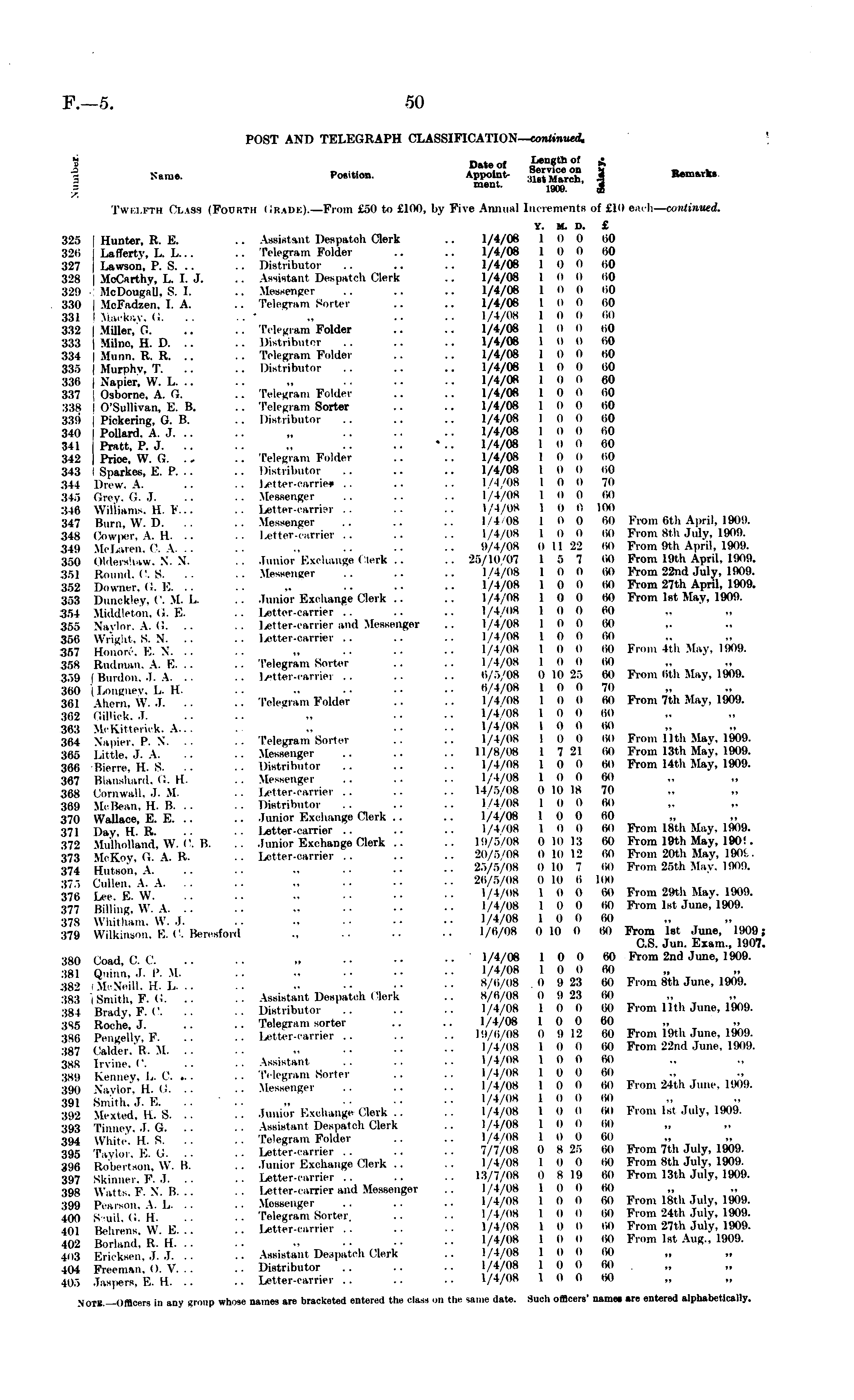 POST AND TELEGRAPH CLASSIFICATION— continued. ' Date of Length of £ | Narue. Position. Appoint- "Ij; 5 Remarks | ment - 1909. ' i Tw i i.itii Clam (Fouhtii Geadb). —From £50 to £100, by Five Annual Increments of £lo each — continued. Y. M. D. £ 325 | Hunter, R. E. .. Assistant Despatch Clerk .. 1/4/08 1 0 0 60 326 Laffertv, L. L... Telegram Folder .. .. 1/4/08 I 0 0 00 327 | Lawsori, P. S. .. .. Distributor .. .. .. 1/4/08 1 10 328 | McCarthy, L. I. J. .. Assistant Despatch Clerk .. 1/4/08 1 0 0 00 320 McDougal], 8. I. .. Messenger .. .. .. 1/4/08 1 0 0 00 330 | McFadzen. I. A. .. Telegram Sorter .. .. 1/4/08 I 0 0 00 331 rtackav, G. .. ~ .. ■• 1/4/ os 1 o 0 80 332 | Miller, 0. .. Telegram Folder .. .. 1/4/08 1 0 0 00 333 | Milne, H. D. .. .. Distributor .. .. .. 1/4/08 1 0 0 00 334 | Munn. R. R. .. .. Telegram Folder .. .. 1/4/08 I 0 0 00 335 | Murphy. T. .. .. Distributor .. .. .. 1/4/08 1 0 0 00 330 I Napier, W. L , 1/4/08 I 0 0 60 337 | Osborne, A. G. .. Telegram Folder .. .. 1/4/08 1 0 0 00 388 , O'Sullivan, E. B. .. Telegram Sorter .. .. 1/4/08 I 0 " 00 339 Pickering, G. B. .. Distributor .. .. .. 1/4/08 I (I () 00 340 I Pollard. A. J „ 1/4/08 I 0 o 00 341 I Pratt. P. J -• •• '■■ 1/4/08 1 0 0 60 342 | Price, W. G. .. .. Telegram Folder .. .. 1/4/08 1 0 0 00 343 Sparkes, E. P. .. .. Distributor .. .. .. 1/4/08 I 0 0 60 344 Drew. A. .. .. Utter-oarrie* .. .. .. 1/4/08 I 0 0 7o 346 Grey. (i. J. .. .. Messenger .. .. .. 1/4/ OS 1 o O 00 346 Williams, H-F... .. Letter-carrier .. .. .. 1/4/os l o 0 100 347 Burn W D. .. .. Messenger .. .. .. 1/408 1 0 0 00 From Ot Ii April, 1900. 348 Cowper, A. H. .. .. Utter-oarrier.. .. .. 1/4/08 1 o o 60 From Bth July, 1909. 849 McLaren. C. A. .. .. „ .. ■• •• 9/4/08 oil 22 60 From 9th April, 1909. 31 Idershaw, N. N. .. Junior Exchange Clerk .. .. 26/10/07 I 6 7 80 From 19th April, 1909. 351 Round, C. 8. .. .. Messenger .. •■ 1/4/08 1 0 o 60 From 22nd July, 1909. 352 Downer, G. E. .. •• ■• ■• •• •• 1/4/ os lo 0 80 From 27th April, 1909. 353 Dunckley, C. M. L .. Junior Exchange Clerk .. .. 1/4/08 1 0 0 60 From Ist May, 1909. 351 Middleton, G. E. .. Letter-carrier .. .. .. 1/4/08 I 0 0 60 355 Naylor A. G. .. .. Letter-carrier and Messenger .. 1/4/os 1o o 60 350 Wright, 8. N. .. .. Utter-oarrier .. .. .. 1/4/08 1 0 0 60 357 Honor.'-. E. N. .. .. „ •- ■• •• 1/4/ os 1 o 0 60 Prom 4th May, 1909. 358 Rodman. A. K. . . .. Telegram Sorter .. .. 1/4/08 I 0 0 60 359 . Hmdon. J. \. .. .. Utter-carrier .. .. .. 6/5/08 010 25 60 From Oth May, 1909. 360 Longney, L. H. .. 6/4/08 1 0 0 70 301 Shorn, W. J. .. ■• Telegram Folder .. .. 1/4/os 10 0 60 From 7th May, 1909. 362 Gilliok, .1 - •• •• 1/4/08 1 0 " "" 303 Mekitterirk. A .. •• •• 1/4/08 1 0 0 80 •104 Napier PN. .. Telegram Sorter .. .. 1/4/os 1o o 60 Prom 11th May, 1909. 365 Little, J. A Messenger 11/8/08 1 721 60 From 13th May. 1909. 366 Bierre, H. 8 Distributor 1/4/ os 1 0 0 80 From 14th May. 1909. 367 Blanshard, G. H. .. Messenger .. .. .. 1/4/08 I 0 0 60 368 Cornwall, J. M .. Letter-carrier .. -. .. 14/6/08 010 18 70 369 Mcßean, H. B. .. Distributor .. .. •• 1/4/08 1 0 0 60 370 Wallace, E. E. .. .. Junior Exchange Clerk .. .. 1/4/08 1 0 0 80 371 Daw H. R- -• .. Utter-oarrier .. •• •• 1/4/09 10 0 60 From 18th May, 1909. 372 Mulholland, W. C. B. .. Junior Exchange Clerk .. .. 19/6/08 oln 13 00 From 19th May, 190!. 373 McKoy, G. A.R. .. Letter-carrier 20/5/08 010 12 oo From 20th May, 1901. • t7 4 Hut-.... \ •• •• •• 25/5/ os 010 7 60 From 15th May, 1909. 375 Cullen A. A - - ,; "' " s "'" 8 I,HI •74 i ~,. |.- \v . .. .. .. .. 1/4/ OS 1 o 0 00 From 29th May. 1909. 377 Billing W A , •• •• 1/4/ os 1 0 0 60 From Ist June, 1909. 378 Whithara, W. .1. .. „ 1/4/08 I 0 0 80 379 Wilkinson, E. C. Beresford ~ 1/6/08 010 0 80 From Ist June. 1909; C.S. Jun. Exam., 1907. 380 Coad, C. C „ ' 1/4/08 1 0 0 60 From 2nd June, 1909. 381 O'linn r P M ~ •• •• •• 1/4/08 1 O 0 00 58" M-Nc-'ill. H. L. .. •• •• •• •• 8/6/08 .0 923 60 From Sth June, 1909. 383 Smith P. G. .. .. Assistant Despatch Clerk .. 8/6/08 09 23 60 384 Brady. F. C .. .. Distributor .. .- •• 1/4/08 10 0 60 From 11th June, 1909. 355 Roche. J. .. .. Telegram sorter .. .. 1/4/08 1 0 0 60 386 |Vi llv F Utter-oarrier 19/6/08 0 912 60 From 19th June. 1909. 387 Calch-r.H. M 1/4/08 1 0 0 80 From 22nd June, 1909. 388 Irvine, C. .. .. Assistant .. .. .- 1/4/ os 100 60 389 Kennev. L. ('. ... .. Telegram Sorter .. .. 1/4/08 1 o o 60 390 |!i av i 0I ; || c . Messenger 1/4/ os 1 0 0 80 Prom 84th June, 1909. 391 Smith, J. E. .... .. '/4 /iis I " " » 392 Mexted, H. 8. .. .. Junior Exchange- Clerk .. .. 1/4/08 1 0 0 60 From Ist July. Km hi. 393 Tiunew J. G. .. •• Assistant Despatch Clark .. 1/4/os 1 0 0 80 394 White II s. .. Telegram Folder .. .. 1/4/08 I 0 0 80 395 Taylor EG .. Letter-carrier .. .. .. 7/7/08 08 26 60 From 7th July, 1909. 396 Robertson. W. B. .. Junior Exchange Clerk .. •• 1/4/os 1o <> oo From Bth July, 1909. 397 Skinner. F. J Letter-carrier 13/7/08. 0 819 80 From 13th Jury, 1909. 398 Watts VNB. .. .. Letter-carrier and Messenger .. 1/4/os Io o 80 „ 399 Pears,,',, \ L. . .. Messenger 1/4/08 1 0 0 60 From 18th July, 1909. 400 s„,l(.'i| .. Telegram Soil.-, .. .. 1/4/ OS I (I 0 60 From 24th July. 1009. 4oi Behrena W E . .. Letter-carrier .. .. •• 1/4/08 I 0 0 60 From 27th July, 1909. 402 Borland. X- II '/4/«« 1 0 0 80 From Ist Aug., 1909. 4o:j Erioksen, J. J. .. •• Assistant Despatch Clark .. 1/4/08 1 o o 60 40-1 Freeman, O. V. .. •• Distributor .. .. .. 1/4/08 1 0 0 60 405 Jaspers, E. H. .. ~ Letter-carrier .. .. .. 1/4/os l o o 80 NOTE.—Officers in any group whose names are bracketed entered the clue ,ml he tame date. Such officers' names are entered alphabetically.