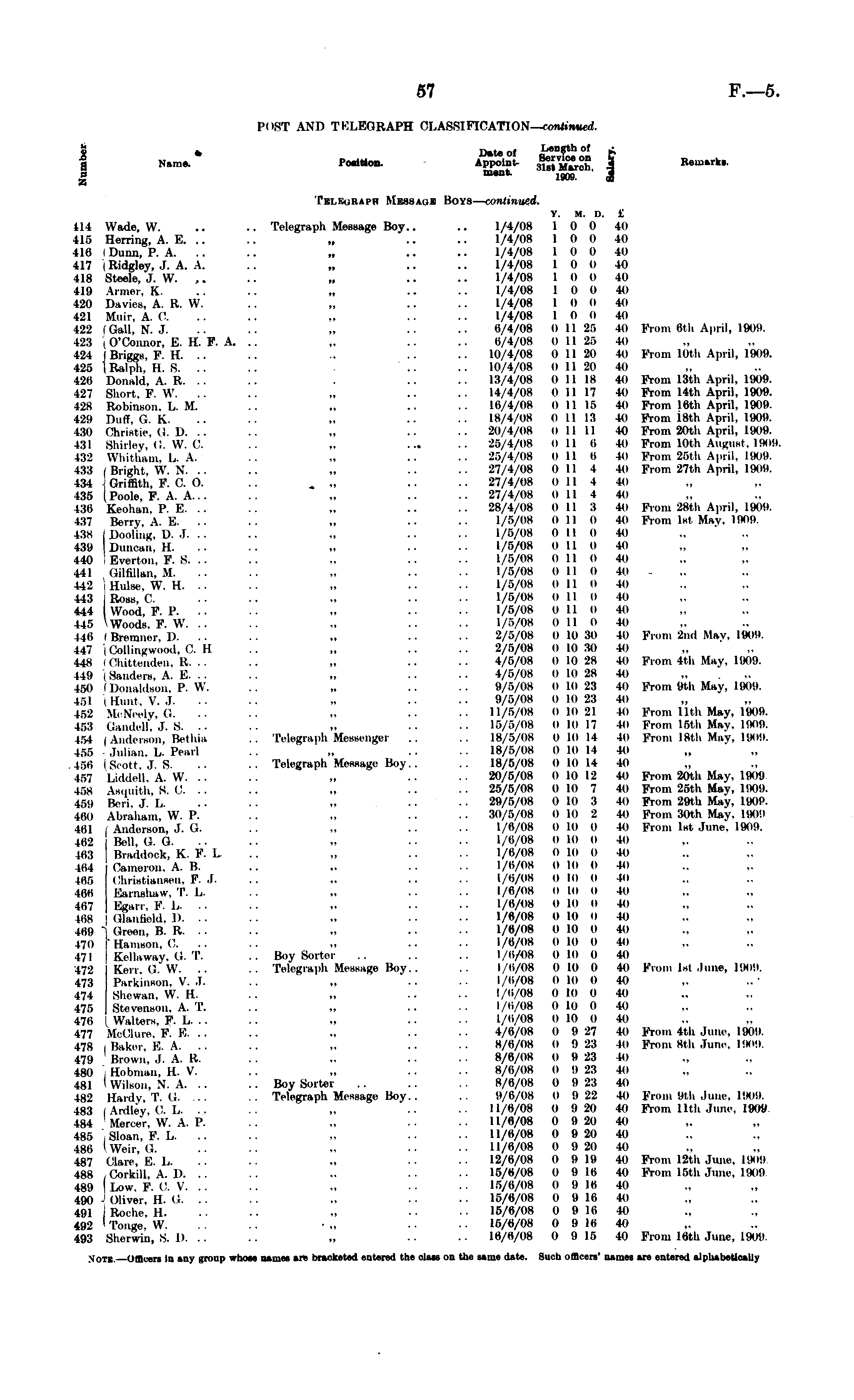 POST AND TELEGRAPH CLASSIFICATION— continued. Z «, Date of Length of I Name. Position. Appoint- 31 XM C *ch A Remarks. s ■"«>«• ' 1909. ' 3 Telegraph Message Boys— continued. v. m. d. £ 414 Wade, XV. .. .. Telegraph Message Boy.. .. 1/4/08 10 0 lo 415 Herring, A. E. .. .. „ .. .. 1/4/08 I 0 I) 40 416 (Dunn, P. A. .. .. „ .. .. 1/4/08 1 o o 40 417 i Ridgley, J. A. A. .. „ .. .. 1/4/08 1 0 0 lo 418 Steele, J. W. ~ .. „ .. .. 1/4/08 1 o o 40 419 Aimer, K. .. .. „ .. .. 1/4/08 1 0 0 40 420 Davies, A. R. W. „ .. .. 1/4/ OS 1 O Q 40 421 Muir. A. C. .. .. .. .. .. 1/4/ OS 10 0 40 422 (Gall. N. J. .. .. .. .. 0/4/08 (I II 25 40 From Oil. April, 1900. 423 (O'Connor, E. H. F. A. .. „ .. .. 0/4/08 0 1125 40 424 I Briggs. !•'. H. .. .. .. .. .. 10/4/08 011 20 40 From 10th April, 1909. 425 1 Ralph, H. S. .. .. '.. .. 10/4/08 0 1120 lo 426 Donald, A. R. .. .. . .. .. 13/4/08 011 IS 40 From 13th April. 1909. 427 Short, F. W. .. .. „ .. .. 14/4/08 (111 17 40 From 14th April. 1909. 428 Robinson. L. M. „ .. .. 16/4/08 oil 18 40 From 10th April. 1909. 429 Duff. G. K. .. .. „ •■ •• 18/4/ OS 011 13 40 From 18th April. 1909. 130 Christie. G. D. .. .. .. .. .. 2o Cos 011 11 40 From 20th April. 1909. 431 Shirley. G. W. C. „ ... .. 25/4/08 (I II 0 40 From 10th Augiisl. 1 909. 432 Whitham, L. A. .. „ .. •■ 28 1/08 011 8 lo Prom 26th April, 1909. 433 ( Bright. XV. N. .. .. „ ■• •• 27/4/08 oil 4 40 From 27th April. 1009. 434 Griffith. V. C. O. .. ... .. .. 27/4/ OS oil 4 40 435 (Poole, F. A. A... .. .. .. .. 27/4/68 oil 4 40 130 Keohan. P. E. .. .. .. .. •■ 28/4/08 Oil 3 40 From 28th April, 1900. 437 Berry, A. E. .. .. „ .. .. 1/5/08 oil 0 40 From Ist May, 1800. 438 | Dooling, D. J. .. .. .. .. .. 1/5/08 Oil II lo 439 Duncan. H ~ •• •• 1/5/08 Oil 0 10 110 l-'.w-rton. F. S. .. .. .. .. .. 1/6/08 Oil 0 40 111 Gilffllan, M. .. .. .. •• 1/5/68 oil o 40 442 | Hiils,-. W. 11. .. .. „ •■ •• 1/5/08 Oil II Hi 443 | Ross, C. .. .. .. •• •• l/5/'»8 Oil II lo 444 Wood, F. P. .. .. „ •■ •• 1/5/08 Oil 0 lo 445 \Woods,P.W. .. .. .. .. 1/5/08 (111 0 40 140 (Bremner, I). .■ „ •• •■ 2/5/08 010 80 10 Prom 2nd Max. 1909. 147 Oollingwood, C. H .. „ .. .. 2/5/os 010 80 10 us Chittenden, B. .. .. •• .. •• 4/6/08 0102s 40 Prom 4*h May, 1909. no Sanders, A. B „ .. .. 4/5/08 0102s 40 450 'Donaldson. P. W. .. „ .. 9/5/08 010 23 40 Prom 9th May, 1909. 451 1 Hunt. V.J ■■ •• •• 9/5/08 0 II) 23 40 462 \l. N'.-elv G .. .. •• •• •• 11/5/08 010 81 lo Prom 11th May, 1909. 453 Qandell, J. S. ■■ •• •• ■■ •• 15/6/08 01017 40 Prom 15th May, 1909. i.m (Anderson, Bethia .. Telegraph Messenger .. .. 18/5/os 010 14 4o Prom 18th May, 1909. 166 Julian, L. Pearl .. „ .. .. 18/5/08 010 14 40 450 I Scott, J. 8. •• •• Telegraph Message Boy.. .. 18/5/08 O 111 14 40 457 Lidch-ll X.XV... .. „ .. 20/5/08 1)10 12 40 From 201 hMa v. 1 900 m Uquith, 8. C. .... „ .. .. 25/5/ OS 010 7 lo Prom 25th May, 1909. 459 Ben .11... •• .. •■ 29/5/08 oln 3 40 from 29th May, 1909. 160 Mirahain. XV. P. .. „ .. .. 30/5/08 010 2 40 From 30th May. 1009 401 Wlerson. J. G. .. „ .. .. 1/6/08 Oil) O 40 From Ist June. 1909. 462 Bell, G. G „ •• •■ l/«/ 08 010 0 40 403 Braddock, K. F. L .. „ .. .. 1/6/ OS 010 o 40 404 Cameron. A. B. .. •■ •• •• l/«/ 08 OKI 0 40 465 Christiansen. F. J. .. .. .. .. 1/0/ OS (III) I) 10 460 Barnshaw, T. L. .. .. .. •• l/0/os 0 4o 467 Egarr, F. L „ •■ ■• '/0/os 010 0 lo 408 Glanfield, 1) „ •■ •• I/O/OS old 11 40 469 1 Green, B. R „ •■ I/O/OS Old 0 40 170 llalnson. C „ •■ •• I/O/OS II 10 O 40 471 Kellawav. G. T. .. Boy Sorter .. .. .. I 0/OS 1)10 0 40 472 Ken G. W. •• .. Telegraph Message Boy.. .. I/O/OS 010 0 40 From Ist June, 1909. 473 Parkinson. V. ■I. .. ~ .. .. 1/8/08 010 9 40 474 Shewan. W. H. .. .. .. ■• 1/0/08 OKI 0 to 475 Stevenson. A. T. .. .. .. .. 1/0/08 010 0 lo 470 Walters, P. L ~ .. •• 1/0/08 010 o in 477 M,-Clure F. K. .. .. .. .. •• 4/0/08 O 027 40 From 4th June. 1909. 478 I Haker E \ .. .. .. .. .. S/O/OS II 923 40 From Sth June. 1909. 479 I Brown, J. A. B> .. „ •• «/«/08 0 923 to 480 , Hohinan, H. V. .. „ .. .. S/O/OS 0 023 10 481 ' Wilson. N. A. .. .. Boy Sorter .. .. 8/0/ OS 0 923 10 482 Hardy, T. G. .. .. Telegraph Message Boy.. .. 9/6/08 0 922 40 From 9th June. 1909. 483 fArdley 0. L. • • ~ •• 11/6/08 0 990 40 From 11th June. 1909 484 Mercer, W. A. R .. 11/li/08 0 920 40 485 ', Sloan. F. L „ .. •• 11/0/08 8 9SO 40 486 I Weir, Q „ •• •• 11/6/08 0 9SO lo 487 Clare, E. L. .. .. „ ■• •• 12/6/08 o 919 40 From 12th June, 1909 488 , Corkill, A. D. .. „ ■• •• 15/6/08 0 91H 40 Prom 16th June, 1900 489 Low, P.O. V .. •• 15/8/08 0 918 40 490 ■* Oliver, H. O .. 15/6/08 0 916 lo 491 J Roche. II .. .. •- 15/6/08 0 910 111 492 'Tonge, W •„ •• •• 15/0/08 (I 910 40 493 Sherwin, S. 1). .. .. „ .. 16/6/08 0 915 40 From 10th June. 1 009 Vote. Officers in any group whose names are bracketed entered the class on the same date. Such officers' names are entered alphabetically