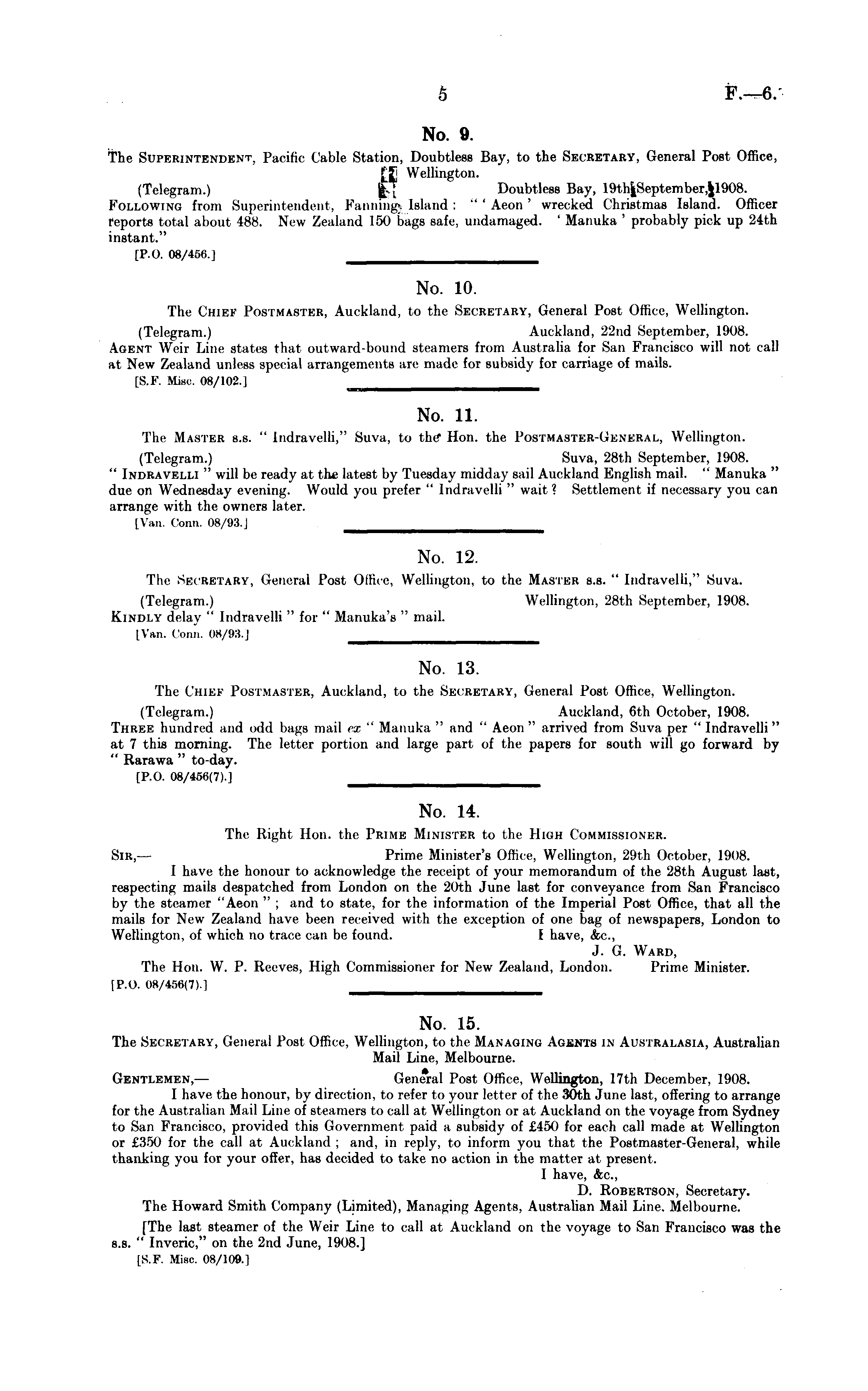 No. 10. The Chief Postmaster, Auckland, to the Secretary, General Post Office, Wellington. (Telegram.) Auckland, 22nd September, 1908. Agent Weir Line states that outward-bound steamers from Australia for San Francisco will not call at New Zealand unless special arrangements are made for subsidy for carriage of mails. [S.F. Mine. 08/102.] ___^^_^^^^^^^—