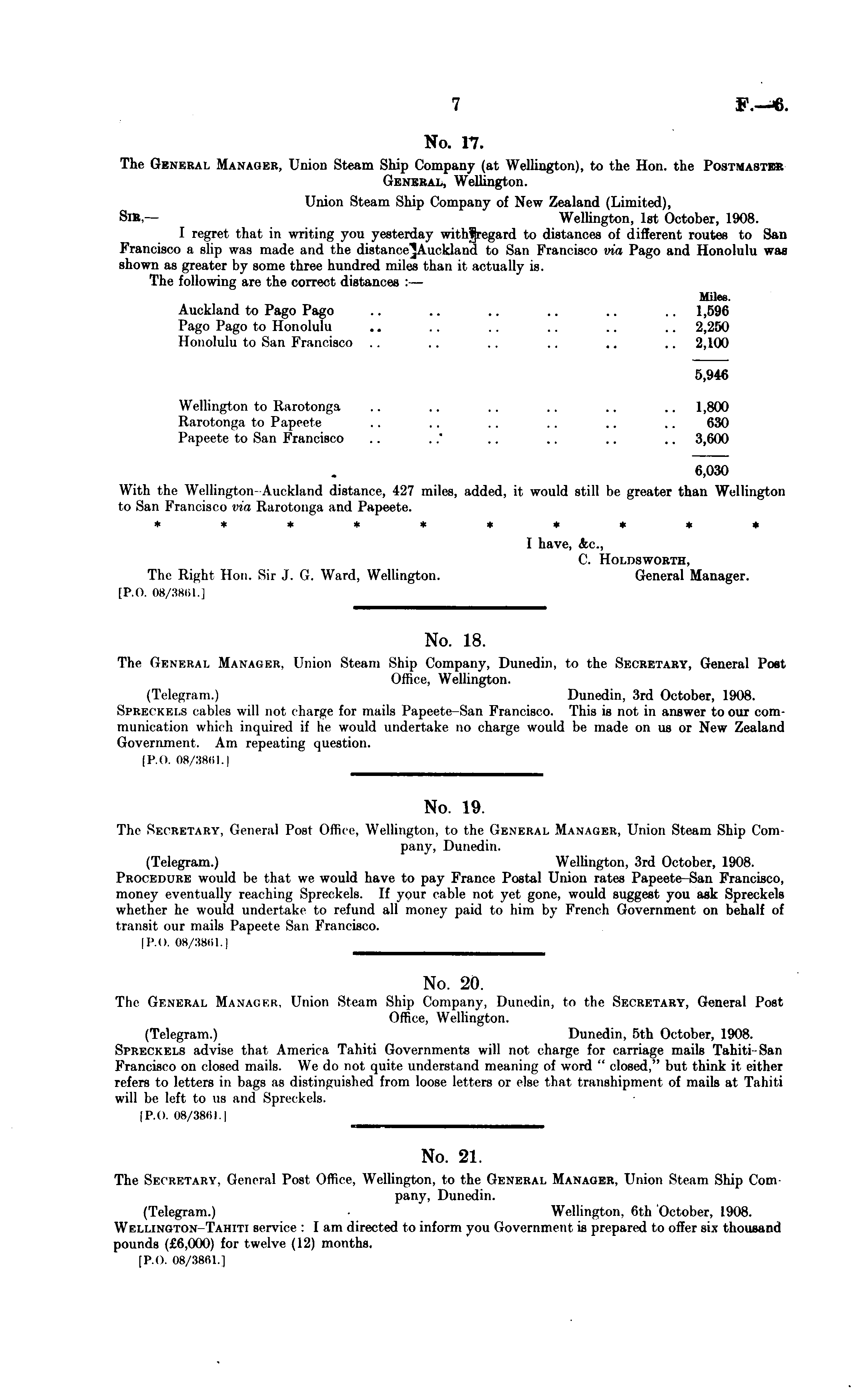 No. 21. The Secretary, General Post Office, Wellington, to the General Manager, Union Steam Ship Company, Dunedin. (Telegram.) • Wellington, 6th October, 1908. Wellington-Tahiti service : I am directed to inform you Government is prepared to offer six thousand pounds (£6,000) for twelve (12) months. [P.O. 08/3861.]