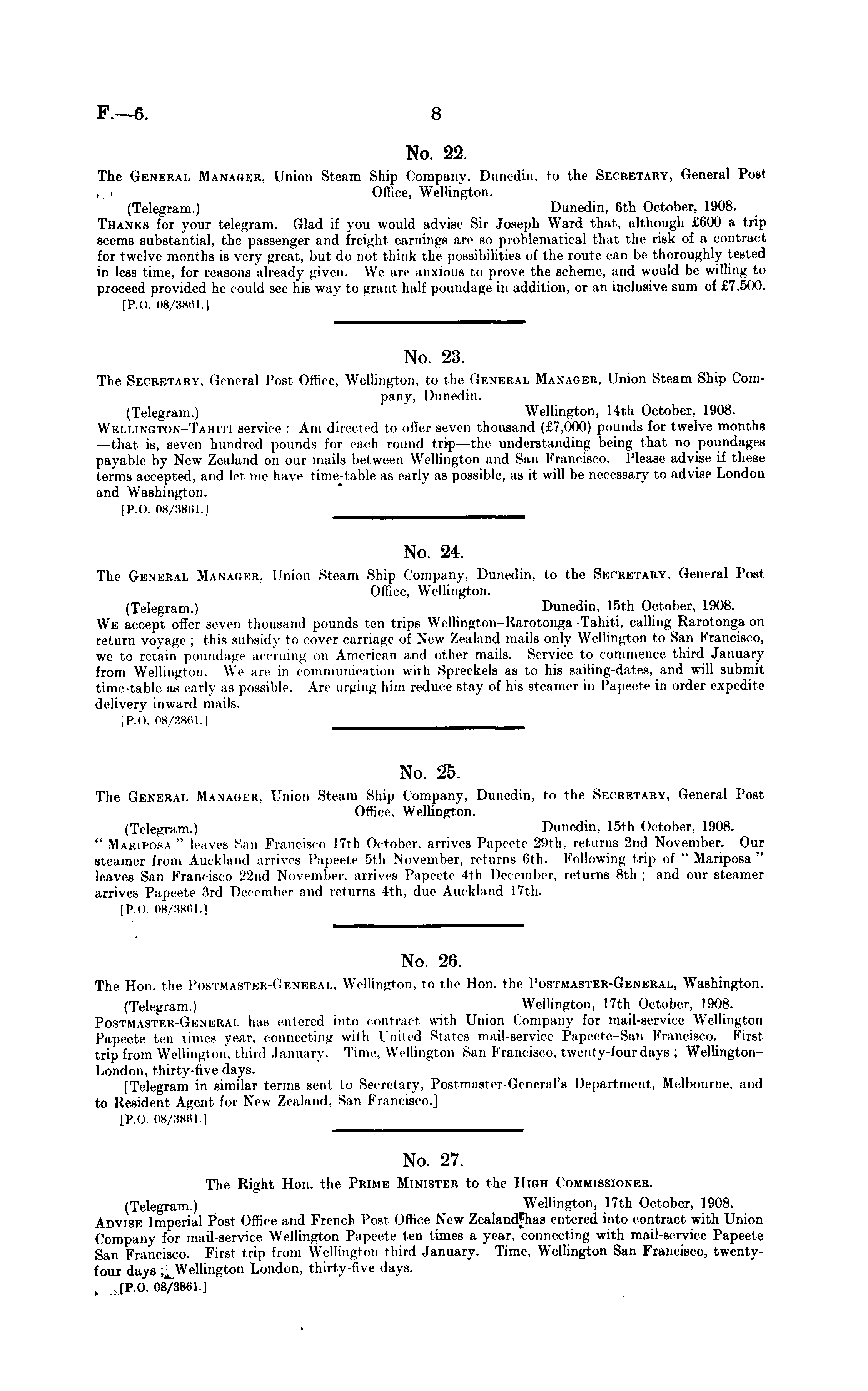 No. 23. The Secretary, General Post Office, Wellington, to the General Manager, Union Steam Ship Company, Dunedin. (Telegram.) Wellington, 14th October, 1908. Wellington-Tahiti service : Am directed to offer seven thousand (£7,000) pounds for twelve months —that is, seven hundred pounds for each round trip —the understanding being that no poundages payable by New Zealand on our mails between Wellington and San Francisco. Please advise if these terms accepted, and let me have time-table as early as possible, as it will be necessary to advise London and Washington.