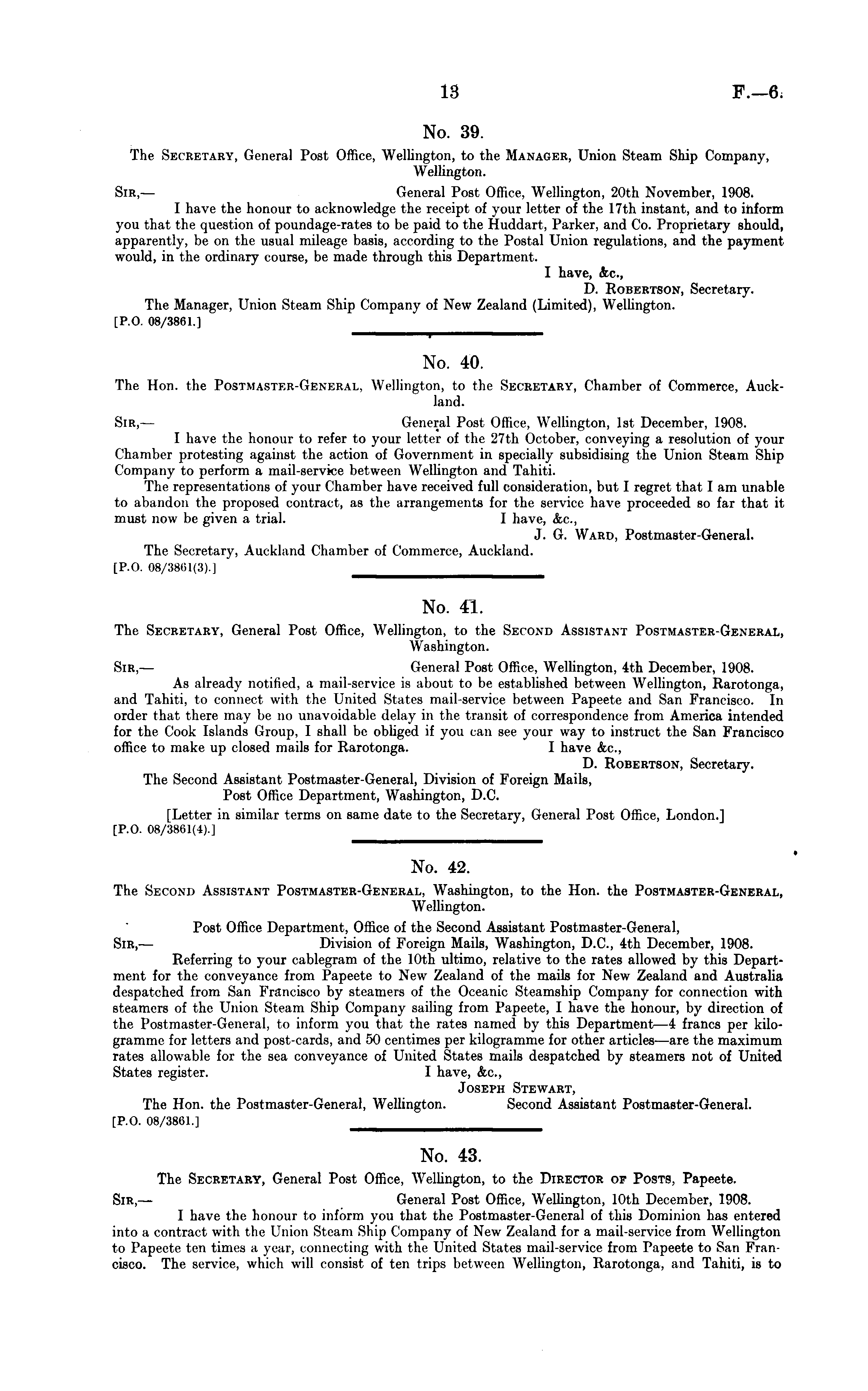 No. 39. The Secretary, General Post Office, Wellington, to the Manager, Union Steam Ship Company, Wellington. Sir,— . General Post Office, Wellington, 20th November, 1908. I have the honour to acknowledge the receipt of your letter of the 17th instant, and to inform you that the question of poundage-rates to be paid to the Huddart, Parker, and Co. Proprietary should, apparently, be on the usual mileage basis, according to the Postal Union regulations, and the payment would, in the ordinary course, be made through this Department. I have, &c, D. Robertson, Secretary. The Manager, Union Steam Ship Company of New Zealand (Limited), Wellington. [P.O. 08/3861.]