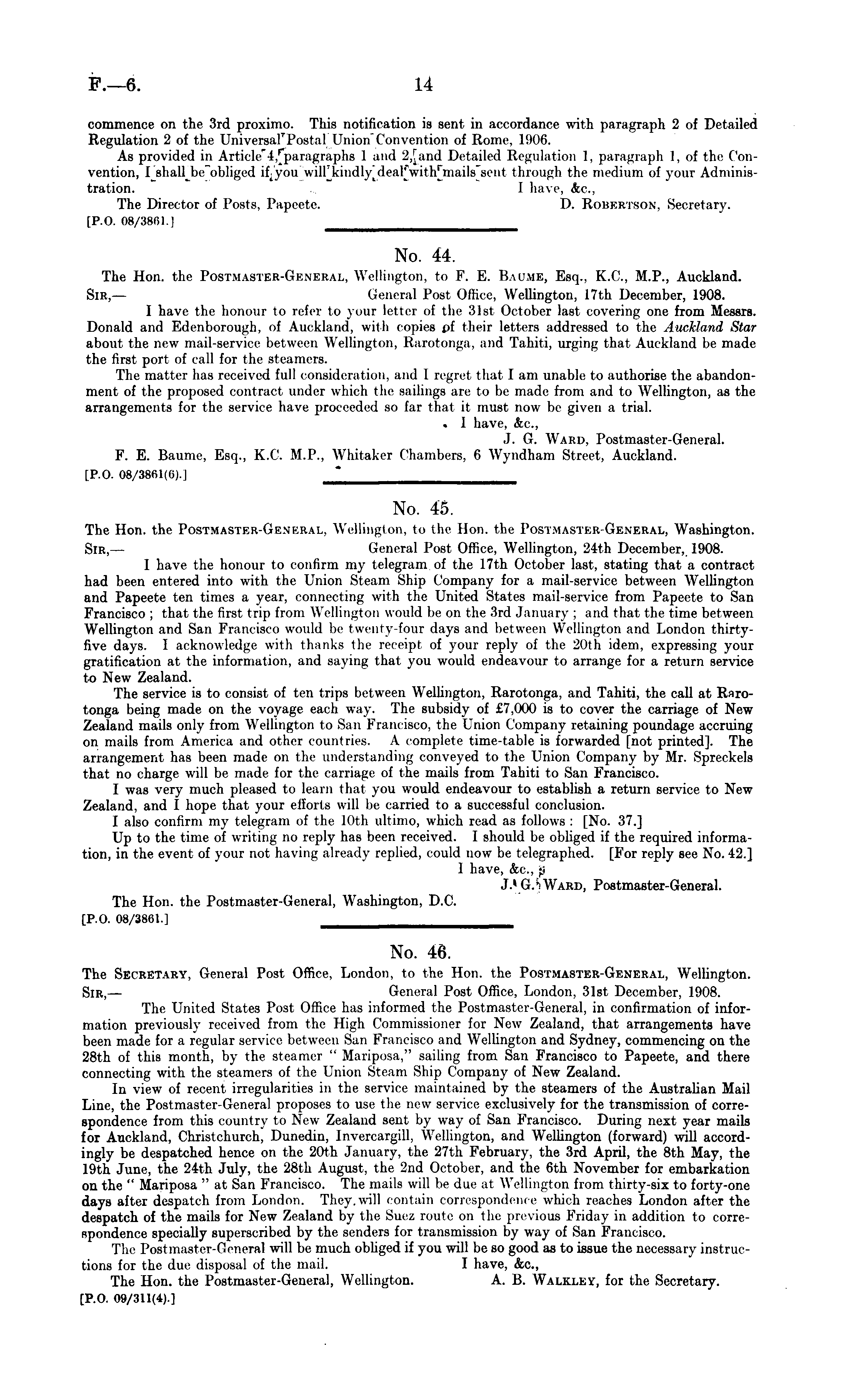 No. 44. The Hon. the Postmaster-General, Wellington, to F. E. Baume, Esq., K.C., M.P., Auckland. Sir, — Genera] Post Office, Wellington. 17th December, 1908. I have the honour to refer to your letter of the 31st October last covering one from Messrs. Donald and Edenborough, of Auckland, with copies pf their letters addressed to the Auckland Star about the new mail-service between Wellington, Rarotonga. and Tahiti, urging that Auckland be made the first port of call for the steamers. The matter has received full consideration, and I regret that I am unable to authorise the abandonment of the proposed contract under which the sailings are to be made from and to Wellington, as the arrangements for the service have proceeded so far that it must now be given a trial. . I have, &c, J. G. Ward, Postmaster-General. F. E. Baume, Esq., K.C. M.P., Whitaker Chambers, 6 Wyndham Street, Auckland. [P.O. 08/3861(0).] *