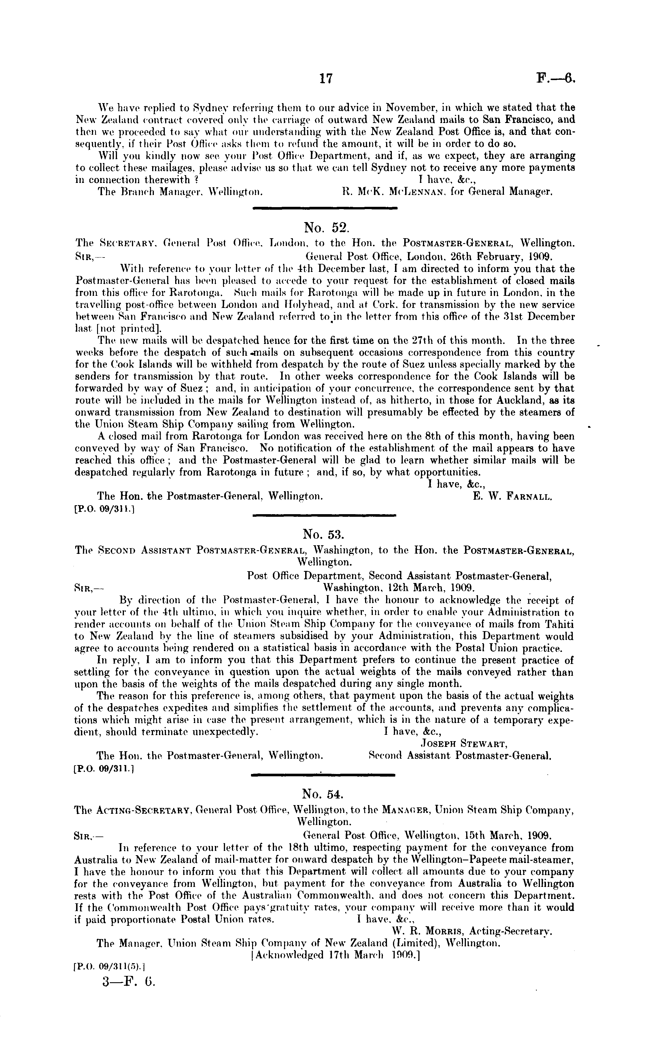 No. 52. The Secretary, General Post Office, London, to the Hon. the Postmaster-General, Wellington. Sir,— General Post Office, London. 26th February, 1909. With reference to your letter of the 4th December last, I am directed to inform you that the Postmaster-General has been pleased to accede to your request for the establishment of closed mails from this office for Rarotonga. Such mails for Rarotonga will be made up in future in London, in the travelling post-office between London anil Holyhead, and at Cork, for transmission by the new service between San Francisco and New Zealand referred to in the letter from this office of the 31st December last [not printed]. The new mails will be despatched hence for the first time on the 27th of this month. In the three weeks before the despatch of such-mails on subsequent occasions correspondence from this country for the Cook Islands will be withheld from despatch by the route of Suez unless specially marked by the senders for transmission by that route. In other weeks correspondence for the Cook Islands will be forwarded by way of Suez ; and. in anticipation of your concurrence, the correspondence sent by that route will be included in the mails for Wellington instead of, as hitherto, in those for Auckland, as its onward transmission from New Zealand to destination will presumably be effected by the steamers of the Union Steam Ship Company sailing from Wellington. A closed mail from Rarotonga for London was received here on the Bth of this month, having been Conveyed by way of San Francisco. No notification of the establishment of the mail appears to have reached this office ; and the Postmaster-General will be glad to learn whether .similar mails will be despatched regularly from Rarotonga in future ; and, if so, by what opportunities. 1 have, &c, The Hon. the Postmaster-General, Wellington. E. W. Farnall. [P.O. 09/311.]
