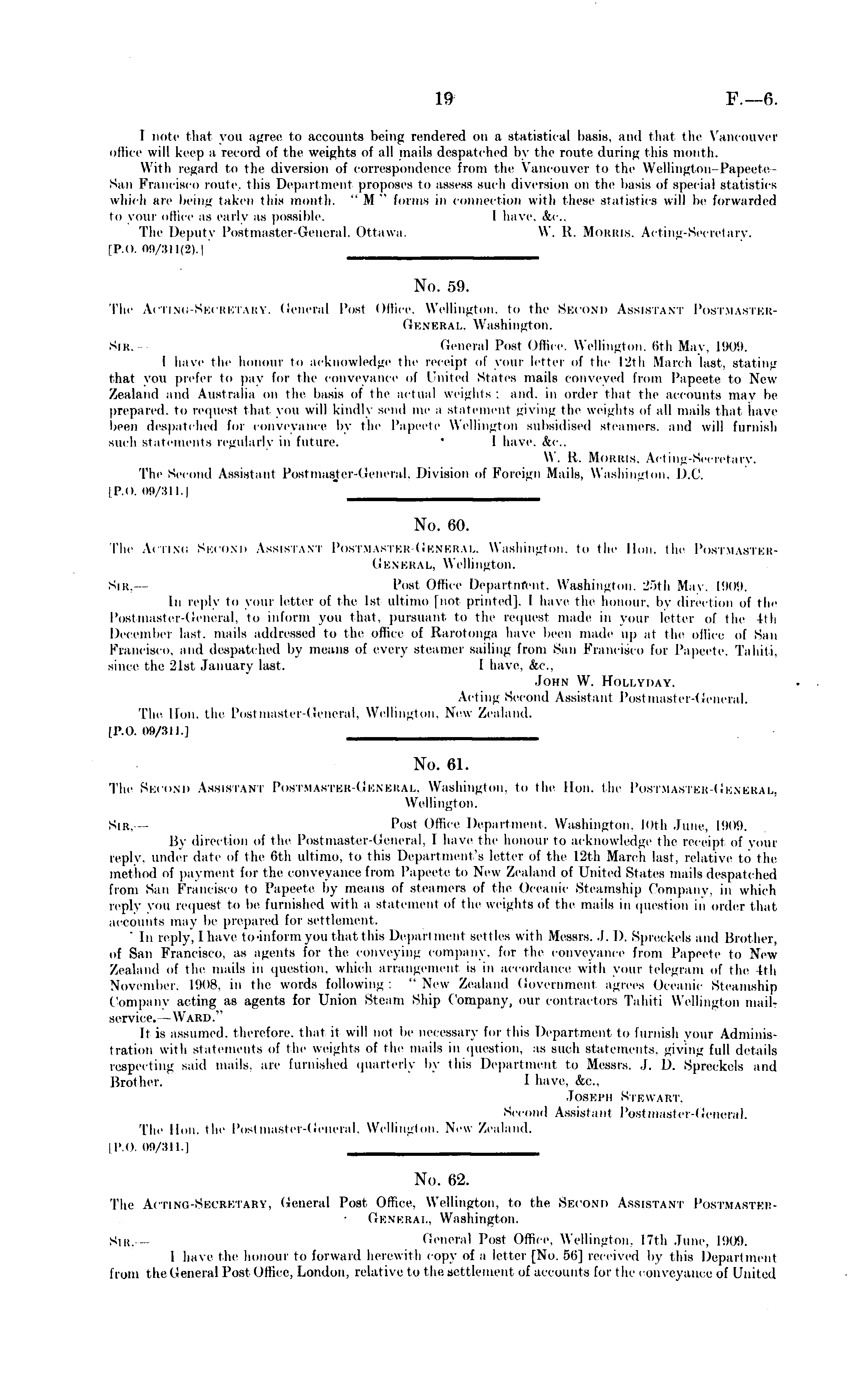 No. 62. The Acting-Secretary, General Post Office, Wellington, to the Second Assistant PostmasterOknkrai.. Washington. Sir,— (leneral Post Office, Wellington, 17th June, 1909. I have the honour to forward herewith copy of a letter [No. 56] received by this Depart ment from the General Post Office, London, relative to the sett lenient of accounts for the conveyance of United