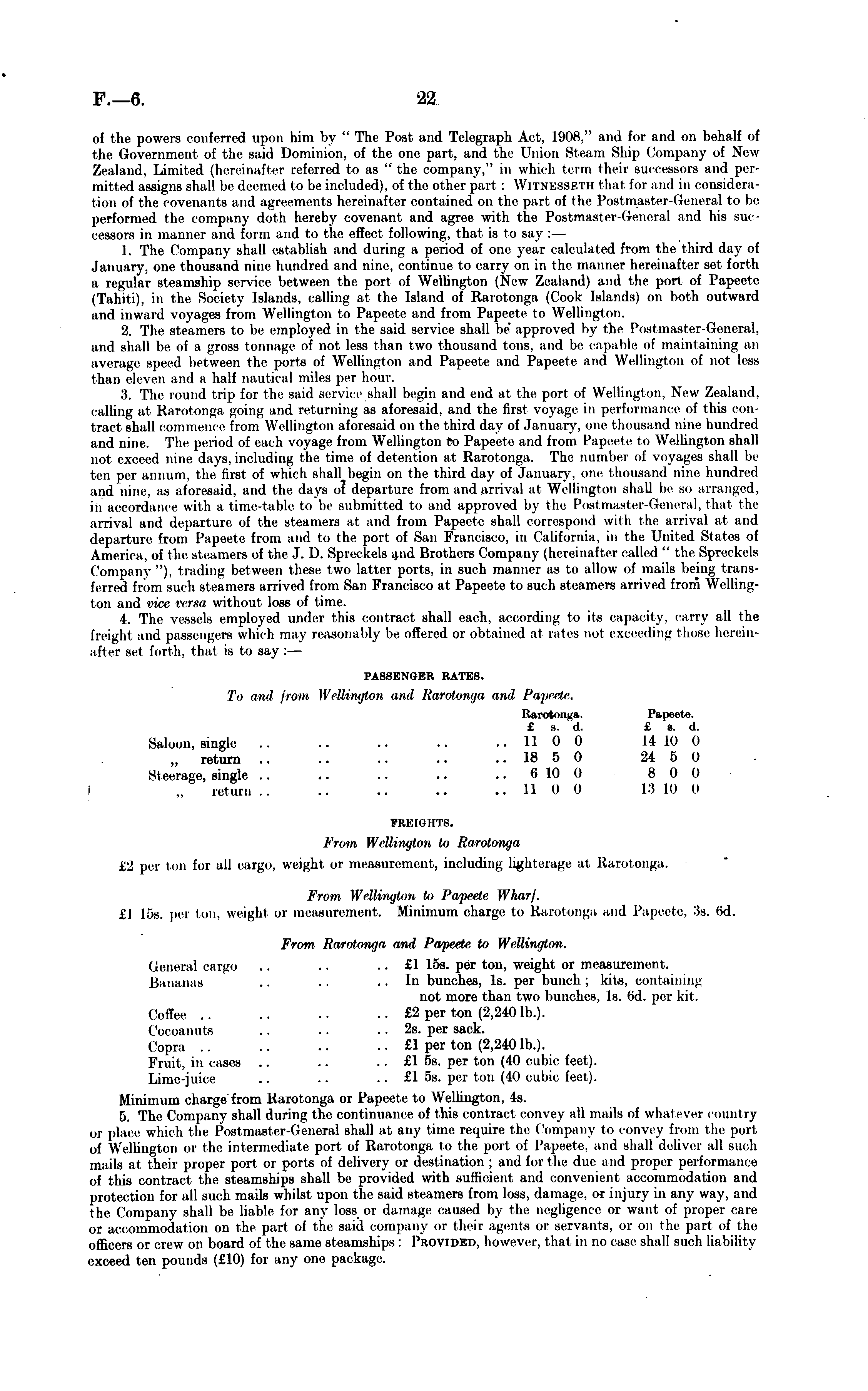 of the powers conferred upon him by " The Post and Telegraph Act, 1908," and for and on behalf of the Government of the said Dominion, of the one part, and the Union Steam Ship Company of New Zealand. Limited (hereinafter referred to as " the company," in which term their successors and permitted assigns shall be deemed to be included), of the other part : Witnesseth thai for and in considers lion of the covenants and agreements hereinafter contained on the part of the Post master General to lie performed the company doth hereby covenant and agree with the Postmaster-! leneral and his successors in manner and form and to the effect following, that is to say : 1. The Company shall establish and during a period of one year calculated from tin' third day of January, one thousand nine hundred and nine, continue to carry on in Ihe mai r hereinafter set forth a regular steamship service between the port of Wellington (New Zealand) and the port of Papeete (Tahiti), in the Society Islands, calling at the Island of Rarotonga (Cook Islands) on both outward and inward voyages from Wellington to Papeete and from Papeete to Wellington. 2. The steamers to be employed in the said service shall be approved by tin l Post master-General. and shall be of a gross tonnage of not less than two thousand tons, and be capable of maintaining an average speed between the ports of Wellington and Papeete and Papeete and Welling! »f not less than eleven and a half nautical miles per hour. 3. The round trip for the said service shall begin and end at the port of Wellington, New Zealand, calling at Rarotonga going and returning as aforesaid, and (he liisl voyage in performance ol this coil tract shall commence from Wellington aforesaid on the third day of January, one t housand nine hundred and nine. The period of each voyage from Wellington to Papeete and from Papeete to Wellington shall not exceed nine days, including the time of detention at Rarotonga. The number of voyages shall be ten per annum, the first of which shall begin on the third day of January, one thousand nine hundred and nine, as aforesaid, and the days of departure from and arrival al Wellington shall be so arranged, in accordance with a time-table to be submitted to and approved by the Post master-General, that the arrival and departure of the steamers at and from Papeete shall correspond with the arrival at and departure from Papeete from and to the port of San Francisco. In California, in the United Slates of America, of the steamers of the J. 1). Spreckels and Brothers Company (hereinafter called " the Spreckels Company"), trading between these two latter ports, in such manner as to allow of mails being transferred from such steamers arrived from San Francisco at Papeete to such steamers arrived from Wellington and rici' versa without loss of time. 4. The vessels employed under this contract shall each, according to its capacity, carry all the freight and passengers which may reasonably be offered or obtained at rates not exceeding those hereinafter set forth, that is to say : — passenger rates. To itml from Wellington and Rarotonga and Papeete. Rarotonga. Papeete. £ s. d. £ s. d. Saloon, single 11 0 0 14 10 0 „ return 18 5 0 24 5 0 Steerage, single .. .. .. .. ~ 610 0 8 0 0 i „ return 11 0 0 18 10 0 FREIGHTS. From Wellington to Rarotonga £'J per ton for all cargo, weight or measurement, including lighterage at Rarotonga. From Wellington to Papeete Wharf. £1 15s. per ton, weight or measurement. Minimum charge to Rarotonga and Papeete. 3s. (id. From Rarotonga and Papeete to Wellington. General cargo .. .. .. £1 15s. per ton, weight or measurement. Bananas .. •• ..In bunches, Is. per bunch; kits, containing not more than two bunches, Is. 6d. per kit. ( offee .. .. .. .. £2 per ton (2,240 lb.). Coeoanuts .. .. .- 2s. per sack. Copra .. .. .. .. £1 per ton (2,2401b.). Fruit, in cases .. .. .. £1 ss. per ton (40 cubic feel). Lime-juice .. .. .. £1 ss. per ton (40 cubic feet). Minimum charge from Rarotonga or Papeete to Wellington, 4s. 5. The Company shall during the continuance of this contract convey all mails of whatever country or place which the Postmaster General shall at any time require the Company to convey from the porl of Wellington or the intermediate port of Rarotonga to the port of Papeete, and shall deliver all such mails at their proper port or ports of delivery or destination : and for the due and proper performance of this contract the steamships shall be provided with sufficient and convenient accommodation and protection for all such mails whilst upon the said steamers from loss, damage, or injury in any way, and the Company shall be liable for any loss,or damage caused by the negligence or want of proper care or accommodation on the part of the said company or their agents or servants, or on the part of the officers or crew on board of the same steamships : Provided, however, thai in no case shall such liability exceed ten pounds (£10) for any one package.