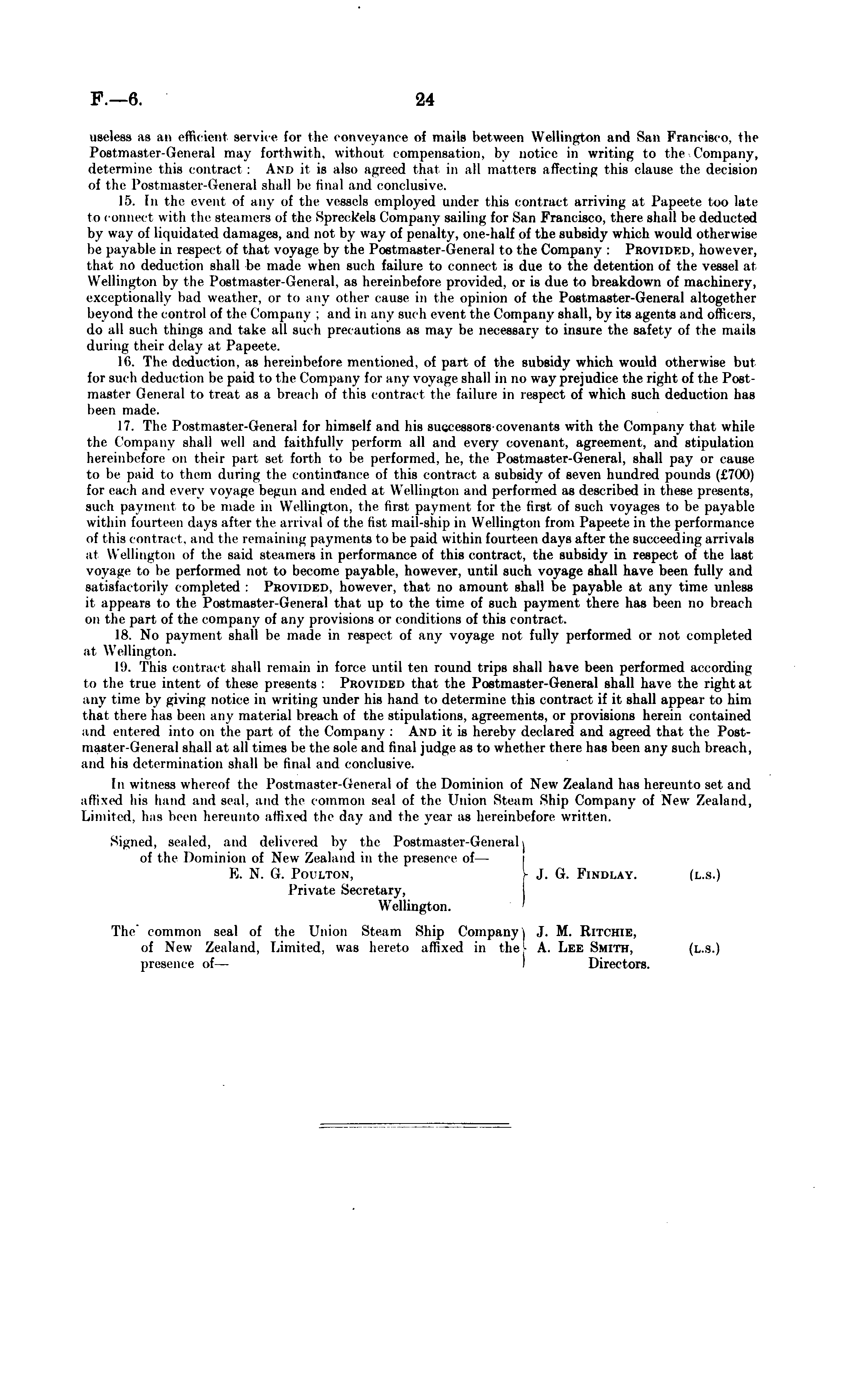 Useless as an efficient service for the conveyance of mails between Wellington and San Francisco, the Postmaster-General may forthwith, without compensation, by notice in writing to the Company, determine this contract : And it is also agreed that in all matters affecting this clause the decision of the Postmaster-General shall be final and conclusive. 15. In the event of any of the vessels employed under this contract arriving at Papeete too late to connect with the steamers of the Spreckels Company sailine for San Francisco, there shall be deducted by way of liquidated damages, and not by way of penalty, one-half of the subsidy which would otherwise lie payable in respect of that voyage by the Postmaster-General to the Company : Provided, however, that no deduction shall be made when such failure to connect is due to the detention of the vessel at Wellington by the Postmaster-General, as hereinbefore provided, or is due to breakdown of machinery, exceptionally bad weather, or to any other cause in the opinion of the Postmaster-General altogether beyond the control of the (lompany : and in any such event the Company shall, by its agents and officers, do all such things and take all such precautions as may be necessary to insure the safety of the mails during their delay at Papeete. Hi. The deduction, as hereinbefore mentioned, of part of the subsidy which would otherwise but for such deduction be paid to the Company for any voyage shall in no way prejudice the right of the Postmaster General to treat as a breach of this contract the failure in respect of which such deduction has been made. 17. The Postmaster-General for himself and his successors covenants with the Company that while the Company shall well and faithfully perform all and every covenant, agreement, and stipulation hereinbefore on their part set forth to be performed, he, the Postmaster-General, shall pay or cause to be paid to them during the continuance of this contract a subsidy of seven hundred pounds (£700) for each anil every voyage begun and ended al Wellington and performed as described in these presents, such payment to be made in Wellington, the first payment for the first of such voyages to be payable within fourteen days after the arrival of the fist mail-ship in Wellington from Papeete in the performance of this contract, and the remaining payments to be paid within fourteen days after the succeeding arrivals at Wellington of the said steamers in performance of this contract, the subsidy in respect of the last voyage to be performed not to become payable, however, until such voyage shall have been fully and satisfactorily completed : Provided, however, that no amount shall be payable at any time unless it appears to the Postmaster-General that up to the time of such payment there has been no breach on the part of the company of any provisions or conditions of this contract. 18. No payment shall be made in respect of any voyage not fully performed or not completed at Wellington. 111. This contract shall remain in force until ten round trips shall have been performed according to the true intent of these presents : Provided that the Postmaster-General shall have the right at any time by giving notice in writing under his hand to determine this contract if it shall appear to him that there has been any material breach of the stipulations, agreements, or provisions herein contained and entered into on the part of the Company : And it is hereby declared and agreed that the Postmaster (leneral shall at all times be the sole and final judge as to whether there has been any such breach, and bis determination shall be final and conclusive. In witness whereof the Postmaster-General of the Dominion of New Zealand has hereunto set and affixed his hand and seal, and the common seal of the Union Steam Ship Company of New Zealand, Limited, has been hereunto affixed the day and the year as hereinbefore written. Signed, sealed, and delivered by the Postmaster-General\ of the Dominion of New Zealand in the presence of— E. N. G. Podlton, >• J. G. FINDLAY. (L.S.) Private Secretary, Wellington. The' common seal of the Union Steam Ship Company] J. M. Ritchie. of New Zealand. Limited, was hereto affixed in the|- A. Lee Smith, (1.5.) presence of— Directors.
