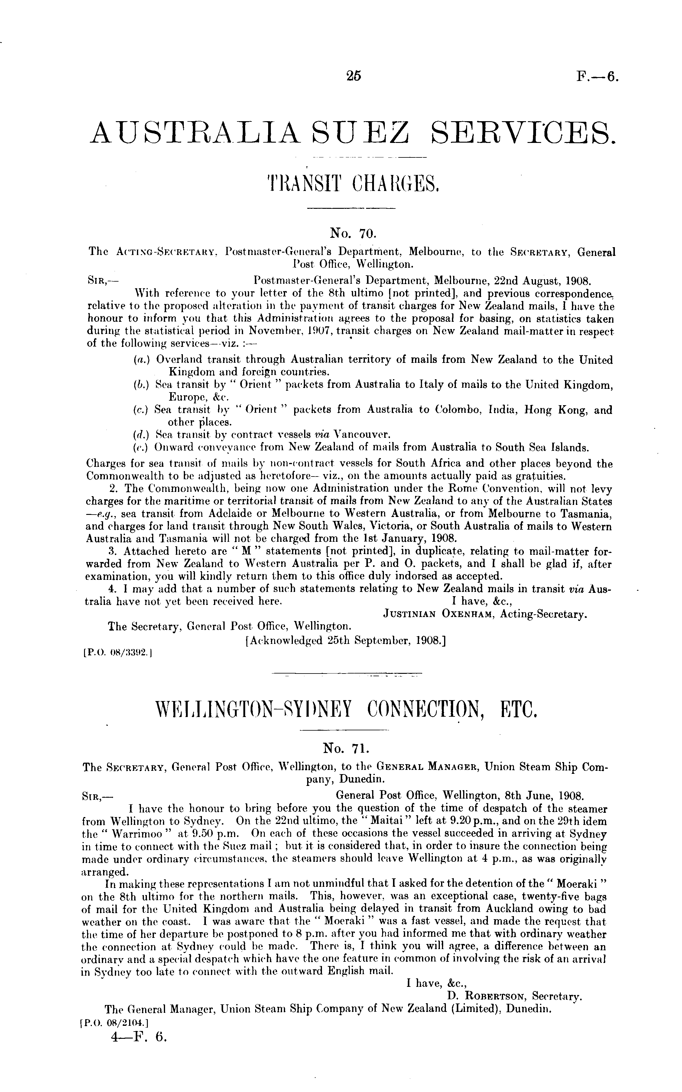 WELLINGTON-SYDNEY CONNECTION, ETC. No. 71. The Secretary, General Post Office, Wellington, to the General Manager, Union Steam Ship Company, Dunedin. Sir,— General Post Office, Wellington, Bth June, 1908. I have the honour to bring before you the question of the time of despatch of the steamer from Wellington to Sydney. On the 22nd ultimo, the " Maitai " left at 9.20 p.m., and on the 29th idem the " Warrimoo " at 9.50 p.m. On each of these occasions the vessel succeeded in arriving at Sydney in time to connect with the Suez mail; but it is considered that, in order to insure the connection being made under ordinary circumstances, the steamers should leave Wellington at 4 p.m., as was originallv arranged. In making these representations I am not unmindful that I asked for the detention of the " Moeraki " on the Bth ultimo for the northern mails. This, however, was an exceptional case, twenty-five bags of mail for the United Kingdom and Australia being delayed in transit from Auckland owing to bad weather on the coast. I was aware that the " Moeraki " was a fast vessel, and made the request that the time of her departure be postponed to 8 p.m. after you had informed me that with ordinary weather the connection at Sydney could be made. There is, I think you will agree, a difference between an ordinary and a special despatch which have the one feature in common of involving the risk of an arrival in Sydney too late to connect with the outward English mail. I have, &c, D. Robertson, Secretary. The General Manager, Union Steam Ship Company of New Zealand (Limited), Dunedin. | CO. 08/2104.]