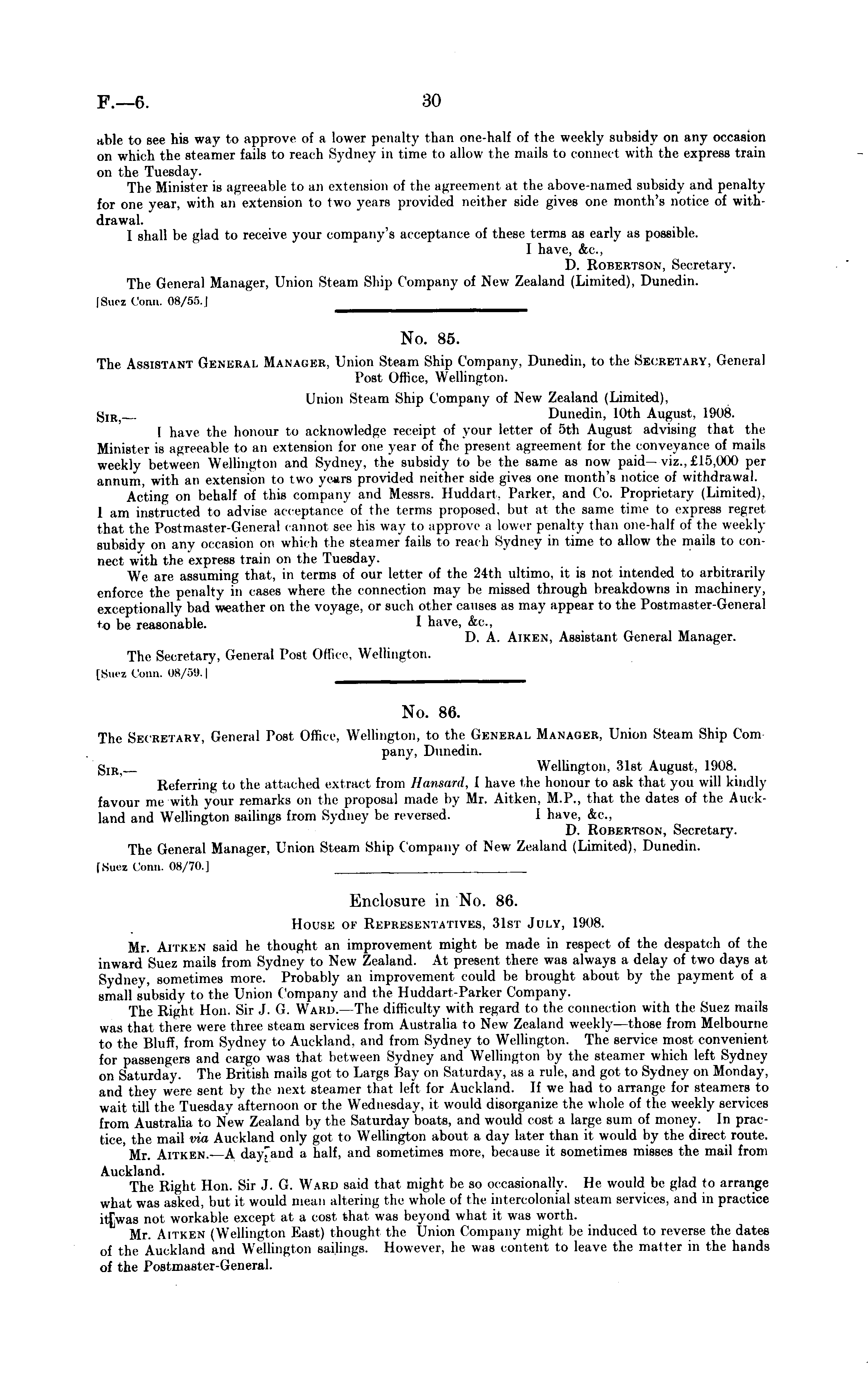 Enclosure in No. 86. House of Representatives, 31st July, 1908. Mr. Aitken said he thought an improvement might be made in respect of the despatch of the inward Suez mails from Sydney to New Zealand. At present there was always a delay of two days at Sydney, sometimes more. Probably an improvement could be brought about by the payment of a small subsidy to the Union Company and the Huddart-Parker Company. The Right Hon. Sir J. G. Ward.—The difficulty with regard to the connection with the Suez mails was that there were three steam services from Australia to New Zealand weekly—those from Melbourne to the Bluff, from Sydney to Auckland, and from Sydney to Wellington. The service most convenient for passengers and cargo was that between Sydney and Wellington by the steamer which left Sydney on Saturday. The British mails got to Largs Bay on Saturday, as a rule, and got to Sydney on Monday, and they were sent by the next steamer that left for Auckland. If we had to arrange for steamers to wait till the Tuesday afternoon or the Wednesday, it would disorganize the whole of the weekly services from Australia to New Zealand by the Saturday boats, and would cost a large sum of money. In practice, the mail via Auckland only got to Wellington about a day later than it would by the direct route. Mr. Aitken.—A day[and a half, and sometimes more, because it sometimes misses the mail from Auckland. The Right Hon. Sir J. G. Ward said that might be so occasionally. He would be glad to arrange what was asked, but it would mean altering the whole of the intercolonial steam services, and in practice itfjwas not workable except at a cost that was beyond what it was worth. Mr. Aitken (Wellington East) thought the Union Company might be induced to reverse the dates of the Auckland and Wellington sailings. However, he was content to leave the matter in the hands of the Postmaster-General.