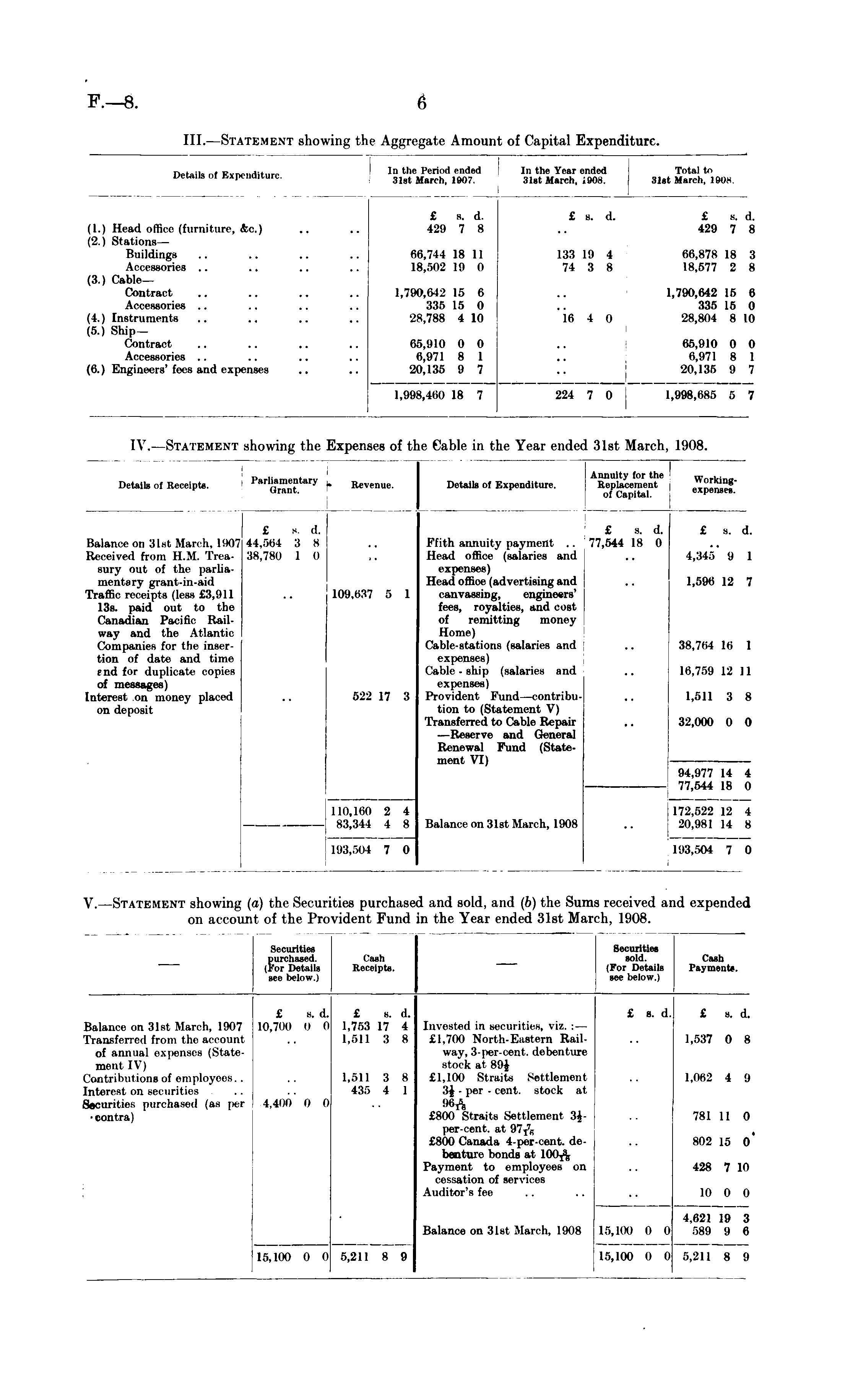 V. —Statement showing (a) the Securities purchased and sold, and (b) the Sums received and expended on account of the Provident Fund in the Year ended 31st March, 1908.