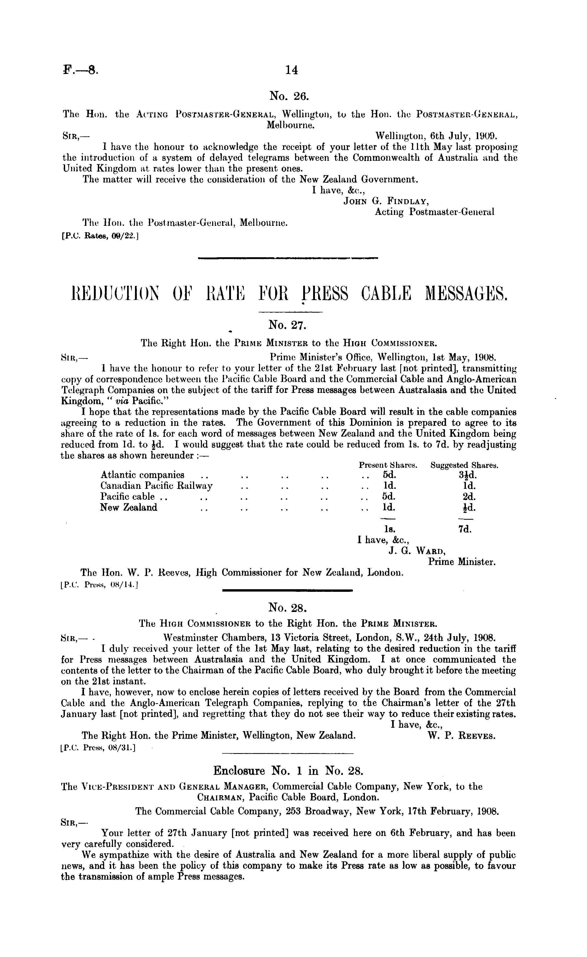 No. 26. The Hon. the Acting Postmasikk-Cknekai.. Wellington, to the Hon. the Postmastbr-Gknkbal, Melbourne. Sir,— Wellington. 6th July, 1909. I have the honour to acknowledge the receipt of your letter of the I lth May last proposing the introduction of a system of delayed telegrams between the Commonwealth of Australia and the United Kingdom at rates lower than the present ones. The matter will receive the consideration of the New Zealand Government. I have, &c. John G. Findlay, Acting Postmaster-General The Hon. the Postmaster-General, Melbourne. [P.C. Rates, 09/22.] REDUCTION OF RATE FOR PRESS CABLE MESSAGES. No. 27. The Right lion, the Prime Minister to the High Commissioner. Sir, — Prime Minister's Office, Wellington. Ist May. 1908. 1 have the honour to refer to your letter of the 21st February last [not printed], transmitting copy of correspondence between the Pacific Cable Board and the Commercial Cable and Anglo-American Telegraph Companies on the subject of the tariff for Press messages between Australasia and the United Kingdom, " via Pacific." I hope that the representations made by the Pacific Cable Board will result in the cable companies agreeing to a reduction in the rates. The Government of this Dominion is prepared to agree to its share of the rate of Is. for each word of messages between New Zealand and the United Kingdom being reduced from Id. to Jd. I would suggest that the rate could be reduced from Is. to 7d. by readjusting the shares as shown hereunder :— Present Shares. Suggested Shores. Atlantic companies .. .. .. .. .. sd. 3Jd. Canadian Pacific Railway .. .. .. Id. Id. Pacific cable .. .. . . .. .. .. sd. 2d. New Zealand .. .. .. Id. Jd. Is. 7d. 1 have, &c, J. G. Ward, Prime Minister. The Hon. W. P. Reeves, High Commissioner for New Zealand, London. [P.G Press, 08/14.] No. 28. The High Commissioner to the Right Hon. the Prime Minister. Sir, — • Westminster Chambers, 13 Victoria Street, London, S.W., 24th July, 1908. I duly received your letter of the Ist May last, relating to the desired reduction in the tariff for Press messages between Australasia and the United Kingdom. I at once communicated the contents of the letter to the Chairman of the Pacific Cable Board, who duly brought it before the meeting on the 21st instant. 1 have, however, now to enclose herein copies of letters received by the Board from the Commercial Cable and the Anglo-American Telegraph Companies, replying to the Chairman's letter of the 27th January last [not printed], and regretting that they do not see their way to reduce their existing rates. I have, &c, The Right Hon. the Prime Minister, Wellington, New Zealand. W. P. Reeves. [P.C. Press, 08/31.] Enclosure No. 1 in No. 28. The \ ii'K-President and General Manager, Commercial Cable Company, New York, to the Chairman, Pacific Cable Board, London. The Commercial Cable Company, 253 Broadway, New York, 17th February, 1908. Sir — Your letter of 27th January [rrot printed] was received here on 6th February, and has been very carefully considered. We sympathize with the desire of Australia and New Zealand for a more liberal supply of public news, and it has been the policy of this company to make its Press rate as low as possible, to favour the transmission of ample Press messages.