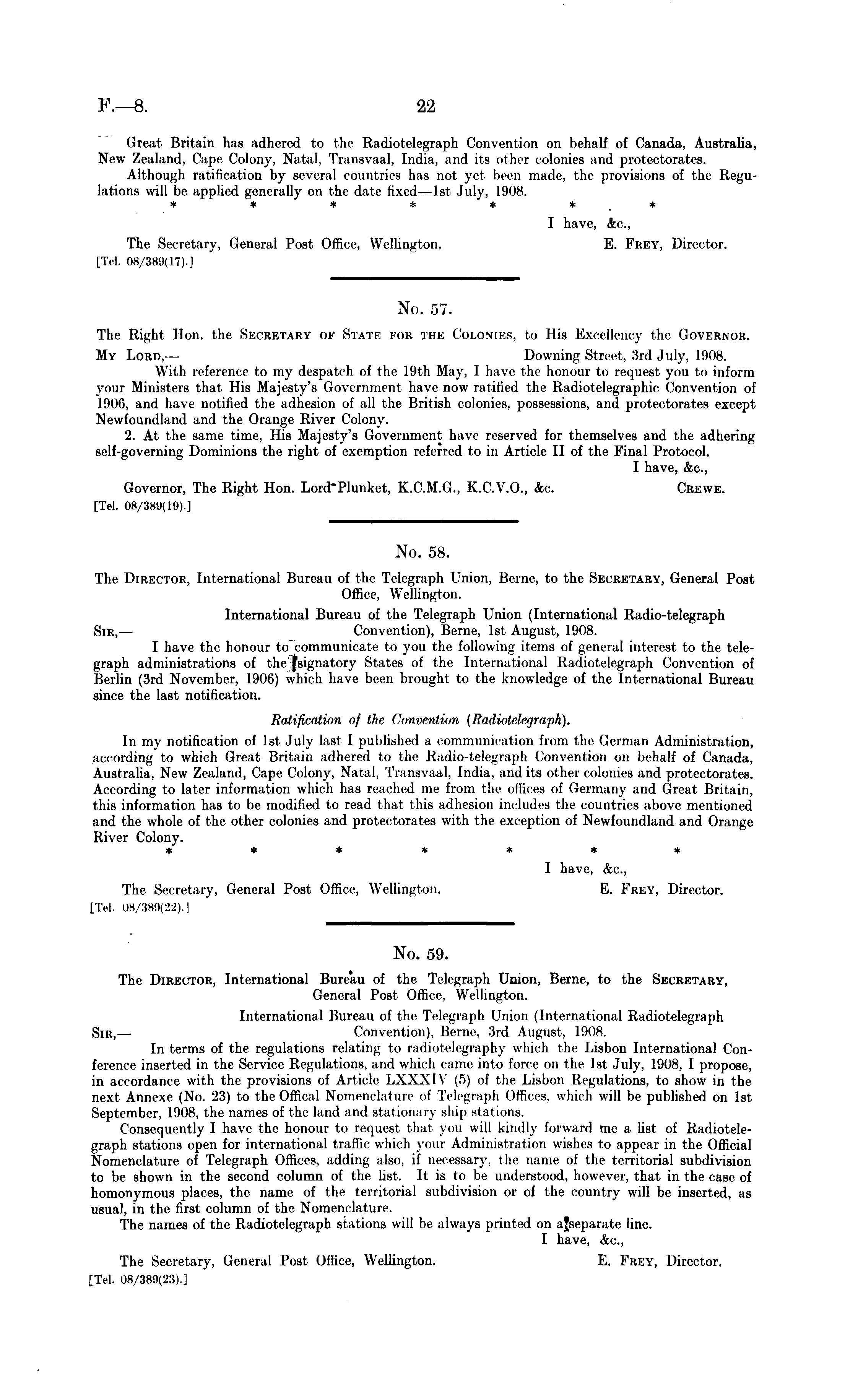 Great Britain has adhered to the Radiotelegraph Convention on behalf of Canada, Australia, New Zealand, Cape Colony, Natal, Transvaal, India, and its other colonies and protectorates. Although ratification by several countries has not yet been made, the provisions of the Regulations will be applied generally on the date fixed—lst July, 1908. ******* I have, &c, The Secretary, General Post Office, Wellington. E. Frey, Director. [Tel. 08/389(17).] No. 57. The Right Hon. the Secretary of State for the Colonies, to His Excellency the Governor. My Lord, — Downing Street, 3rd July, 1908. With reference to my despatch of the 19th May, I have the honour to request you to inform your Ministers that His Majesty's Government have now ratified the Radiotelegraphic Convention of 1906, and have notified the adhesion of all the British colonies, possessions, and protectorates except Newfoundland and the Orange River Colony. 2. At the same time, His Majesty's Government have reserved for themselves and the adhering self-governing Dominions the right of exemption referred to in Article II of the Final Protocol. I have, &c, Governor, The Right Hon. Lord*Plunket, K.C.M.G., K.C.V.0., &c. Crewe. [Tel. 08/389(19).] No. 58. The Director, International Bureau of the Telegraph Union, Berne, to the Secretary, General Post Office, Wellington. International Bureau of the Telegraph Union (International Radio-telegraph Sir, — Convention), Berne, Ist August, 1908. I have the honour to" communicate to you the following items of general interest to the telegraph administrations of the'Jsignatory States of the International Radiotelegraph Convention of Berlin (3rd November, 1906) which have been brought to the knowledge of the International Bureau since the last notification. Ratification of the Convention (Radiotelegraph). In my notification of Ist July last I published a communication from the German Administration, according to which Great Britain adhered to the Radio-telegraph Convention on behalf of Canada, Australia, New Zealand, Cape Colony, Natal, Transvaal, India, and its other colonies and protectorates. According to later information which has reached me from the offices of Germany and Great Britain, this information has to be modified to read that this adhesion includes the countries above mentioned and the whole of the other colonies and protectorates with the exception of Newfoundland and Orange River Colony. ******* I have, &c, The Secretary, General Post Office, Wellington. E. Frey, Director. [Td. 08/380(22).] No. 59. The Director, International Bureau of the Telegraph Union, Berne, to the Secretary, General Post Office, Wellington. International Bureau of the Telegraph Union (International Radiotelegraph Sir, — Convention), Berne, 3rd August, 1908. In terms of the regulations relating to radiotelegraph)' which the Lisbon International Conference inserted in the Service Regulations, and which came into force on the Ist July, 1908, I propose, in accordance with the provisions of Article LXXXIV (5) of the Lisbon Regulations, to show in the next Annexe (No. 23) to the Offical Nomenclature of Telegraph Offices, which will be published on Ist September, 1908, the names of the land and stationary ship stations. Consequently I have the honour to request that you will kindly forward me a list of Radiotelegraph stations open for international traffic which your Administration wishes to appear in the Official Nomenclature of Telegraph Offices, adding also, if necessary, the name of the territorial subdivision to be shown in the second column of the list. It is to be understood, however, that in the case of homonymous places, the name of the territorial subdivision or of the country will be inserted, as usual, in the first column of the Nomenclature. The names of the Radiotelegraph stations will be always printed on ajseparate line. I have, &c, The Secretary, General Post Office, Wellington. E. Frey, Director. [Tel. 08/389(23).]