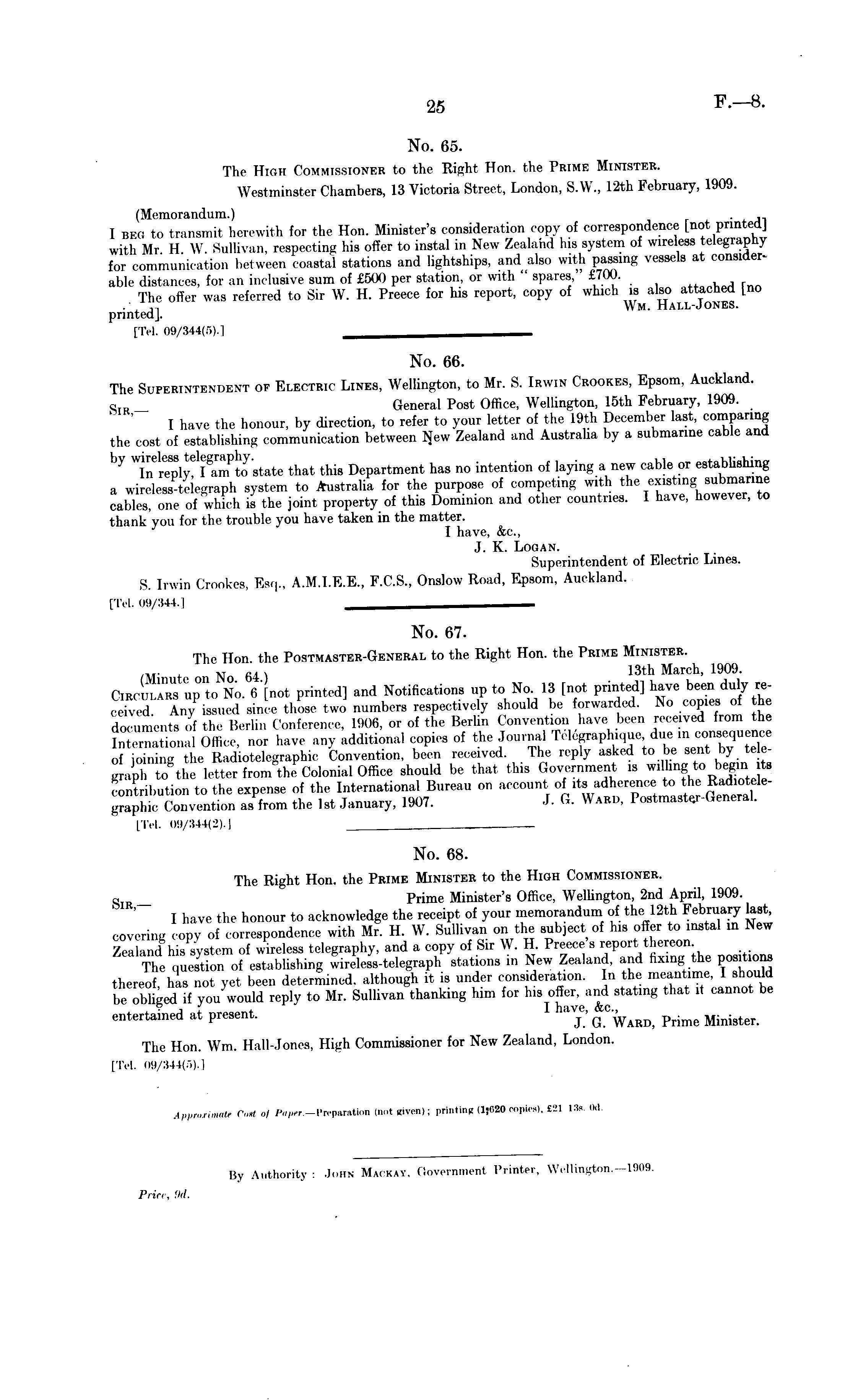 No. 65. The High Commissioner to the Right Hon. the Prime Minister. Westminster Chambers, 13 Victoria Street, London, S.W., 12th February, 1909. (Memorandum.) I beg to transmit herewith for the Hon. Minister's consideration copy of correspondence [not printed] with Mr II W Sullivan, respecting his offer to instal in New Zealand his system of wireless telegraphy for communicatiorj between coastal stations and lightships, and also with passing vessels at consider* able distances, for an inclusive sum of £500 per station, or with " spares £700. The offer was referred to Sir W. H. Preece for his report, copy of which is also attached Lno .';,, Wm. Hall-Jones. printed]. [Tel. 00/344(.-»).l __—^-^——^— — No. 66. The Superintendent of Electric Lines, Wellington, to Mr. S. Irwin Crookes, Epsom, Auckland, o _ General Post Office, Wellington, 15th February, 1909. I have the honour, by direction, to refer to your letter of the 19th December last, comparing the cost of establishing communication between Ifew Zealand and Austraha by a submanne cable and 1)7 ln e reply d I g am P to state that this Department has no intention of laying a new cable or establishing a wireless telegraph system to Australia for the purpose of competing with the existing submarine cables, one of which is the joint property of this Dominion and other countries. I have, however, to thank you for the trouble you have taken in the matter. I have, &c, J. K. Logan. Superintendent of Electric Lines. S. Irwin Crookes, Esq., A.M.1.E.E., F.C.S., Onslow Road, Epsom, Auckland. [Tel. 00/844.] No. 67. The Hon. the Postmaster-General to the Right Hon. the Prime Minister. (W N 64 ) 13th March > 1909 - Circulars No. 6 [not printed] and Notifications up to No 13 [not printed] have been duly received. Any issued since those two numbers respectively should be forwarded. No copies of he documents of the Berlin Conference, 1906, or of the Berlin Convention have been received from the „ ~a„onal Office, nor have any additional copies of the Journal Telegraphique, due in consequence , , „ the Radu.telcgraphic Convention, been received. The reply asked to be sent by telegraph tothe letter Colonial Office should be that this Government is willing to begin. ita contribution to the expense of the International Bureau on account of its adherence to the Radiotelegraphic Convention as from the Ist January, 1907. ■)• G. Ward, Postmastej-GeneraL [Tel. 00/844(2).] .... No. 68. The Right Hon. the Prime Minister to the High Commissioner. s _ Prime Minister's Office, Wellington, 2nd April, 1909. I have the honour to acknowledge the receipt of your memorandum of the 12th February last, covering copy of correspondence with Mr. H. W. Sullivan on the subject of his offer to instal in New Zealand his system of wireless telegraphy, and a copy of Sir W. H. Preece s report^hereon The question of establishing wireless-telegraph stations in New Zealand, and fixing the positions thereof has not yet been determined, although it is under consideration. In the meantime, I should be obliged if you would reply to Mr. Sullivan thanking him for his statmg that it cannot be entertained at present. av £ G C^ ARD prime M^ter. The Hon. Wm. Hall-Jones, High Commissioner for New Zealand, London. [Tel. 00/844(5).]