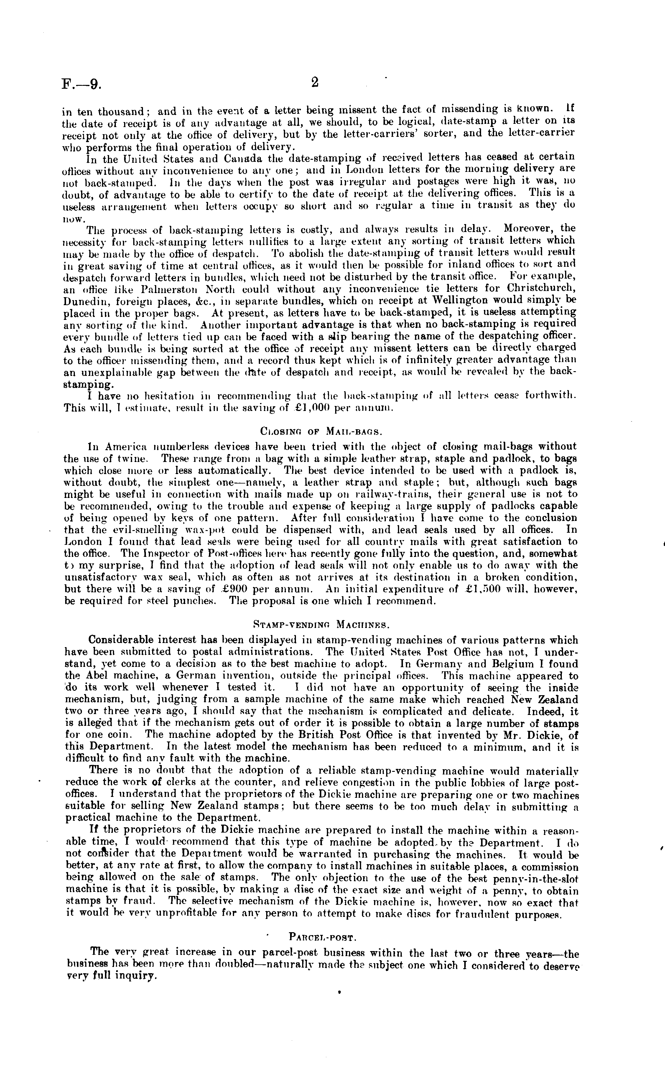 in ten thousand; and in the event of a letter being mieeent the fad of miseending is known, if the date of receipt is of any advantage a< all, we should, to be logical, date-stamp a letter on its receipt not only at the office of delivery, but by the letter-carriers' sorter, and the letter-carrier who performs the tiniil operation of delivery. In the United States and Canada the date-stamping of received letters has ceased at certain otlic.es with.mi any inconvenience to any one; and in London letters for the morning delivery are in.i baok-stamped. In the days when the posi was irregular and postages were high it was, no doubt, of advantage to be able to certify to the date of reoeipi at the delivering offices. This is a useless arrangement when letters occupy so short and so regular a time in transit as they do now. The process of back-Stamping letters is costly, and always results in delay. Moreover, the Qeoessity for back-stamping letters nullifies to a large extent anj sorting of transit letters which maj be made bj the office of despatch, To abolish the date-stamping of transit letters would result in great saving of time at central offices, as it would then be possible for inland offices to Bort and despatch forward letters in bundles, which nerd not be disturbed by the transit office. For example, an office like Palmerston North could without any inconvenience tie letters for Chrietchurch, Dunedin, foreign places, &c, in separate bundles, which on receipt at Wellington would simply be placed in the proper bags. At present, as letters have to be back-stamped, it is useless attempting any sorting of the kind. Another important advantage is that when no back-stamping is required every bundle of letters tied up can be faced with a slip bearing the name of the despatching officer. A- each bundle is being sorted at the office of receipt any mieeent letters can lie directly charged to the officer inissending them, and a record thus kept which is of infinitely greater advantage than an unexplainable gap between the date of despatch and receipt, as would Ih , revealed by the backstamping. I have no hesitation m recommending that the back-stamping of all letters cense forthwith. This will, I estimate, result in the saving of £1,000 per annum. Closing of M ul-b ios. In America numberless devices have been tried with the object of closing mail-bags without the use of twine. These range from a bag with a simple leather strap, staple and padlock, to bags which close mole or less automatically. The best device intended to be used with a padlock is, without doubt, the simplest one namely, a leather strap and staple; but, although such bags might be useful in connect ion with mails made up on railway-trains, their genera] use is not to Ih< recommended, owing to the trouble and expense of keeping a large supply of padlocks capable of being opened by keys of one pattern. After full consideration I have conic to the conclusion that the evil-smelling wax-pot could be dispensed with, and lead seals used by all offices. In London I found that lead seals were being used for all country mails with great satisfaction to the office. The Inspector of Post-offices lien has recently gone fully into the question, and, somewhat t> my surprise, I find that the adoption of lead seals will not only enable us to do away with the unsatisfactory wax seal, which as often as not arrives at its dest iiiation in a broken condition. but there will bo a saving of £900 per annum. An initial expenditure of £1,500 will, however, be required for steel punches. The proposal is one which I recommend. Stamp-vending Ma<-iiinks. Considerable interest has been displayed in stamp-vending machines of various patterns which have been submitted to postal administrations. The United States Post Office has not. I understand, yet come to a decision as to the best machine to adopt. In Germany and Belgian) I found the Abel machine, a German invention, outside the principal offices. This machine appeared to do its work well whenever I tested it. 1 did not have an opportunity of seeing the inside mechanism, but. judging from a sample machine of the same make which reached New Zealand two or three years ago. I should say that the mechanism is complicated and delicate. Indeed, it is alleged that if the mechanism gets out of order it is possible t" obtain a large number of stamps for one coin. The machine adopted by the British Post Office is that invented by Mr. Dickie, of this Department. In the latest model the mechanism has been reduced to a minimum, and it is difficult to find any fault with the machine. There is no doubt that the adoption of a reliable stamp-vending machine would materially reduce the work of clerks at the counter, and relieve congestion in the public lobbies of large postoffices. I understand that the proprietors of the Dickie machine are preparing one or two machines suitable for selling New Zealand stamps; but there seems to be too much delaj in submitting a practical machine to the Department. If the proprietors of the Dickie machine are prepared to install the machine within a reason able time. I would recommend that this type of machine be adopted by the Department. I do not consider that the Depaitnient would be warranted in purchasing the machines. It would !*■ better, at any rate at first, to allow the company to install machines in suitable places, a commission being allowed on the sale of stamps. The only objection to the use of the besi penii v-in-the-slof machine is that it is possible, by making a disc of the exact size and weight of a penny, to obtain stamps by fraud. The selective mechanism of the Dickie machine is, however, now so exact that it would be very unprofitable for any person to attempt to make discs for fraudulent purposes. Pahcet.-post. The very great increase in our parcel-post business within the last two or three years —the business has been more than doubled—naturally made the subjec