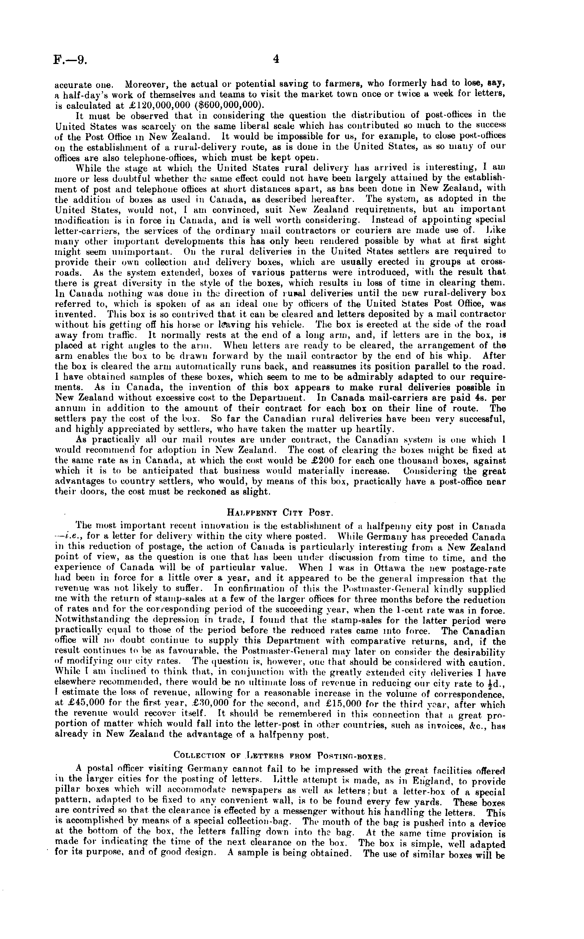 accurate one. Moreover, the actual or potential saving to farmers, who formerly had to lose, say, a half-day's work of themselves and teams to visit the market town once or twice a week for letters, is calculated at £120,000,000 ($600,000,000). It must be observed that in considering the question the distribution of post-offices in the United States was scarcely on the same liberal scale which has contributed so much to the success of the Port Otlice in New Zealand. It would be impossible for us, for example, to close post-offices on the establishment of a rural-delivery route, as is done in the United States, as bo many of our offioei are also telephone-offices, whicli must be kept open. While the Btage at which the United States rural delivery lias arrived is interesting, I am more or less doubtful whether the same effect could not have been largely attained by the establishment of post and telephone offices at short distances apart, as has been done in New Zealand, with the addition of boxes as used in Canada, as described hereafter. The system, as adopted in the United States, would not, I am convinced, suit New Zealand requirements, but an important modification is in force in Canada, and is well worth considering. Instead of appointing special letter-carriers, the services of the ordinary mail contractors or couriers are made use of. Like many other important developments this has only been rendered possible by what at first sight might seem unimportant. On the rural deliveries in the United State! settlers are required to provide their own collection and delivery boxes, which are usually erected in groups at crossroads. As the system extended, boxes of various patterns were introduced, with the result that there is great diversity in the style of the boxes, whicli results in loss of time in clearing them. In Canada nothing was done in the direction of 1 unal deliveries until the new rural-delivery box referred to, which is spoken of as an ideal one by officers of the United States I'ost Office, was invented. This box is so contrived that it can be cleared and letters deposited by a mail contractor without his getting off his home or Id&Tillg his vehicle. The box is erected at the side of the road away from traffic. It normally rests at the end of a long arm, and, if letters are in the I>"\, is placed at right angles to the arm. When letters are ready to be cleared, the arrangement of the arm enables the box to l>c drawn forward by the mail contractor by the end of his whip. After the box is cleared the arm automatic-ally runs back, and reassumes its position parallel to the road. I have obtained samples of these boxes, which seem to me to be admirably adapted to our requirements. As in Canada, the invention of this box appears to make rural deliveries possible in New Zealand without excessive cost to the Department. In Canada mail-carriers are paid 4s. per annum in addition to the amount of their contract for each box on their line of route. The settlers pay the cost of the box. So far the Canadian rural deliveries have been very successful, and highly appreciated by settlers, who have taken the matter up heartily. As practically all our mail routes are under oontraot, the Canadian system is one which 1 would recommend for adoption in New Zealand. The cost of clearing the boxes might be fixed at the same rate as in Canada, at whicli the cost would be £200 for each one thousand boxes, against which it is to be anticipated that business would materially increase. Considering the great advantages to country settlers, who would, by means of this box, practically have a post-office near their doors, the cost must be reckoned as slight. Halfpenny City Post. The most important recent innovation is the establishment of a halfpenny city post in Canada i.e., for a letter for delivery within the city where posted. While Germany has preceded Canada in this reduction of postage, the action of Canada is particularly interesting from a New Zealand point of view, as the question is one that has Imvii under discussion from time to time, and the experience of Canada will be of particular value. When J was in Ottawa the new postage-rate hail Ik<ii in force for a little over a year, and it appeared to be the general impression that the revenue was not likely to suffer. In confirmation of this the Postmaster-General kindly supplied me with the return of stamp-sales at a few of the larger offices for three months before the reduction of rates ami for the corresponding period of the succeeding year, when the I-cent rate was in force. Notwithstanding the depression in trade, I found thai the etamp-sales for the latter period were practically equal to those of the period before the reduced rates came into foroe. The Canadian office will no doubt continue to supply this Department with comparative returns, and, if the result continues to !„• as favourable, the Postmaster-General may later on consider the desirability of modifying our city rates. The question is, however, one that should be considered with caution. While I am inclined to think that, in conjunction with the greatly extended city deliveries I have elsewhere recommended, there would be no ultimate loss of revenue in reducing our city rate to Ad., I estimate the loss of revenue, allowing for a reasonable increase in the volume of correspondence, at £46,000 for the first year, L-.'i0,000 for the second, and £15,000 for the third year, after which the revenue would recover itself. It should lie remembered in this connection that a great proportion of matter which would fall into the letter-post in other countries, such as invoices, etc., has already in New Zealand the advantage of a halfpenny post. Collection ok Letters fhom Postinc-boxes. A postal officer visiting Germany cannot fail to be impressed with the great facilities offered in the larger cities for the posting of letters. Little attempt is made, as in England, to provide pillar 