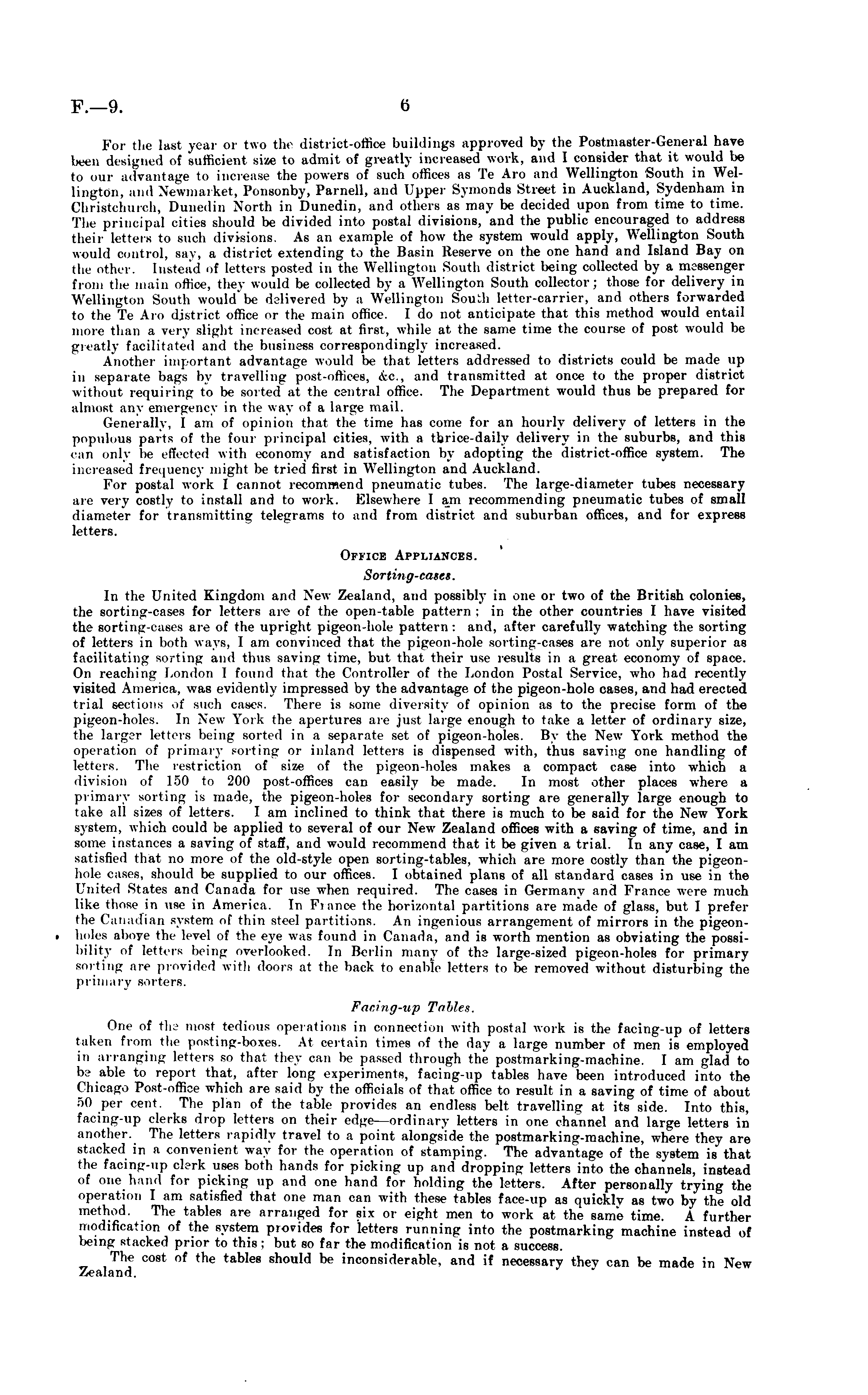 For the last year or two the district-office buildings approved by the Postmaster-General have been designed of sufficient size to admit of greatly increased work, and I consider that it would be to our advantage to increase the powers of such offices as Te Aro and Wellington South in Wellington, and Newmarket, Ponsonby, Parnell, and Upper Symonds Street in Auckland, Sydenham in Christchurch, Dunedin North in Dunedin, and others as may be decided upon from time to time. The principal cities should be divided into postal divisions, and the public encouraged to address their letters to guoh divisions. As an example of how the system would apply, Wellington South would control, say, a district extending to the Basin Reserve <>n the one hand and Island Bay on the other. Instead of letters posted in the Wellington South district being collected by a messenger from the main office, they would be collected by a Wellington South collector; those for delivery in Wellington South would be delivered by a Wellington South letter-carrier, and others forwarded to the Te Aro district office or the main office. Ido not anticipate that this method would entail more than a very dighi increased cost at first, while at the same time the course of post would be greatly facilitated and the business correspondingly increased. Another important advantage would l>e that letters addressed to districts could be made up in separate hays by travelling post-offices, &c., and transmitted at once to the proper district without requiring to be sorted at the central office. The Department would thus be prepared for almost any emergency in the way of a large mail. Generally, I am of opinion that the time has come for an hourly delivery of letters in the populous parts of the four principal cities, with a tbriee-daily delivery in the suburbs, and this can only lie effected with economy and satisfaction by adopting the district-office system. The ii,creased frequency mif_ r lit be tried first in Wellington and Auckland. For postal work I cannot recommend pneumatic tubes. The large-diameter tubes necessary are very costly to install and to work. Elsewhere I am recommending pneumatic tubes of small diameter for transmitting telegrams to and from district and suburban offices, and for express letters. Office Appliances. Sorting-cases. In the United Kingdom and New Zealand, and possibly in one or two of the British colonies, the sorting-oases for letters are of the open-table pattern ; in the other countries I have visited the sortinir eases are of the upright pigeon-hole pattern : and, after carefully watching the sorting of letters in both ways, I am convinced that the pigeon-hole sorting-cases are not only superior as facilitating sorting and thus saving time, but that their use results in a great economy of space. On reaching London I found that the Controller of the London Postal Service, who had recently visited America, was evidently impressed by the advantage of the pigeon-hole cases, and had erected trial sections of such cases. There is senile diversity of opinion as to the precise form of the pigeon-holes. In New York the apertures are just large enough to take a letter of ordinary size, the larger letters being sorted in a separate set of pigeon-holes. By the New York method the operation of primary sorting or inland letters is dispensed with, thus saving one handling of letters. The restriction of size of the pigeon-holes makes a compact case into which a division of 180 to 200 post-offices can easily be made. In most other places where a primary sorting is made, the pigeon-holes for secondary sorting are generally large enough to take all sizes of letters. lam inclined to think that there is much to be said for the New York system, which could be applied to several of our New Zealand offices with a saving of time, and in some instances a saving of staff, and would recommend that it be given a trial. In any case, lam satisfied that no more of the old-style open sorting-tables, which are more costly than the pigeonhole cases, should be supplied to our offices. I obtained plans of all standard cases in use in the United States and Canada for use when required. The cases in Germany and France were much like those in use in America. In Fiance the horizontal partitions are made of glass, but I prefer the Canadian system of thin steel partitions. An ingenious arrangement of mirrors in the pigeonholes above the level of the eye was found in Canada, and is worth mention as obviating the possibility of letters being overlooked. In Merlin many of the large-sized pigeon-holes for primary sorting are provided with doors at the back to enable letters to be removed without disturbing the primary sorters. Facing-up Tablet. One of the most tedious operations in connection with postal work is the facing-up of letters taken from the poeting-boxes. At certain times of the day a large number of men is employed in arranging letters so thai they can be passed through the postmarking-maohine. I am glad to be able to report that, after long experiments, facing-up tables have been introduced into the Chioago Post-office which are said by the officials of that office to result in a saving of time of about 50 per cent. The plan of the table provides an endless belt travelling at its side. Into this, facing-up clerks drop letters on their edge—ordinary letters in one channel and large letters in another. The letters rapidly travel to a point alongside the postmarking-machine, where they are stacked in a convenient way for the operation of stamping. The advantage of the system is that the faoing up olerk uses both hands for picking up and dropping letters into the channels, instead of one hand for picking up and one hand for holding the letters. After personally trying the operation I am satisfied that one man can with these tallies face-up as quickly as two by the old method. The tables are arranged for six or eight men to work at the same 