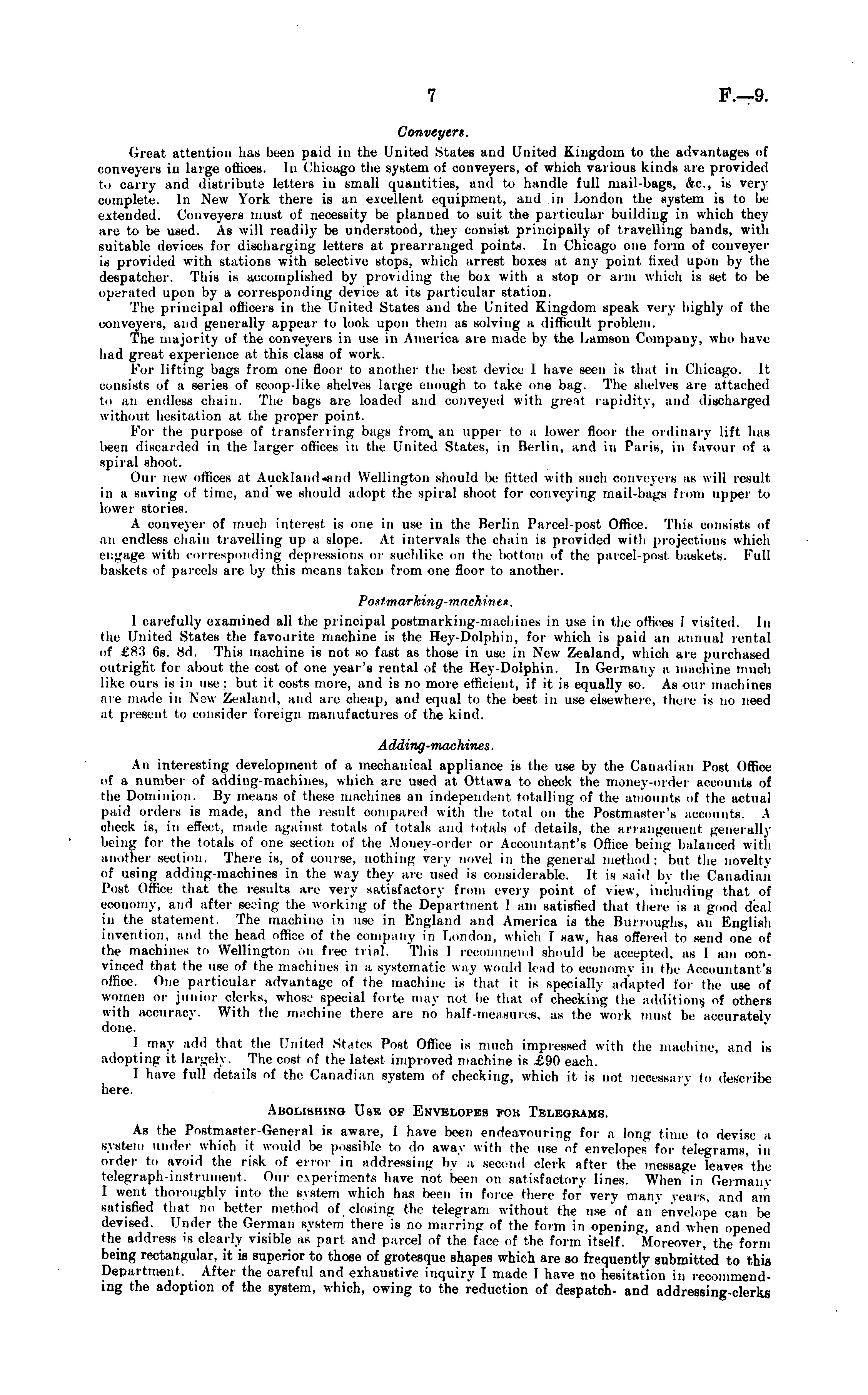 Convey erg. (ireat attention has been paid in the United States and United Kingdom to the advantages of conveyers in large offices. In Chicago the system of conveyers, of which various kinds are provided t.i carry and distribute letters in small quantities, and to handle full mail-bags, &0., is very complete. In New York there is an excellent equipment, and in London the system is to be extended. Conveyers must of necessity be planned to suit the particular building in which they are to be used. As will readily be understood, they consist principally of travelling bands, with suitable devices for discharging letters at prearranged points. In Chicago one form of conveyer is provided with stations with selective stops, which arreel boxes at any point fixed upon by the despatcher. This is accomplished by providing the box with a stop or arm which is set to be operated upon by a corresponding device at its particular station. The principal officers in the United States and the United Kingdom speak very highly of the conveyers, and generally appear to look upon them as solving a difficult problem. The majority of the conveyers in use in America are made by the Lamson Company, who have had great experience at this class of work. For lifting bags from one floor to another the besi device I have seen is thai in Chicago. It consists of a series of scoop-like shelves large enough to take one bag. The shelves are attached to an endless chain. The bags are loaded and conveyed with great rapidity, and discharged without liLtsitation at the proper point. Kor the purpose of transferring hags from, an upper to a lower floor the ordinary lift lias been discarded in the larger offices in the United States, in Berlin, and in Paris, in favour of a spiral shoot. Our new offioea at A iickland -and Wellington should lie lifted with such conveyers as will result in a saving of time, and we should adopt the spiral shoot for conveying mail-bags from upper to lower stories. A conveyer of much interest is one in use in the Berlin Parcel-post Office. This consists of an endless chain travelling up a slope. At intervals the chain is provided with projections which engage with corresponding depressions or suchlike on the bottom of the paroel-posi baskets. Full baskets of parcels are by this means taken from one floor to another. Pos f marking-machine*. I carefully examined all the principal postmarking-maohines in use in the offices I visited. In the United Stairs the favourite machine is the Hey-Dolphin, for which is paid an annual rental of £Xi 6s. Hd. This machine is not bo fast as those in use in New Zealand, which are purchased outright for about the cost of one year's rental of the Hey-Dolphin. In Germany a machine much like ours is in use; but it costs more, and is no more efficient, if it is equally so. As our machines are made in New Zealand, and arc cheap, and equal to the best in use elsewhere, there is no need at present to consider foreign manufactures of the kind. A dding -mac hines. An interesting development of a mechanical appliance is the use by the Canadian Post Office of a number of adding-maehines, which are used at Ottawa to check the money-order accounts of the Dominion. By means of these machines an independent totalling of the amounts of the actual paid orders is made, and the result compared with the total on the Postmaster's accounts. A check is, in effect, made against totals of totals ami totals of details, the arrangement generally being for the totals of one section of the Money-order or Accountant's Office being balanced with another section. There is, of course, nothing very novel in the general method; but the novelty of using adding-maohinea in the way they are used is considerable. It is said by the Canadian Post Office that the results are very satisfactory from every point of view, including that ot' economy, and after seeing the working of the Department I am satisfied that there is a good deal in the statement. The machine in use in England and America is the Burroughs, an English invention, and the head office of the company in London, which 1 saw, has offered to send one of the machines to Wellington on free trial. This I recommend should l>e accepted, as I am convinced that the use of the machines in a systematic way would lead to economy in the Accountant's office. One particular advantage of the machine is that it is specially adapted for the use of women or junior clerks, whose special forte may not lie that of checking the additions of others with accuracy. With the machine there are no half measures, as the work must be accurately done. I may add that the United States Post Office is much impressed with the machine, and its adopting it largely. The cost of the latest improved machine is £90 each. I have full details of the Canadian system of checking, which it is not necessary to describe here. Aholishing Use of Envelopes fok Telegrams. As the Postmaster-General is aware, 1 have been endeavouring for a long time to devise a system under which it would be possible to do away with the use of envelopes for telegrams, in older to avoid the risk of error in addressing by a second clerk after the message leaves the telegraph-instrument. Our experiments have not been on satisfactory lines. When in Germany I went thoroughly into the system which has been in force there for very many pears, and am satisfied that no better method of closing the telegram without tl Bβ of an envelope can lie devised. Under the German system there is no marring of the form in opening, and when opened the address is dearly visible as part and parcel of the face of the form itself. Moreover, the form being rectangular, it is superior to those of grotesque shapes which are so frequently submitted to this Department. After the careful and exhaustive inquiry I made I have no hesitation in recommending the adoption of the system, which, owing to the reduction of despatch- and addressing-clerks