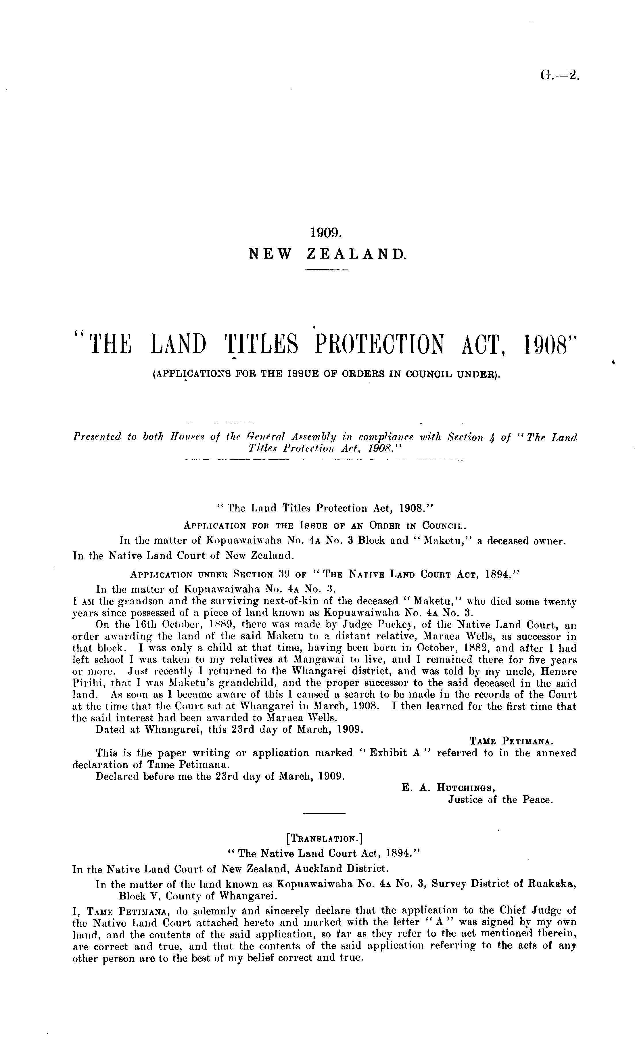 "The Land Titles Protection Act, 1908." Application for the Issue op an Order in Council. In the matter of Kopuawaiwaha No. 4a No. 3 Block and " llaketu," a deceased owner. In the Native Land Court of New Zealand. Application under Section 39 of " The Native Land Court Act, 1894." In the matter of Kopuawaiwaha No. 4a No. .'i. I am the grandson and the surviving next-of-kin of the deceased " Maketu," who died some twenty years since possessed of a piece of land known as Kopuawaiwaha No. 4a No. 3. On the lGth October, 1889, there was made by Judge Puckej, of the Native Land Court, an order awarding the land of the said Maketu to a distant relative, Maraea Wells, as successor in that block. I was only a child at that time, having been born in October, 1882, and after I had left school I was taken to my relatives at Mangawai to live, and I remained there for five years or mine. Just recently I returned to the Whangarei district, and was told by my uncle, Hen are Pirihi, thai I was Maketn's grandohild, and the proper successor to the said deceased in the said land. As soon as I became aware of this I caused a search to be made in the records of the Court at the time that the Court sat at Whangarei in March, 1908. I then learned for the first time that the said interest had been awarded to Maraea Wells. Dated at Whangarei, this 23rd day of March, 1909. Tame Petimana. This is the paper writing or application marked " Exhibit A " referred to in the annexed declaration of Tame Petimana. Declared before me the 23rd day of March, 1909. E. A. Hutchings, Justice of the Peace.