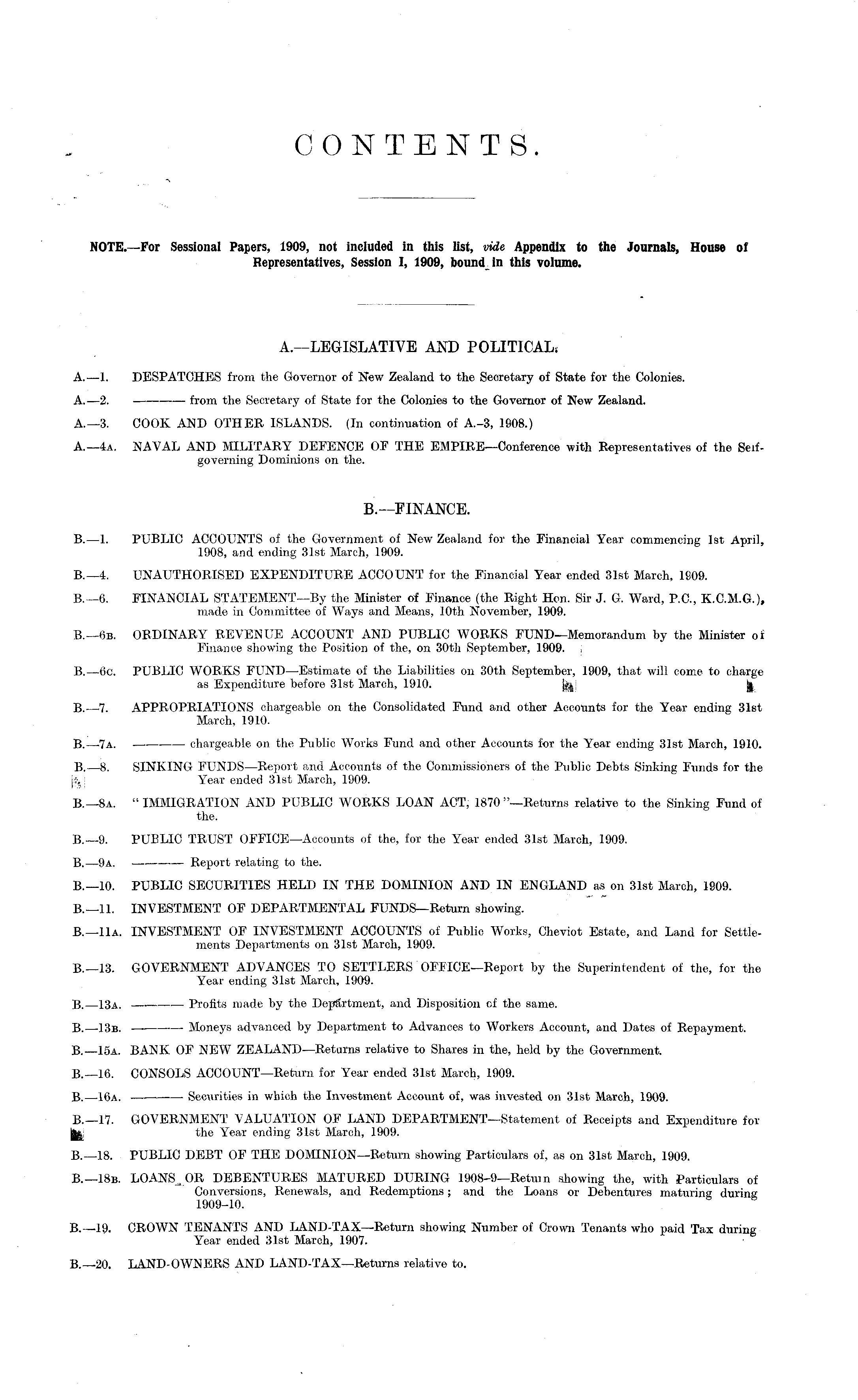 A.—LEGISLATIVE AND POLITICAL. A.—l. DESPATCHES from the Governor of New Zealand to the Secretary of State for the Colonies. A.—2. ■ from the Secretary of State for the Colonies to the Governor of New Zealand. A.—3. COOK AND OTHER ISLANDS. (In continuation of A.-3, 1908.) A.—4a. NAVAL AND MILITARY DEFENCE OE THE EMPlRE—Conference with Representatives of the Selfgoverning Dominions on the. B.—FINANCE. B.—l. PUBLIC ACCOUNTS of the Government of New Zealand for the Financial Year commencing Ist April, 1908, and ending 31st March, 1909. 8.—4. UNAUTHORISED EXPENDITURE ACCOUNT for the Financial Year ended 31st March, 1909. 8.—6. FINANCIAL STATEMENT—By the Minister of Finance (the Right Hon. Sir J. G. Ward, P.C., K.C.M.G.), made in Committee of Ways and Means, 10th November, 1909. B.—6b. ORDINARY REVENUE ACCOUNT AND PUBLIC WORKS FUND—Memorandum by the Minister oi Finance showing the Position of the, on 30th September, 1909. , B.—6c. PUBLIC WORKS FUND—Estimate of the Liabilities on 30th September, 1909, that will come to charge as Expenditure before 31st March, 1910. J| 8.—7. APPROPRIATIONS chargeable on the Consolidated Fund and other Accounts for the Year ending 31st March, 1910. B.—7a. chargeable on the Public Works Fund and other Accounts for the Year ending 31st March, 1910. B.—B. SINKING FUNDS —Report and Accounts of the Commissioners of the Public Debts Sinking Funds for the if, Year ended 31st March, 1909. B.—Ba. "IMMIGRATION AND PUBLIC WORKS LOAN ACT, 1870"—Returns relative to the Sinking Fund of the. 8.—9. PUBLIC TRUST OFFlCE—Accounts of the, for the Year ended 31st March, 1909. B. —9a. Report relating to the. B.—lo. PUBLIC SECURITIES HELD IN THE DOMINION AND IN ENGLAND as on 31st March, 1909. B.—ll. INVESTMENT OF DEPARTMENTAL FUNDS—Return showing. B.—lla. INVESTMENT OF INVESTMENT ACCOUNTS of Public Works, Cheviot Estate, and Land for Settlements Departments on 31st March, 1909. 8.—13. GOVERNMENT ADVANCES TO SETTLERS OFFICE—Report by the Superintendent of the, for the Year ending 31st March, 1909. 8.—13a. Profits made by the Department, and Disposition of the same. 8.—13b. — Moneys advanced by Department to Advances to Workers Account, and Dates of Repayment. 8.—15a. BANK OF NEW ZEALAND—Returns relative to Shares in the, held by the Government. 8.—16. CONSOLS ACCOUNT—Return for Year ended 31st March, 1909. B. —16a. —■ Securities in which the Investment Account of, was invested on 31st March, 1909. 8.—17. GOVERNMENT VALUATION OF LAND DEPARTMENT—Statement of Receipts and Expenditure for the Year ending 31st March, 1909. B.—lB. PUBLIC DEBT OF THE DOMINION—Return showing Particulars of, as on 31st March, 1909. B.—lBb. DEBENTURES MATURED DURING 1908-9—Return showing the, with Particulars of Conversions, Renewals, and Redemptions; and the Loans or Debentures maturing during 1909-10. 8.—19. CROWN TENANTS AND LAND-TAX—Return showing Number of Crown Tenants who paid Tax during Year ended 31st March, 1907. 8.—20. LAND-OWNERS AND LAND-TAX—Returns relative to.
