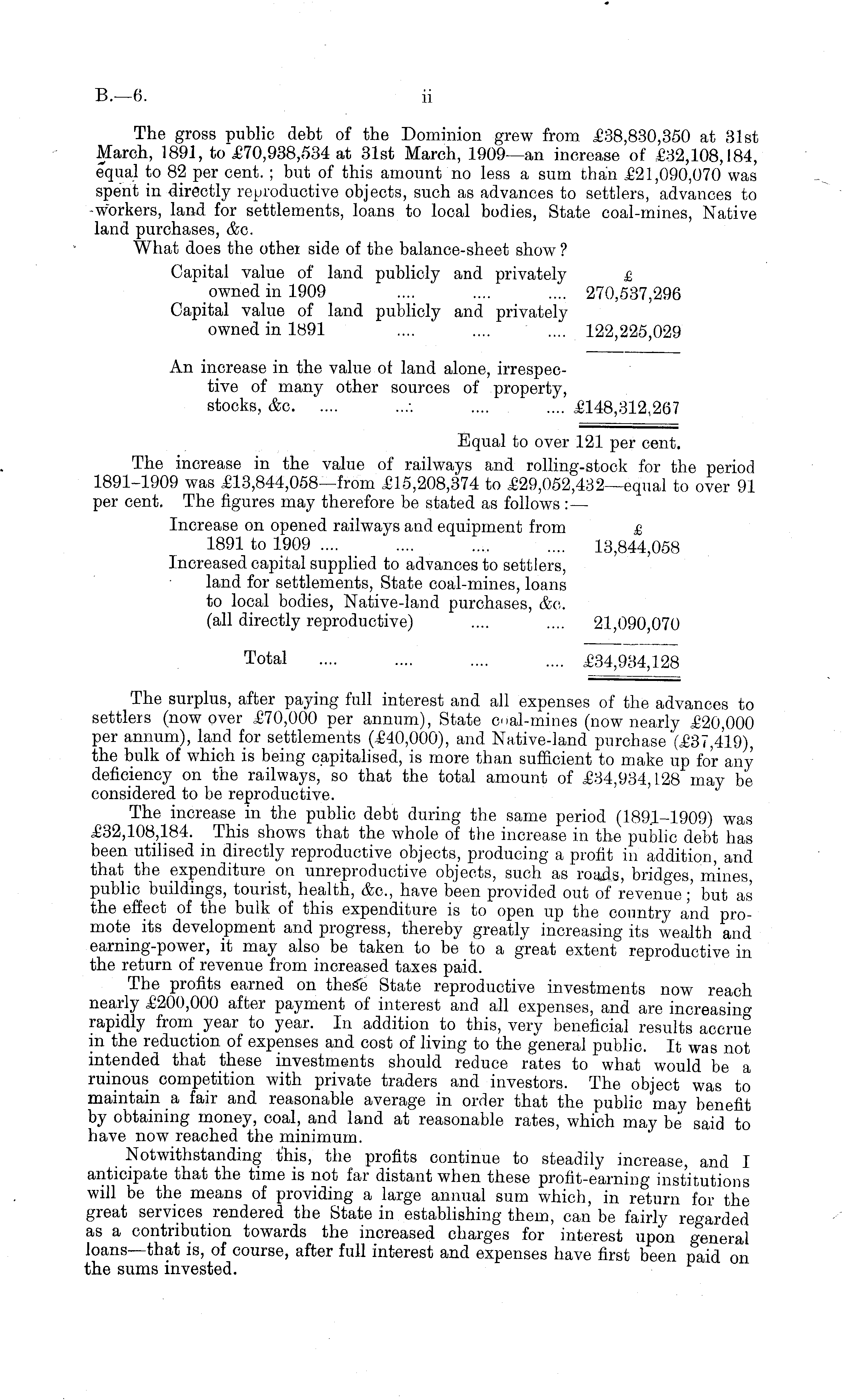 The gross public debt of the Dominion grew from £38,830,350 at 31st March, 1891, to £70,938,534 at 31st March, 1909—an increase of £32,108,184, equal to 82 per cent. ; but of this amount no less a sum than £21,090,070 was spent in directly reproductive objects, such as advances to settlers, advances to workers, land for settlements, loans to local bodies, State coal-mines, Native land purchases, &c. What does the other side of the balance-sheet show ? Capital value of land publicly and privately £ owned in 1909 .... .... .... 270,537,296 Capital value of land publicly and privately owned in 1891 .... .... .... 122,225,029 An increase in the value of land alone, irrespective of many other sources of property, stocks, &c. .... ...-. .... .... £148,312,267 Equal to over 121 per cent. The increase in the value of railways and rolling-stock for the period 1891-1909 was £13,844,058—fr0m £15,208,374 to £29,052,432—equal to over 91 per cent. The figures may therefore be stated as follows:— Increase on opened railways and equipment from £ 1891 to 1909 13,844,058 Increased capital supplied to advances to settlers, land for settlements, State coal-mines, loans to local bodies, Native-land purchases, &c. (all directly reproductive) .... .... 21,090,070 Total .... .... .... .... £34,934,128 The surplus, after paying full interest and all expenses of the advances to settlers (now over £70,000 per annum), State coal-mines (now nearly £20,000 per annum), land for settlements (£40,000), and Native-land purchase (£37,419), the bulk of which is being capitalised, is more than sufficient to make up for any deficiency on the railways, so that the total amount of £34,934, L2B may be considered to be reproductive. The increase in the public debt during the same period (1891-1909) was £32,108,184. This shows that the whole of the increase in the public debt has been utilised in directly reproductive objects, producing a profit in addition, and that the expenditure on unreproductive objects, such as roads, bridges, mines, public buildings, tourist, health, &c, have been provided out of revenue;' but as the effect of the bulk of this expenditure is to open up the country and promote its development and progress, thereby greatly increasing its wealth and earning-power, it may also be taken to be to a great extent reproductive in the return of revenue from increased taxes paid. The profits earned on these State reproductive investments now reach nearly £200,000 after payment of interest and all expenses, and are increasing rapidly from year to year. In addition to this, very beneficial results accrue iix the reduction of expenses and cost of living to the general public. It was not intended that these investments should reduce rates to what would be a ruinous competition with private traders and investors. The object was to maintain a fair and reasonable average in order that the public may benefit by obtaining money, coal, and land at reasonable rates, which may be said to have now reached the minimum. Notwithstanding this, the profits continue to steadily increase, and I anticipate that the time is not far distant when these profit-earning institutions will be the means of providing a large annual sum which, in return for the great services rendered the State in establishing them, can be fairly regarded as a contribution towards the increased charges for interest upon general loans—that is, of course, after full interest and expenses have first been paid on the sums invested.