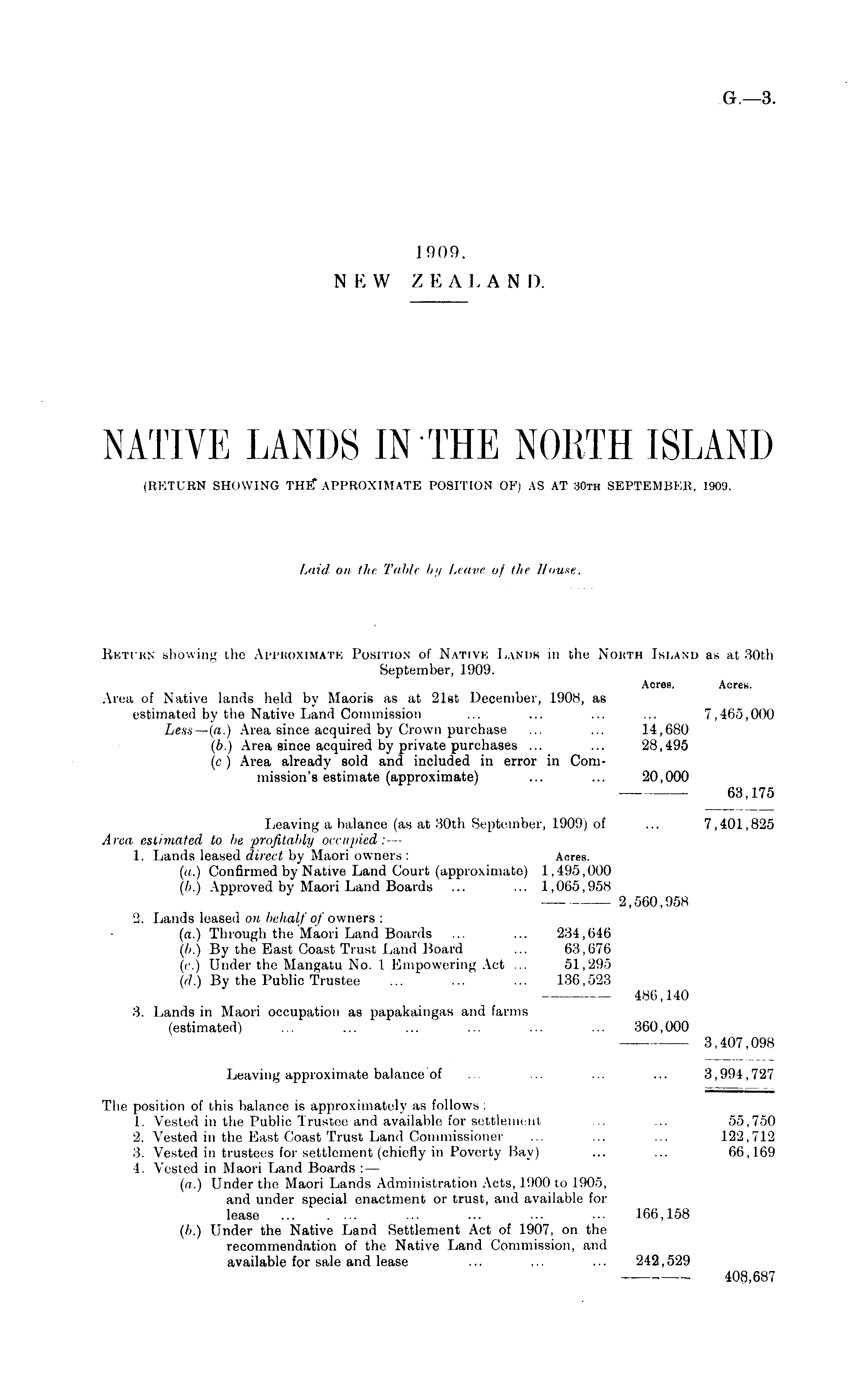 Rkti'kn showing the Approximate Position of Native Lands in the North Island as at 30th September, 1909. Acres. Acres. Area of Native lands held by Maoris as at 21st December, 1908, as estimated by the Native Land Commission ... ... ... ... 7,465,000 Less — (a.) Area since acquired by Crown purchase ... ... 14,680 (b.) Area since acquired by private purchases ... ... 28,495 (c) Area already sold and included in error in Commission's estimate (approximate) ... ... 20,000 63,175 Leaving a balance (as at 30th September, 1909) of ... 7,401,825 Area estimated to be profitably occupied: — 1. Lands leased direct by Maori owners : Acres. (a.) Confirmed by Native Land Court (approximate) 1,495,000 (b.) Approved by Maori Land Boards ... ... 1,065,958 2,560,95s 2. Lands leased on behalf of owners : (a.) Through the Maori Land Boards ... ... 234,646 (b.) By the East Coast Trust Land Board ... 63,676 (c.) Under the Mangatu No. 1 Empowering Act ... 51,295 (d.) By the Public Trustee ... ... ... 136,523 486,140 3. Lands in Maori occupation as papakaingas and farms (estimated) ... ... ... ... ... ... 360,000 3,407,098 Leaving approximate balance of ... ... ... ... 3,994,727 The position of this balance is approximately as follows ; 1. Vested in the Public Trustee and available for settlement ... ... 55,750 2. Vested in the East Coast Trust Land Commissioner ... ... ... 122,712 3. Vested in trustees for settlement (chiefly in Poverty Bay) ... ... 66,169 4. Vested in Maori Land Boards : — (a.) Under the Maori Lands Administration Acts, 1900 to 1905, and under special enactment or trust, and available for lease ... .... ... ... ... ... 166,158 (b.) Under the Native Land Settlement Act of 1907, on the recommendation of the Native Land Commission, and available for sale and lease ... ~. ... 242,529 „ 408,687