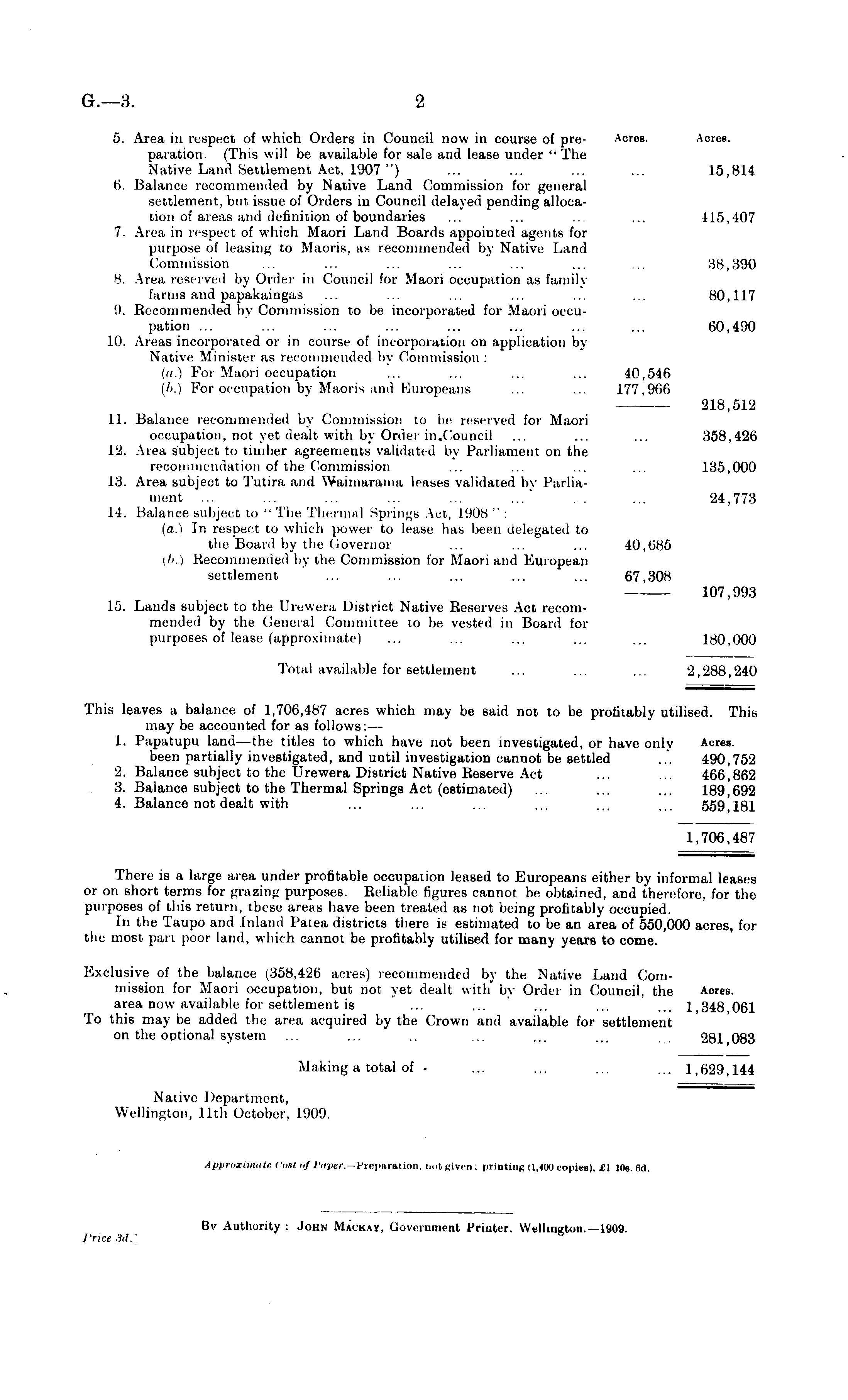 5. Area in respect of which Orders in Council now in course of pre- Acres. Acres. paiation. (This will be available for sale and lease under " The Native Land Settlement Act, 1907 ") ... ... ... ... 15,814 6. Balance recommended by Native Land Commission for general settlement, but issue of Orders in Council delayed pending allocation of areas and definition of boundaries ... ... ... ... 415,407 7. Area in respect of which Maori Land Boards appointed agents for purpose of leasing to Maoris, as recommended by Native Land Commission ... ... ... ... ... ... ... 38,390 8. Area reserved by Order in Council for Maori occupation as family farms and papakaingas ... ... ... ... ... ... 80,117 9. Recommended by Commission to be incorporated for Maori occupation ... ... ... ... ... ... ... ... 60,490 10. Areas incorporated or in course of incorporation on application by Native Minister as recommended by Commission : (a.) For Maori occupation ... ... ... ... 40,546 (/>.) For occupation by Maoris and Europeans ... ... 177,966 218,512 11. Balance recommended by Commission to be reserved for Maori occupation, not yet dealt with by Ordei in.Council ... ... ... 358,426 12. Area subject to timber agreements validated by Parliament on the recommendation of tbe Commission ... ... ... ... 135,000 13. Area subject to Tutira and Waimarama leases validated by Parliament ... ... ... ... ... ..." ... ... 24,773 14. Balance subject to " The Thermal Springs Act, 1908 " ; (a.) In respect to which power to lease has been delegated to the Board by the Governor ... ... ... 40,685 (b.) Recommended by the Commission for Maori and European settlement ... ... ... ... 67,308 107,993 15. Lands subject to the Urewera District Native Reserves Act recommended by the General Committee to be vested in Board for purposes of lease (approximate) ... ... ... ... ... 180,000 Total available for settlement ... ... ... 2,288,240 This leaves a balance of 1,706,487 acres which may be said not to be profitably utilised. This may be accounted for as follows:— 1. Papatupu land —the titles to which have not been investigated, or have only Acres. been partially investigated, and until investigation cannot be settled ... 490,752 2. Balance subject to the Urewera District Native Reserve Act ... ... 466,862 3. Balance subject to the Thermal Springs Act (estimated) ... ... ... 189,692 4. Balance not dealt with ... ... ... ... ... ... 559^181 1,706,487 There is a large area under profitable occupation leased to Europeans either by informal leases or on short terms for grazing purposes. Reliable figures cannot be obtained, and therefore, for the purposes of this return, these areas have been treated as not being profitably occupied. In the Taupo and Inland Patea districts there is estimated to be an area of 550,000 acres, for the most part poor land, which cannot be profitably utilised for many years to come. Exclusive of the balance (358,426 acres) recommended by the Native Land Commission for Maori occupation, but not yet dealt with" by Order in Council, the Aores. area now available for settlement is ... ... ... ... ... 1 348 061 To this may be added the area acquired by the Crown and available for settlement on the optional system ... ... ... ... ... ... 281 083 Making a total of - ... ... ... ... 1,629,144 Native Department, Wellington, 11th October, 1909. Approximate < ost .</ I'uper.- Preparation, uot giTen ; printinK (1,400 copies), f 1 10s. 6d.