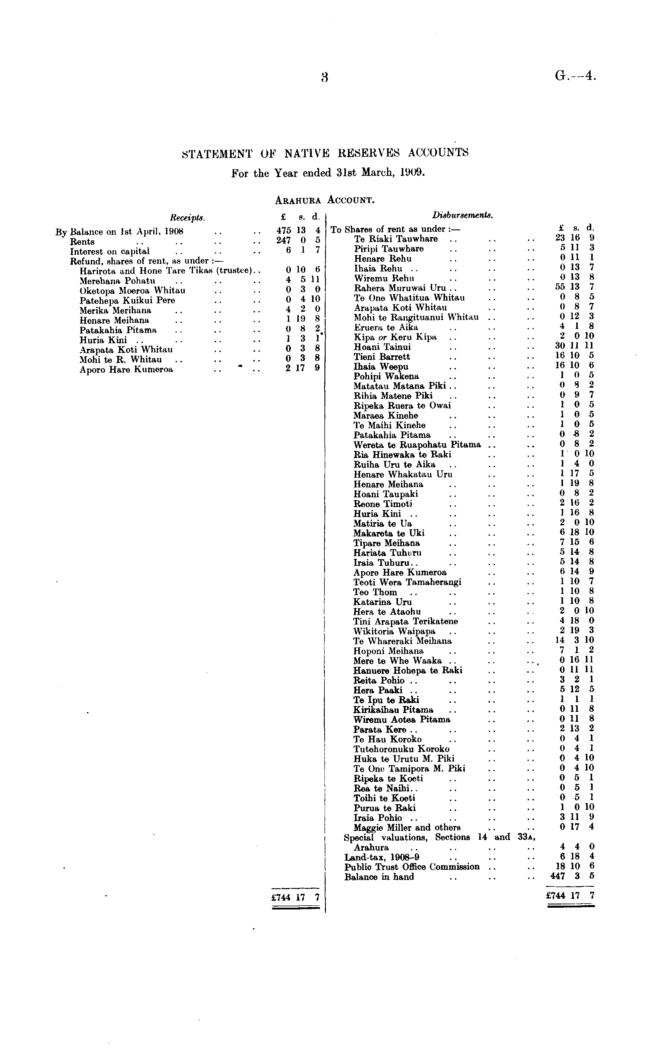 STATEMENT OF NATIVE RESERVES ACCOUNTS For the Year ended 31st March, 1909. Arahura Account. ~',_/,_. £ B. d. Disbursements. By Balance CO Ist April, 1908 .. •■ 475 13 4 To Shares of rent as under :— £ a<L Rents .. .. .. 247 o 5 Te Riaki Tauwhare .. .. .. 23 L 6 9 Interest on capital .. .. li I 7 Piripi Tauwhare .. .. .. 3 Refund, shares of rent, as under:— Henare Rehu .. .. 0 111 llarirota and Hone Tare Tikas (trust, c).. 0 10 6 ll.aiaßehu .. Merehana Pohatu .. .. .. 4 5 11 \\ ircniu Helm .. .. .. 0 13 8 Oketopa Moeroa Whiten .. •• 03 0 ______ Muruwai Uru.. .. .. 66 18 / Patehepa Kuikui Pere .. .. 04 10 Te One Whatttua Whrtau .. .. 08 5 ______ Meviliana .. .. .. 12 0 A rapata Kelt Whitan .. .. 0 8 7 Henare Meihana 1 19 8 Mol.i te Hangituanui Wlittau .. .. 012 3 Patakahia I'itama 0 8 2 Eruera te Aika 4 1 8 HuriaKini 13 1 Kipa or Kern Kxpa 2 010 V.mataKoti Whitan .. .. 0 3 8 Hoani lamui 30 11 11 \lohi te R. Whitau 0 3 8 Tiem Barrett 10 10 a Aporo Hare Kumeroa .. * .. 217 9 Ihaia Weepu 16 10 6 1 Pohipi Wakena .. .. 10 6 Matatau Matana I'iki .. .. .. 0 8 2 Kiliia Matene Piki .. .. .. 0 9 7 Ripeka Ruera te Owai .. .. 10 5 Maraea Kinehe .. .. .. 10 5 Te Maihi Kinehe 10 5 Patakahia Pitama .. .. .. 0-8 2 Wereta te Kua pohatu Pitama .. .. 0 8 2 Ria Hinewaka te Raki .. .. 1 0 10 Kuiha Uru te Aika .. .. 14 0 Henare Wliakalan I'm .. .. 1 17 5 Henare Meihana .. .. .. 119 8 Hoani Taupaki .. .. .. 0 8 2 Reone Timoti .. .. 2 16 2 Huria Kini .. .. .. 1 16 8 Matiria te I .. .. 2 0 10 Makareta te Uki .. .. .. 8 18 10 Tipare Meihana .. .. .. 7 15 6 llariata ______ .. .. •• 5 14 8 Iraia ______. . .. • • 514 8 Apore Hare Kumeroa .. .. 614 9 Teoti Wera Tamaherangi .. .. 110 7 Teo Thorn .. .. .. 1 10 8 Katarina Uru .. .. .. 1 10 8 Il.i. te Ataohu .. .. 2 0 10 Tini Arapata Terikatene .. .. 4 18 0 Wikitoria Waipapa .. .. .. 2 19 3 Te Whareraki Meihana .. .. 14 310 Hoponi Meihana .. .. .. 7 12 Mero te Whe Waaka .. 0 16 11 Hanuere Hohepa te Raki .. 0 1111 Reita Pohio .. .. .. .. 3 2 1 Hera Paaki .. .. .. .. 5 12 5 Te Ipu te Raki .. .. .. 11l Kirikaihau Pitama .. .. 011 8 Wiremu Aotea Pitama .. .. 0 118 Parata Kere .. .. .. .. 2 13 2 Te Baa Koroko .. .. .. 0 4 1 Tutehoronuku Koroko .. .. 0 4 1 H uka te Urutu M. Piki .. .. 0 410 Te One Tamipora M. I'iki .. .. 0 4 10 Ripeka te K.Mti .. .. 0 5 1 ReateNaihi.. .. .. .. 0 5 1 Toihi te Koeti .. 0 5 1 Purua te Raki .. .. .. 1 0 10 Iraia Pohio .. .. .. .. 3 11 9 Maggie Miller and others .. 0 17 4 Special valuations, Sections 14 and 33a, Arahura .. .. .. 4 4 0 Land-tax, 1908-9 .. .. .. 618 4 Publio Trust Office Commission .. .. 18 10 6 Balance in hand .. .. 447 3 5 £744 17 7 £744 17 7