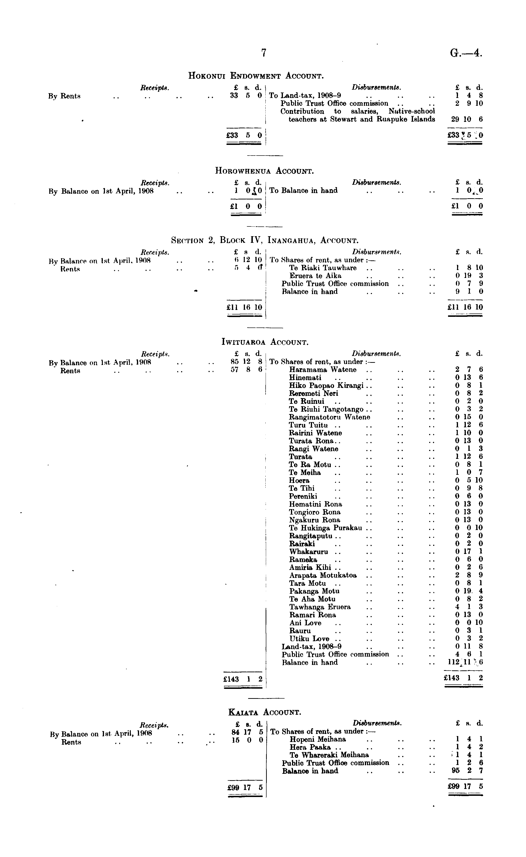 Hokonui Endowment Account. Receipts. £ s. d. Disbursements. £ s. d. By Rents .. .. .. 33 5 0 To Land-tax, 1908-9 .. 14 8 Public Trust Office commission .. .. 2 9 10 Contribution to salaries, Native-school . teachers at Stewart and Ruapuke Islands 29 10 6 £33 5 0 j £33? 5 ;0 Horowhenua Account. Receipts. £ s. d. i Disbursements. £ s. d. By Balance on Ist April, 1908 .. .. 1 o£o !To Balance in hand .. .. .. 1 0,0 £1 0 0 ! £10 0 Section 2. Block IV. [nanoahua, Account. Receipt*. £ s d. Disbursements. £ s. d. By Balance on Ist April. 1 90S .. .. 6 12 10 To Shares of rent, as under : — ' Rent. .. .. .. :, l (t Te Riaki Tauwhare .. .. .. 1 8 10 Eruera te Aika .. .. .. 019 3 Public Trust Office commission .. .. 0 7 9 * Balance in hand . . . . . . 9 10 £11 16 10 £11 16 10 Iwituaroa Account. lit nipt*. £ s. d. Disbursemmbt. £ s. d. By Balance on l_ April. 1908 .. •■ 85 12 8 To Shares of rent, as under :— Rents .. .. .. .. 57 8 6 | Haramama Watene .. .. .. 27 6 Hinemati .. .. .. .. 013 6 Hiko Paopao Kirangi .. .. .. 0 8 1 Reremeti Neri .. .. .. 0 8 2 Te Ruinui .. .. 0 2 0 Te Etiuhi Tangotango .. .. .. 0 3 2 Rangimatotoru Watene .. .. 015 0 Turn Tuitu .. .. .. 112 6 Rairini Watene .. .. .. 1 10 0 Turata Rona.. .. .. .. 0 13 0 Rangi Watene .. .. .. 0 13 Turata .. .. .. 1 12 6 Te Ra Motu .. .. .. 0 8 1 Te Meiha .. .. .. .. 10 7 Hoera 0 5 10 Te Tihi .. .. .. .. 0 9 8 Pereniki . . . . . . . . 0 6 0 Hematini Bona .. .. .. 0 13 0 Tongioro Rona .. .. .. 013 0 Ngakuru Rona .. .. .. 0 13 0 Te Hukinga Purakau . . .. 0 010 Rangitaputu .. .. .. 0 2 0 Rairaki .. .. .. 0 2 0 Whakaruru . . .. . . .. 017 1 Rameka .. .. .. .. 0 6 0 Amiria Kihi .. .. .. .. 0 2 6 Arapata Motukatoa .. .. .. 2 8 9 Tara Motu .. .. .. 0 8 1 Pakanga Motu .. .. .. 0 19 4 Te Aha Motu .. .. .. 0 8 2 Tawhanga Eruera .. .. .. 4 13 Ramari Rona .. .. .. 0 13 0 An] Love .. .. .. .. 0 0 10 Rauru .. .. .. .. 0 3 1 Utiku Love .. .. .. .. 0 3 2 Land-tax, 1908-9 .. .. .. 0 118 Public 'trust Office commission .. .. 4 6 1 Balance in hand .. .. .. 112 11 ii £143 1 2 £143 1 2 Kaiata Account. Receipts. £ s. d. Disbursements. £ a. d. By Balance on Ist April, 1908 .. .. 84 17 STo Shares of rent, as under :— Rents .. .. .. 15 0 0 Hopeni Meihana .. .. .. 14 1 Hera Paaka .. .. .. .. 14 2 Te Whareraki Meihana .. 14 1 Public Trust Office commission .. .. 12 6 Balance in hand .. .. .. 95 2 7 £99 17 5 £99 17 5