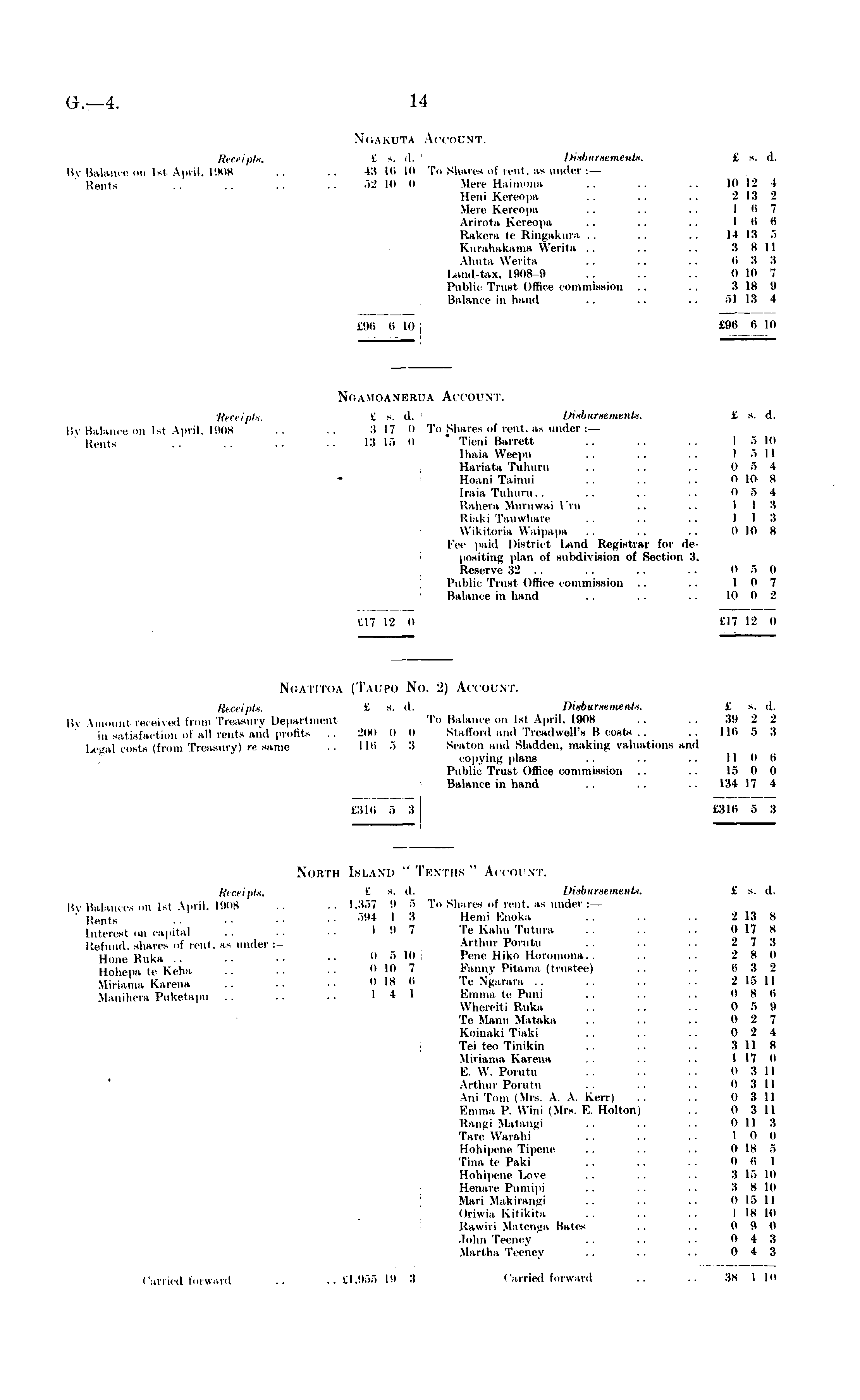 Ngakuta Account. Hi ri ipi*. _ s. d. Disbursements. £ s. <1. By Balance on Ist April, 1908 .. .. 43 16 10 To Shares of rent, as under:— Rents .. .. .. ■• 52 Hi o Mere Haimona .. .. .. lo 12 4 Heni Kereopa .. .. .. 213 2 Merc Kereopa . . . . . . 16 7 Arirota Kereopa .. .. .. 16 6 Bakera te Ringakura .. .. .. 14 13 6 Kurabakatna Werita .. .. .. 3 8 11 Ahuta Werita .. . . .. 6 3 3 Land-tax, 1908-9 .. .. 0 io 7 Public Trust Office commission .. .. 3 18 9 Balance in hand .. .. . . 51 13 4 £96 ii lv £96 6 io Ngamoanerua Account. Hi ft ipit. t s. d. I Disbursements. £ s. d. By Balance, on Ist April, 1908 .. •• 3 17 0 To ghares of rent, as under :— Rmts .. .. .. .. 13 15 0 ' Tieni Barrett .. .. .. I 510 Lhaifl Weepu . . . . . . 15 11 Hariata 'Tuhuru .. . . . . 0 5 4 * Hoani Tainui . . . . .. 010 8 Iraia Tuhuru. . .. . . .. ii 5 4 Rahera Muruwai Uru .. .. 113 Riaki 'Tauwhare . . . . .. 113 Wikitoria Waipapa .. .. .. 010 8 Fee paid District Land Registrar for depositing plan of subdivision of Section 3, Reserve 32 .. .. .. .. o 5 o Public Trust Office commission .. .. 10 7 Balance in hand .. .. .. 10 o 2 £17 12 0 £17 12 o Ngatitoa (Taupo No. 2) Account. Receipts. £ s - d. Disbursements. £ s. d. By Amount reoeived from Treasury Department To Balance on Ist April, 1908 .. .. 39 2 2 in satisfaction of all rents and profits 200 0 0 Stafford and Treadwsll's B costs .. .. 116 B 1 I ooete (from Treasury) rs same .. 116 6 :'. Beaton and Sladden, making valuations and oopying plans .. .. .. 11 0 6 Public 'Tne. Offioe commission .. .. 15 0 0 Balance in hand .. .. .. 134 17 4 £316 5 3 £316 5 3 North Island "Tenths" Account. Receipts* M s. cl. Disbursements. £ s. d. By Balance-.-on Ist April. P.ios .. .. 1.357 o 5 To Share- of rent, as under :— 1.,.,, t _ .. .. .. .. 594 I 3 Hemi Enoks .. .. .. 213 s Interest on capital •• •• •• 19 7 Te Kahu Tuturs .. .. .. o 17 8 Belun.l. shares of rent, a- under :— Arthur Porutu .. .. .. 2 7 3 Hone Buka .. .. •■ •• li 5 10 Pene Iliko Horouiona.. .. .. 2 8 0 Hohepa te Keha .. •• •• " "' " Fanny Pitama (trustee) .. .. 6 3 2 Miriama Karens •• •• •■ ° ls 8 Te Ngarara .. .. .. .. 2 15 11 Manihera Pnketapu .. .. •• 14 1 Emma te Puni .. .. .. o S 6 Whcreiti Buka .. .. .. 0 5 9 Te Mann Mataka .. . . .. 0 2 7 Kninaki Tiaki .. .. 0 2 4 Tei teo 'Tinikin .. .. .. 3 11 8 Miriama Karena .. .. .. 1 17 0 B. W. Porutu .. .. .. 0 3 11 Arthur Porutu . . .. .. 0 3 11 Ani 'T.uu (Mrs. A. A. Kerr) .. 0 3 11 Emma P. Wini (Mrs K. Holton) .. 0 3 11 Rangi Matangi .. .. .. 0 113 'Tare Warahi .. .. .. 10 0 Hohipcne Tipene .. .. .. 0 18 5 Tma te Paki .. .. .. 0 6 I llohipc-nc l..i\e . . . . . . 3 15 111 Henare Pumipi . . .. . . 3 8 111 Mari Makirangi .. .. .. 015 11 Oriwis Kitikita .. .. .. 1 18 10 Haw hi MatengS Bates .. .. II !l II John Teeney .. ■ • •• .48 Martha Teeney .. .. 0 4 3 Carried forward .. ..£1,956 19 3 Carried forward .. .. 38 1 lo