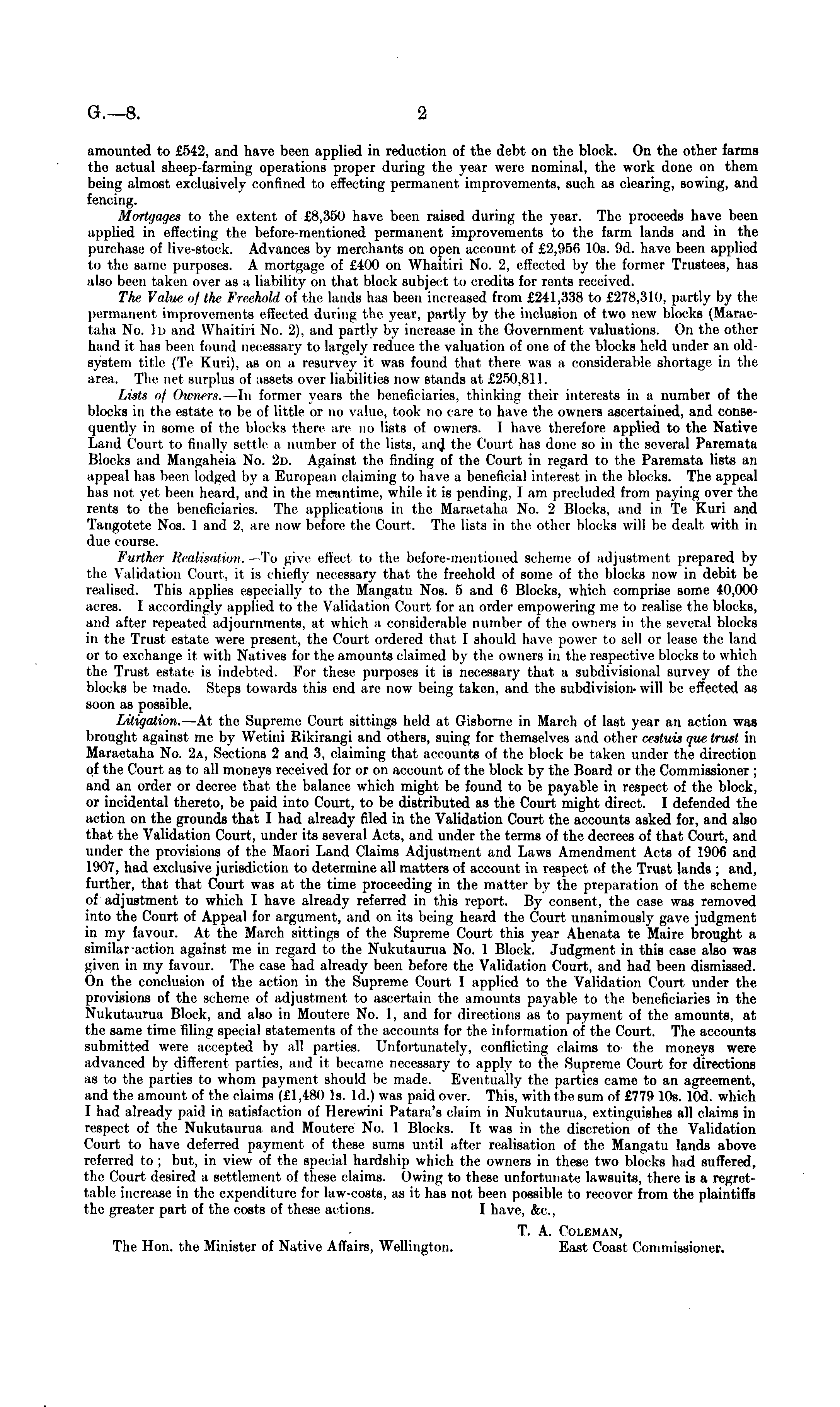 amounted to £542, and have been applied in reduction of the debt on the block. On the other farms the actual sheep-farming operations proper during the year were nominal, the work done on them being almost exclusively confined to effecting permanent improvements, such as clearing, sowing, and fencing. Mortgages to the extent of £8,350 have been raised during the year. The proceeds have been applied in effecting the before-mentioned permanent improvements to the farm lands and in the purchase of live-stock. Advances by merchants on open account of £2,956 10s. 9d. have been applied to the same purposes. A mortgage of £400 on Whaitiri No. 2, effected by the former Trustees, has also been taken over as a liability on that block subject to credits for rents received. The Value of the Freehold of the lands has been increased from £241,338 to £278,310, partly by the permanent improvements effected during the year, partly by the inclusion of two new blocks (Maine inlia No. Id and Wliaitiri No. 2), and partly by increase in the Government valuations. On the other band it lias been found necessary to largely reduce the valuation of one of the blocks held under an oldsystem title (Tc Kuri). as on a resurvev it was found that there was a considerable shortage in the area. The net surplus of assets over liabilities now stands at £250,811. Lists ni Owners. In former years the beneficiaries, thinking their interests in a number of the blocks in the estate to be of little or no value, took no care to have the owners ascertained, and consequently in some of the blocks there are no lists of owners. I have therefore applied to the Native Land Court to finally settle a number of the lists, and the Court has done so in the several Paremata Blocks and tfahgaheia No. 2n. Against the finding of the Court in regard to the Paremata lists an appeal has been lodged by a European claiming to have a beneficial interest in the blocks. The appeal has not yet been heard, and in the meantime, while it is pending, I am precluded from paying over the rents to the beneficiaries. The applications in the Haraetaha No. 2 Blocks, and in Te Kuri and Tangotete Nos. 1 and 2, are now before the Court. The lists in the other blocks will be dealt with in due course. Further Realisation. To give effect to the before-mentioned scheme of adjustment prepared by the Validation Court, it is chiefly necessary that the freehold of some of the blocks now in debit be realised. This applies especially to the Mangatu Nos. 5 and 6 Blocks, which comprise some 40,000 acres. 1 accordingly applied to tin , Validation Court for an order empowering me to realise the blocks, and after repeated adjournments, at which a considerable number of the owners in the several blocks in the Trust estate were present, the Court ordered that 1 should have power to sell or lease the land or to exchange it with Natives for the amounts claimed by the owners in the respective blocks to which the Trust estate is indebted. For these purposes it is necessary that a subdivisional survey of the blocks be made. Steps towards this end are now being taken, and the subdivision-will be effected as soon as possible. Litigation. —At the Supreme Court sittings held at Gisbome in March of last year an action was brought against me by Wetini Rikirangi and others, suing for themselves and other cestuis que trust in Maraetaha No. 2a, Sections 2 and 3. claiming that accounts of the block be taken under the direction of the Court as to all moneys received for or on account of the block by the Board or the Commissioner ; and an order or decree that the balance which might be found to be payable in respect of the block, or incidental thereto, be paid into Court, to be distributed as the Court might direct. I defended the action on the grounds that I had already filed in the Validation Court the accounts asked for, and also that the Validation Court, under its several Acts, and under the terms of the decrees of that Court, and under the provisions of the Maori Land Claims Adjustment and Laws Amendment Acts of 1906 and 1907, had exclusive jurisdiction to determine all matters of account in respect of the Trust lands ; and, further, that that Court was at the time proceeding in the matter by the preparation of the scheme of adjustment to which I have already referred in this report. By consent, the case was removed into the Court of Appeal for argument, and on its being heard the Court unanimously gave judgment in my favour. At the March sittings of the Supreme Court this year Ahenata te Maire brought ■■> similar-action against mo in regard to the Nukutaurua No. 1 Block. Judgment in this case also was given in my favour. The case had already been before the Validation Court, and had been dismissed. On the conclusion of the action in the Supreme Court I applied to the Validation Court under the provisions of the scheme of adjustment to ascertain the amounts payable to the beneficiaries in the Nukutaurua Block, and also in Moutere No. 1, and for directions as to payment of the amounts, at the same time filing special statements of tin , accounts for the information of the Court. The accounts submitted were accepted by all parties. Unfortunately, conflicting claims to the moneys were advanced by different parties, and it became necessary to apply to the Supreme Court for directions as to the parties to whom payment should lie made. Eventually the parties came to an agreement, and the amount of the claims (£1,480 Is. Id.) was paid over. This, with the sum of £779 10s. 10d. which I had already paid in satisfaction of llerewini Patara's claim in Nukutaurua. extinguishes all claims in respect of the Nukutaurua am) Moutere No. 1 Blocks. It was in the discretion of the Validation Court to have deferred payment of these sums until after realisation of the Mangatu lands above referred to: but. in view of tin' special hardship which the owners in these two blocks had suffered, the Court des