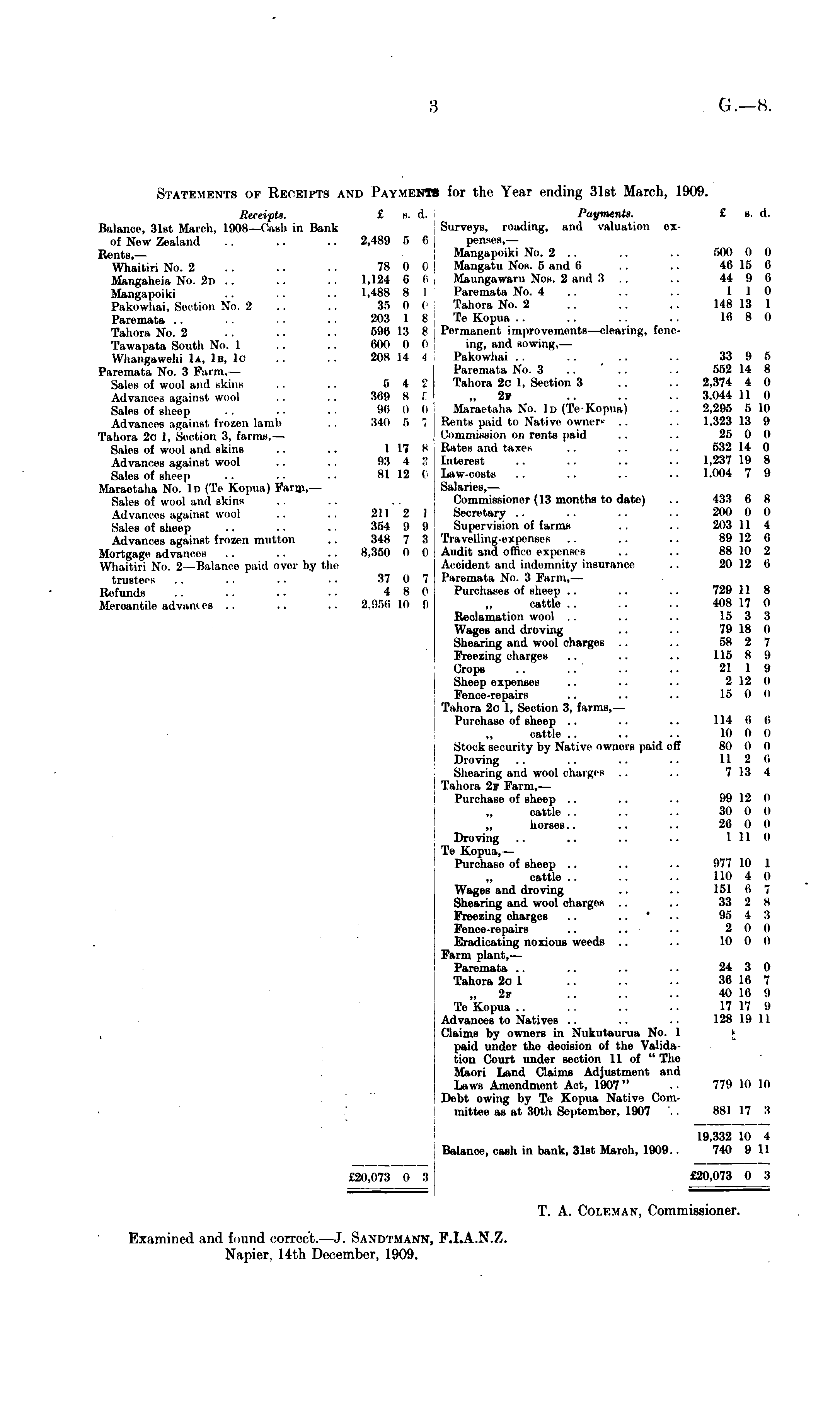Statements ov Rbckipts and I'aymentb for the Year ending 31st March, 1909. Receipts. £ »■ <l Payments. £ s. d. Balance, 31et March, 1008 —CW» in Bank Surveys, reading, and valuation exof NVw Zealand .. .. .. 2,489 6 t penees,—Rente, Mangapoiki No. 2 .. .. .. i>oo 0 0 Whaitiri No. 2 .. .. .. 78 0 (. Mangatu Noh. 5 and 6 .. .. Hi lf> (i .Mangahcia No. 2i> .. .. .. 1,124 6 6 Maungawaru Nos. 2 and 8 .. .. 44 9 6 Mangapoiki .. .. • • 1,488 8 1 Pareinata No. 4 .. .. 110 Pakowhai, Section No. 2 .. .. 35 0 C Tahora No. 2 .. .. .. 148 13 1 Paremata .. .. .. .. 203 1 8 Te Kopua .. .. .. .. Hi 8 0 Tahora No. 2 .. .. .. 691 13 8 Permanent improvement! —olearing, fenoTawapata South No. 1 .. .. 600 0 0 ing, and sowing,— Whangawehi lα, Iβ, lo .. .. 208 14 4 Pakowhai .. .. .. .. 33 9 5 Paremata No. 3 Farm,— Paremata No. 3 .. .. .. 552 14 8 Sales of wool and skira .. .. 5 4 2 Tahora 2c I, Section 3 .. .. 2.374 4 0 Advanced against wool .. .. 369 8 i 2f .. .. .. 3.044 11 0 Sales of sheep .. .. .• Bβ 0 0 Maraetaha No. Id (Te-K.opua) .. 2.205 510 Advances against frozen lamb .. 840 6 " Rente paid to Native owner" .. .. 1,323 13 9 Tahora So 1, Seotion 3, farms, — Commission on rents paid .. .. 25 0 0 Sales of wool and skins .. .. 117 S Rates and taxes .. .. .. 532 14 0 Advances against wool .. .. 93 -I 3 Interest .. .. .. .. 1,237 19 8 Sales of sheep .. .. .. 81 12 d Law-costs .. .. .. .. 1.004 7 0 Maraotaha No. Id ('IV Kopua) Farm,— Salaries,— Sales of wool and skim .. .. .. Oommiesioner (1$ months to date) .. 433 6 8 Advances against «"«'! .. .. 211 2 1 Secretary .. .. .. .. 200 0 0 Sales of sheep .. .. •• 864 v !i Supervision of farms •• •• 203 11 4 Advances against frocen mutton .. 348 7 3 Travelling-expenses .. .. .. 89 12 (> Mortgage advances .. .. .. 8,880 0 0 Audit and omoe expenses .. .. 88 10 2 Whaitiri No. 2 Balance paid over liy the I Accident and indemnity insurance . . 20 12 ii trustees .. .. .. .. 37 0 7 Paremata No. 3 Farm,— Refunds .. .. •• •• 4 8 0 Purchases of sheep .. .. .. 729 11 8 Mercantile adTamei .. .. .. 2,95f>10 0 „ oattle.. .. .. 408 17 0 Reclamation wool . . .. .. 15 3 3 Wages and droving .. .. 79 18 0 Shearing and wool charges .. .. 58 2 7 Freezing charges .. .. .. 115 8 !) Crops 21 1 9 Sheep expenses .. .. .. 212 0 Fence-repairs .. .. .. 15 0 0 Tahora 2c 1, Section :!, fauna, — Purchase of sheep .. .. .. 114 l> ti oattle .. .. .. 10 0 0 Stock security by Native owners paid ofl 80 0 0 Droving .. .. .. .. 11 2 (i Shearing and wool charges . . .. 7 13 4 Tahora 2f Farm,— Purchase of sheep .. .. .. 99 I- , i> cattle .. .. .. 30 0 0 „ horses.. .. .. 26 0 0 Droving .. .. .. .. 1 11 0 Te Kopua,— Purchaso of sheep .. .. .. 977 10 1 cattle .. .. .. 110 4 0 Wages and droving .. .. 151 v 7 Shearing and wool charges .. .. 33 2 8 Freezing charges .. .. .. 9f> 4 li Fence-repairs .. .. •■ 2 0 0 Eradicating noxious weeds .. .. 10 0 0 Farm plant,— Paremata .. .. .. .. 24 3 0 Tahora 2o 1 .. .. .. 36 16 7 2f .. .. .. 40 16 9 Te Kopua .. .. .. .. 17 17 9 Advances to Natives .. .. .. 128 lit 11 , Claims by owners in Nukutaurua No. 1 paid under the decision of the Validation Court under section 11 of " Tho Maori Land Claims Adjustment and Laws Amendment Act, 1907" .. 779 10 10 Debt owing by Te Kopua Native Committee as at 30th September, 1907 '.. 881 17 3 19,332 10 4 Balance, caeh in bank, 31st March, 1909.. 740 9 11 £20.073 0 3 £20,073 0 3 T. A. Coleman, Commissioner. Examined and found correct. — J. Sandtmann, F.I.A.N.Z. Napier, 14th December, 1909.