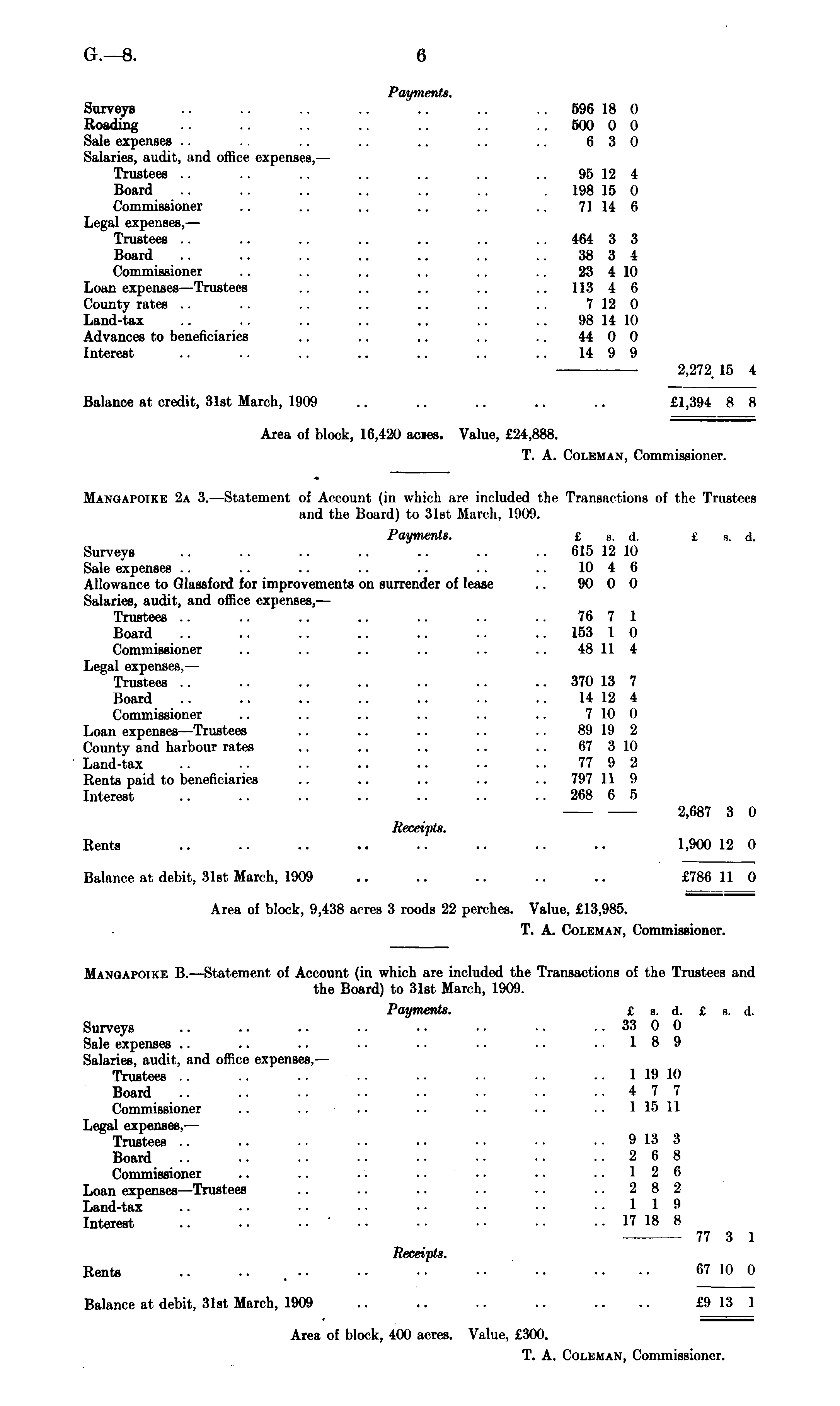 Payments. Surveys .. .. .. .. .. .. 596 18 0 Roading .. .. .. .. .. .. ..50000 Sale expenses .. .. .. .. .. .. .. 6 3 0 Salaries, audit, and office expenses,— Trustees .. .. .. .. .. .. .. 95 12 4 Board .. .. .. .. .. .. . 198 15 0 Commissioner .. .. .. .. .. .. 71 14 6 Legal expenses, — Trustees .. .. .. .. .. .. 464 3 3 Board .. .. .. .. .. .. .. 38 3 4 Commissioner .. .. .. .. .. .. 23 4 10 Loan expenses —Trustees .. .. .. .. .. 113 4 6 County rates .. .. .. .. .. .. .. 7 12 0 Land-tax .. .. .. .. .. .. .. 98 14 10 Advances to beneficiaries .. .. .. .. .. 44 0 0 Interest .. .. .. .. .. .. .. 14 9 9 2,272 15 4 Balance at credit, 31st March, 1909 .. .. .. .. .. £1,394 8 8 Area of block, 16,420 acies. Value, £24,888. T. A. Colkman, Commissioner. Manqapoike 2a 3.—Statement of Account (in which are included the Transactions of the Trustees and the Board) to 31st March, 1909. Payments. £ s. d. £ s. d. Surveys .. .. .. .. .. .. .. 615 12 10 Sale expenses .. .. .. .. .. .. .. 10 4 6 Allowance to Glassford for improvements on surrender of lease .. 90 0 0 Salaries, audit, and office expenses,— Trustees .. .. .. .. .. .. .. 76 7 1 Board .. .. .. .. .. .. 153 1 0 Commissioner .. .. .. .. .. .. 48 11 4 Legal expenses, — Trustees .. .. .. .. .. .. .. 370 13 7 Board .. .. .. .. .. .. .. 14 12 4 Commissioner .. .. .. .. .. .. 7 10 0 Loan expenses—Trustees .. .. .. .. .. 89 19 2 County and harbour rates .. .. .. .. .. 67 3 10 Land-tax .. 77 9 2 Rents paid to beneficiaries .. .. .. .. .. 797 11 9 Interest 268 6 5 2,687 3 0 Receipts. Rents .. .. .. .. .. .. .. .. 1,900 12 0 Balance at debit, 31st March, 1909 .. .. .. .. .. £786 11 0 Area of block, 9,438 acres 3 roods 22 perches. Value, £13,985. T. A. Coleman, Commissioner. Mangapoike B. —Statement of Account (in which are included the Transactions of the Trustees and the Board) to 31st March, 1909. Payments. £ s. d. £ s. d. Surveys .. .. .. .. •• •• •• .. 33 0 0 Sale expenses .. .. .. .. .. .. .. ..189 Salaries, audit, and office expenses, — Trustees 1 19 10 Board 477 Commissioner .. .. .. .. .. .. 1 15 11 Legal expenses, — Trustees .. .. .. • • • • ■ • ■. .. 913 3 Board .. .. ■• •• •• •• •• ..268 Commissioner .. .. .. .. .. .. ..126 Loan expenses—Trustees .. .. .. .. .. ..282 Land-tax 119 Interest ' 17 18 8 77 ft 1 Receipts. Rents .. .. 67 Xi (i Balance at debit, 31st March, 1909 .. .. .. .. .. .. £9 13 1 Area of block, 400 acres. Value, £300. T. A. Coleman, Commissioner.