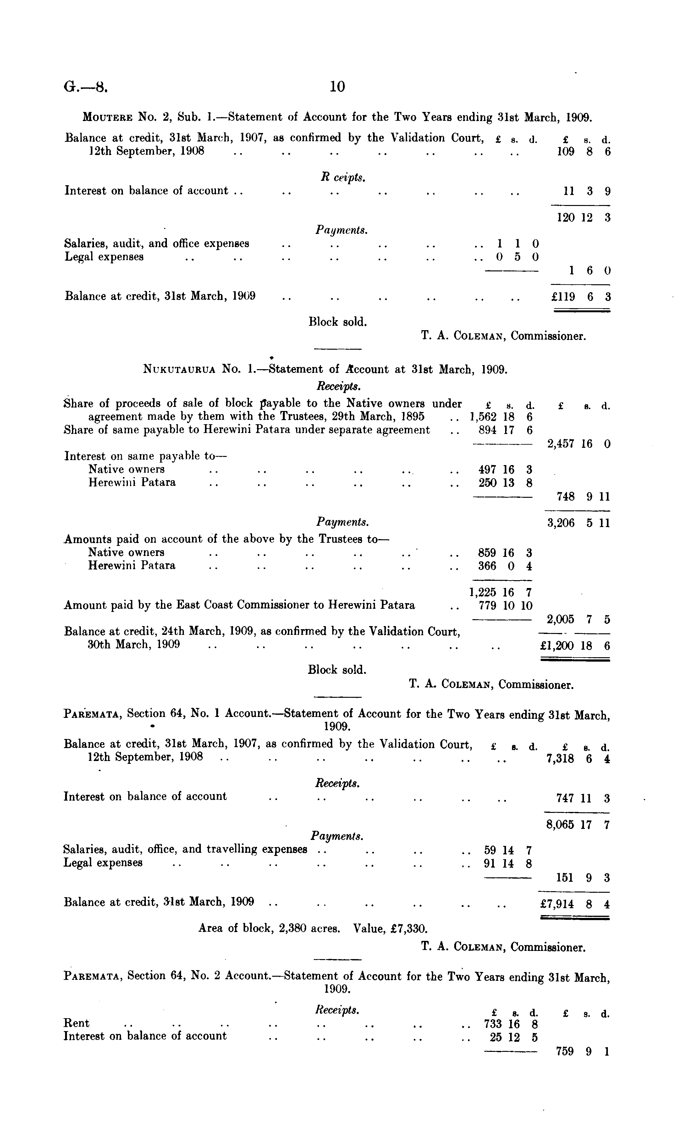 Moutere No. 2, Sub. 1. —Statement of Account for the Two Yean ending 31st March, 1909. Balance at credit, 31st March, 1907, as confirmed by the Validation Court, £ s. d. £ s. d. 12th September, 1908 .. .. .. .. .. .. .. 109 8 6 R ceipts. Interest on balance of account .. .. .. .. .. .. .. 1139 120 12 3 Payments. Salaries, audit, and office expenses .. .. .. .. ..110 Legal expenses .. .. .. .. .. .. ..050 — 1 6 0 Balance at credit, 31st March, I!)<>9 .. .. .. .. .. .. £119 6 3 Block sold. T. A. Co Lkm ax. Commissioner. Nukutaurua No. I.—Statement of Account at 31st March, 1909. Receipts. Share of proceeds of sale of block payable to the Native owners under £ s . d. £ c. d. agreement made by them with the Trustees, 29th March, 1895 .. 1,562 18 6 Sli;ire of same payable to Herewini Patara under separate agreement .. 894 17 6 2,457 16 0 Interest on same payable to — Native owners .. .. .. .. .. .. 497 16 3 Herewini I'atara .. .. .. .. .. 250 13 8 748 9 11 Payments. 3,206 5 11 Amounts paid on account of the above by the Trustees to — Native owners .. .. .. .. .. .. 859 16 3 Herewini Patara .. .. .. .. .. 366 0 4 1,225 16 7 Amount paid by the East Coast Commissioner to Herewini Patara .. 779 10 10 2,005 7 5 Balance at credit, 24th March, 1909, as confirmed by the Validation Court, 80th March, 1909 .. .. .. .. .. .. .. £1,200 18 6 Block sold. T. A. Coleman, Commissioner. Par'emata, Section 64, No. 1 Account. —Statement of Account for the Two Years ending 31st March 1909. Balance at credit, 31st March, 1907, as confirmed by the Validation Court, £ c. d. £ c d 12th September, 1908 .. .. .. .. .. .. .. ' ' 7,318 6 4 Receipts. Interest on balance of account .. .. .. .. .. .. 747 \\ 3 8,065 17 7 Payments. Salaries, audit, office, and travelling expenses .. .. .. .. 59 14 7 Legal expenses .. .. .. .. .. .. .. 91 14 8 151 9 3 Balance at credit, 31st March, 1909 .. . . .. .. .. .. £7,914 8 4 Area of block, 2,380 acres. Value, £7,330. T. A. Coleman, Commissioner. Paremata, Section 64, No. 2 Account. —Statement of Account for the Two Years ending 31st March 1909. Receipts. £ s. d. £ 3. d. Rent .. .. .. .. .. .. .. .. 733 16 8 Interest on balance of account .. .. .. .. 25 12 5 759 9 1
