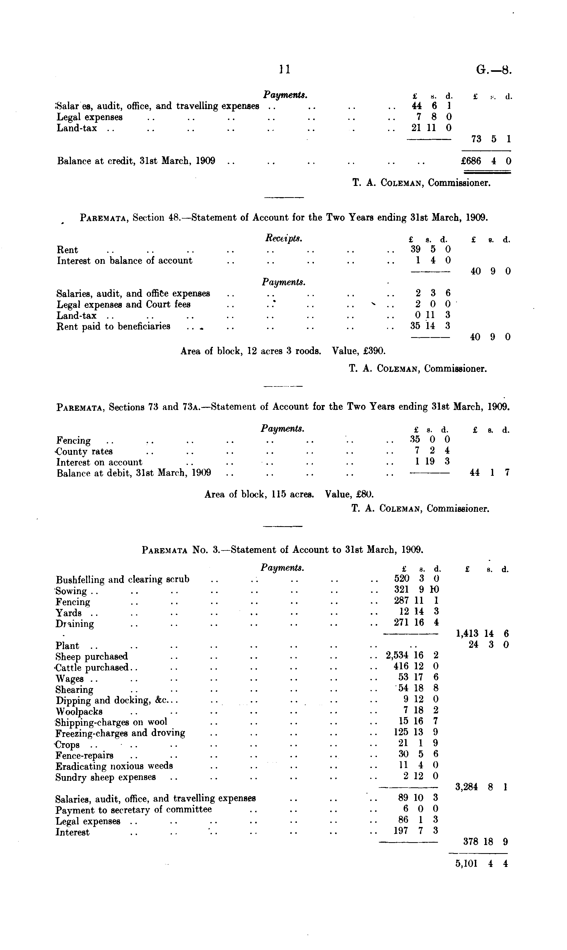 Payments. i c. d. £ h. d. Sjilar'es, audit, office, and travelling expenses .. .. .. 44 6 1 Legal expenses .. .. .. .. .. .. .. 780 Land-tax .. .. .. .. .. .. . 21 11 0 73 5 1 Balance at credit, 31st March, 1909 .. .. .. .. .. .. £686 4 0 T. A. Colemax, Commissioner. Paremata, Section 48. —Statement of Account for the Two Years ending 31st March, 1909. Receipts. £ s. d. £ s. d. Rent .. .. .. .. .. .. .. .. 39 5 0 Interest on balance of account .. .. .. .. .. 140 40 9 0 Payments. Salaries, audit, and office expenses .. .. .. .. .. 236 Legal expenses and Court fees .. ." .. .. * .. 2 0 0" Land-tax .. .. .. .. .. .. .. .. 0 11 3 Rent paid to beneficiaries ... .. .. .. .. . . 35 14 3 40 9 0 Area of block, 12 Hires 3 roods. Value, £390. T. A. Colemax, Commissioner. Paremata, Sections 73 and 73a. —Statement of Account for the Two Years ending 31st March, 1909. Payments. £ s. d. £ s. d. Fencing .. .. .. .. .. •. • ■ 35 0 0 ■County rates .. .. .. .. .. .. .. 724 Interest on account .. .. .. .. .. .. 119 3 Balance at debit, 31st March, 1909 .. .. .. .. .. ■ 44 1 7 Area of block, 115 acres. Value, £80. T. A. Colemax, Commissioner. Paremata No. 3.—Statement of Account to 31st March, 1909. Payments. £ s. d. £ s. d. Bushfelling and clearing scrub .. . . .. .. .. 520 3 0 Sowing .. 321 9 10 Fencing 287 11 1 Yards .. .. •• ■ ■ •• •• •■ •• 12 14 3 Draining 271 16 4 1,413 14 6 Plant .. .. •• .. •■ •• ■■ •• ■■ 24 3 0 Sheep purchased .. .. .. .. .. • • 2,534 16 2 Cattle purchased. . •• ■■ •• •• •• •• 416 12 0 Wagea .. • ■ • • • • • • • • • • • • 53 17 6 Shearing .. .. •■ •• •• ■• •• 54 18 8 Dipping and docking, &c... .. .. .. .. ■• 9 12 0 Woolsacks .. .. ■■ •• •• •• •• 7 18 2 Shipping-charges on wool .. .. .. .. .. 15 16 7 Freezing-charges and droving .. .. .. .. 125 13 9 Crops .. 21 1 9 Fence-repairs .. .. • • • ■ ■ • • • • • 30 5 6 Eradicating noxious weeds .. .. .. .. .. 114 0 Sundry sheep expenses .. .. .. •• .. •• 212 0 3,284 8 1 Salaries, audit, office, and travelling expenses .. .. .. 89 10 3 Payment to secretary of committee .. .. .. .. 6 0 0 Legal expenses .. .. • • • • • • • • • • 86 1 3 Interest .. .. '.. •• •• ■• .. 197 7 3 378 18 9 5,101 4 4