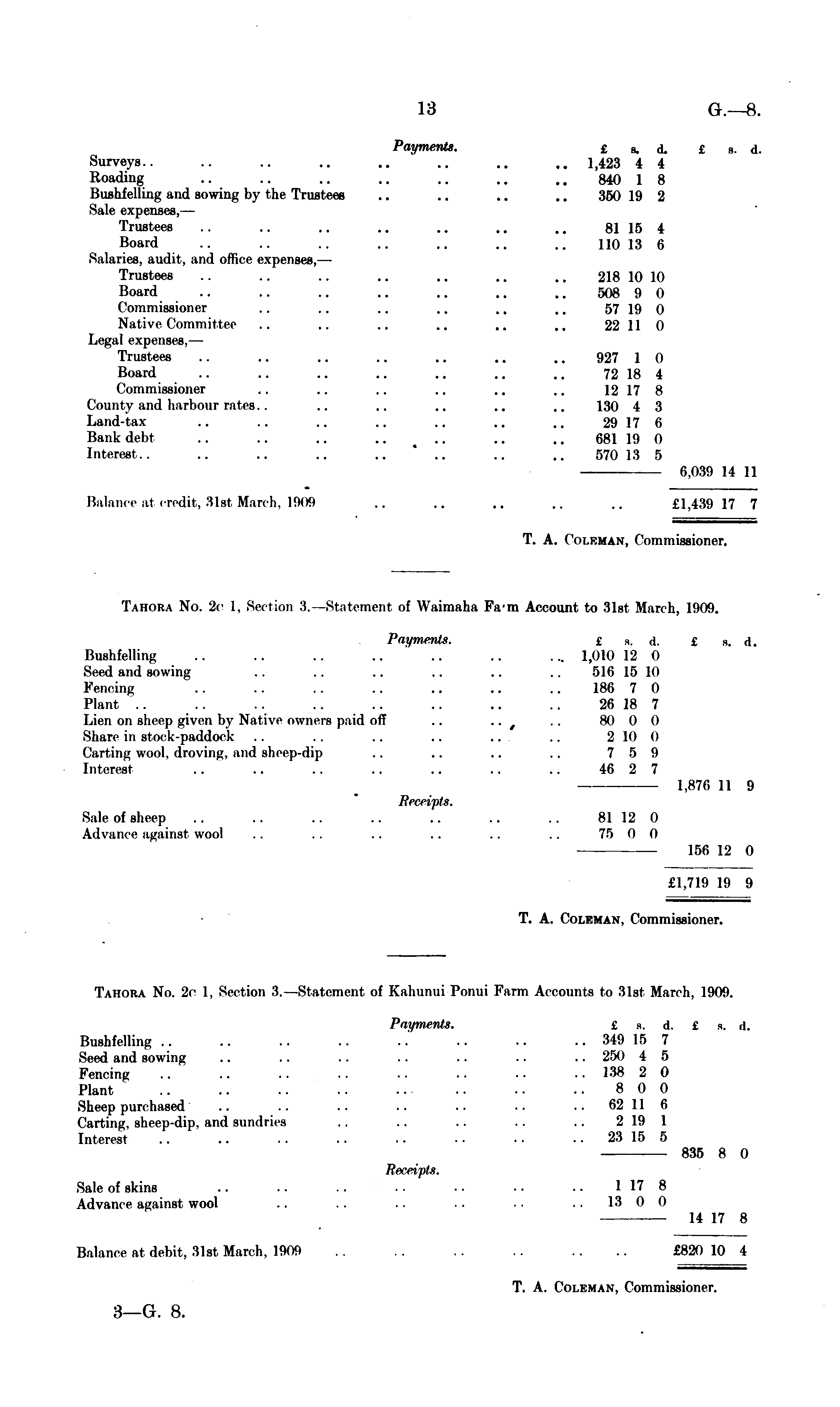 Payments. £ s. d. £ s. d, Surveys.. .. .. .. .. .. .. .. 1,423 4 4 Roading .. .. .. .. .. .. ~ 840 1 8 Bushfelling and sowing by the Trustees .. .. .. .. 350 19 2 Sale expenses,— Trustees .. .. .. .. .. .. .. 81 15 4 Board .. .. .. .. .. .. .. 110 13 (i Salaries, audit, and office expenses, — Trustees .. .. .. .. .. .. .. 218 10 10 Board .. .. .. .. .. .. .. 506 9 0 Commissioner .. .. .. .. .. .. 57 19 0 Native Committee .. .. .. .. .. .. 22 11 0 Legal expenses, — Trustees .. .. .. .. .. .. .. 927 1 0 Board .. .. .. .. .. .. .. 72 18 4 Commissioner .. .. .. .. .. .. 12 17 8 County and harbour rates. . .. .. .. .. .. 130 4 3 Land-tax .. .. .. .. .. .. .. 29 17 6 Bank debt .. .. .. .. .. .. .. 681 19 0 Interest. . .. .. .. .. .. .. .. 570 V-\ 5 6,089 14 1] Balance at credit, 31st March, 1909 .. .. .. .. .. £1,439 17 7 T. A. Coi.eman, Commissioner. Tahora No. 2c 1. Section 3. —Statement of Waiinnha Fa'm Account to 31st March, 1909. Payment*. £ ■. & £ s . d. Bnahfelling .. .. .. .. .. .. ... 1,010 12 0 Seed and .sowing .. .. .. .. .. .. 51(i Lβ l<l Fencing .. .. .. .. .. .. .. LB6 7 0 Plant . . .. .. .. .. .. .. .. 26 18 7 Lien on sheep given by Native owners paid of! .. .. / .. 80 0 0 Share in stock-paddock .. .. .. .. .. .. 210 0 Carting wool, droving, and sheep-dip .. .. .. .. 7 5 9 Interest .. .. .. .. .. .. .. 46 2 7 1,870 11 9 Receipts. Sale of sheep .. .. .. .. .. .. .. 81 12 0 Advance against wool .. .. .. .. .. .. 75 0 0 156 12 0 £1,719 19 9 T. A. Coleman, Commissioner. Tahora No. 2c 1, Section 3.—Statement of Kalmnui Ponui Farm Accounts to 31st March, 1900. Payments. £ ■. d. t *. <i. Bushfelling 349 15 7 Seed and sowing .. .. .. .. .. .. .. 250 4 5 Fencing 138 2 0 Plant 800 Sheep purchased .. .. .. .. .. ■. .. 62 11 6 Carting, sheep-dip, and sundries .. .. .. .. .. 219 1 Interest .. .. .. .. .. .. .. .. 23 15 5 835 8 0 Receipts. Sale of skins .. .. .. .. •■ •• .. I 17 8 Advance against wool .. . . .. .. • • 13 0 0 14 17 8 Balance at debit, 31st March, 1909 .. .. .. .. .. .. £820 10 4 T. A. Coleman, Commissioner.