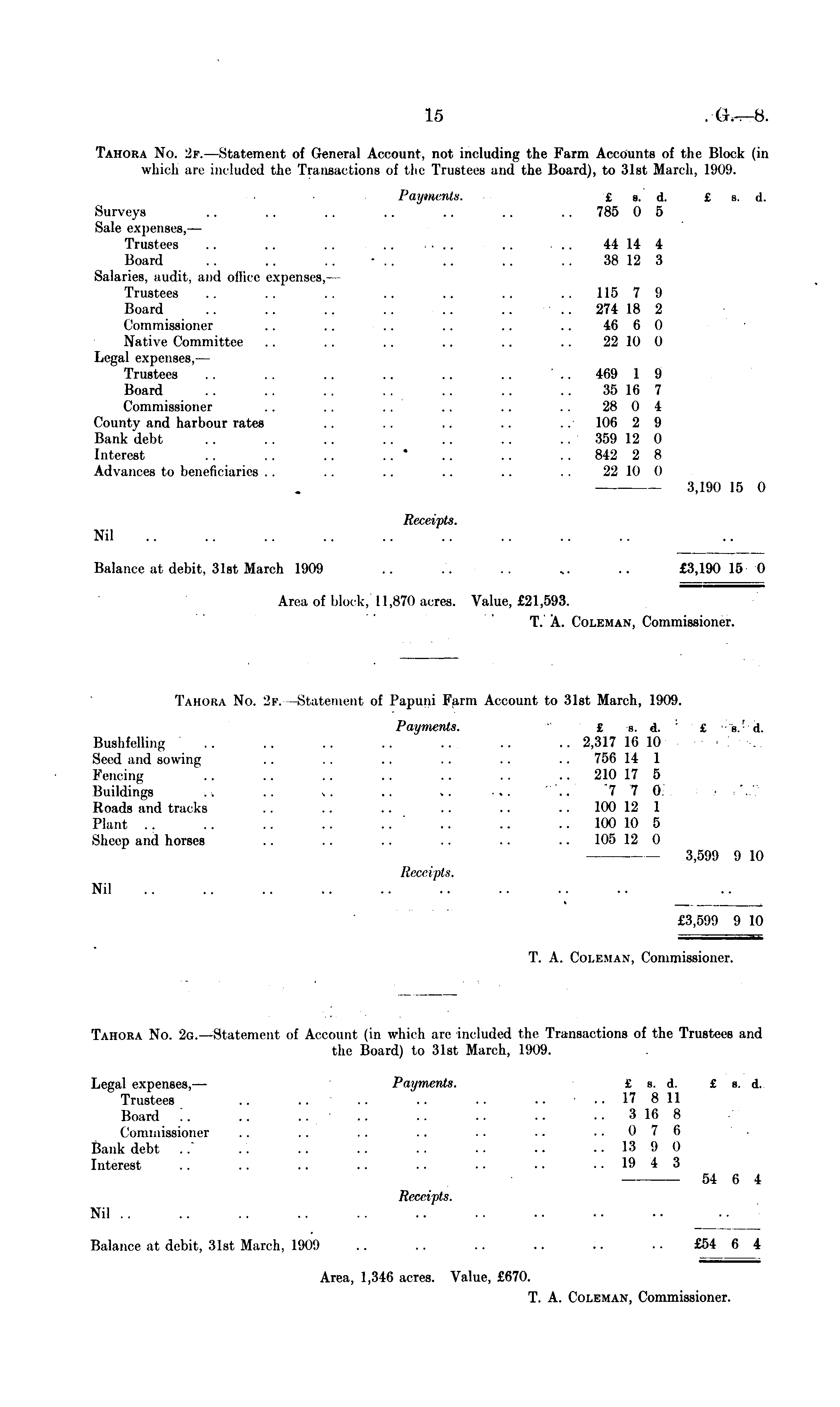 Tahora No. 2f. Statement of General Account, not including the Farm Accounts of the Block (in which arc included the Transactions of the Trustees and tin . Board), t<> 'list March, 1909. Payments. t s. a. £ a. d. Surveys . . . . . . . . . . . . 785 0 5 Sale expenses, — Trustees . . . . . . . . . . . . . . 4-1 14 4 Board .. .. .. ■ .. .. .. .. 38 12 3 Salaries, audit, and office expenses,— Trustees .. .. .. .. .. .. .. 115 7 !) Board .. .. .. .. .. .. 274 18 2 Commissioner .. .. .. .. .. .. 46 (i o Native Committee .. .. .. .. .. .. 22 10 0 Legal expenses, — Trustees .. .. .. .. .. .. 469 1 9 Beard .. .. .. .. .. .. .. 35 16 7 (lommissioner .. .. .. .. .. .. 28 0 4 County and harbour rates .. . . ~ .. .. 106 2 9 Bank debt .. .. .. .. .. .. .. • 359 12 0 Interest .. .. .. .. " .. .. 842 2 8 Advances to beneficiaries . . .. .. .. .. .. 22 10 0 3,190 16 o Receipts. Nil I;.ilance at debit, 31st March 1909 .. .. .. ... .. £3,190 15 0 Area of block, 1*1,870 acres, Value, £21,593. T. A. Coleman, Commissioner. Taiicika No. 2f. Statement of I'apuni Kami Account to -'ilst March, lOOi). Payments. £ s. d. t H. d. Bushfelling .. .. .. .. .. .. .. 2,317 16 10 Seed and sowing .. .. .. .. .. .. 756 14 1 Fencing .. .. .. .. .. .. .. 210 17 5 Buildings .. .. .. .. .. .. .. 7 7 0 Roads and tracks . . . . .. . . .. . . 100 12 1 Plant .. .. .. .. .. .. .. .. 100 10 5 Sheep and horses .. .. .. .. .. 105 12 0 3,599 9 10 Receipts. Nil £3,599 9 10 T. A. CoLEMAN, Commissioner. Tahora No. 2g.—Statement of Account (in which are included the Transactions of the Trustees and the Board) to 31st March, 1909. Legal expenses, — Payments; £ c. d. £ s. A. Trustees ' 17 8 11 Hoard 3 16 8 Commissioner .. .. .. .. ■ • • ■ .. 0 7 (i Hank debt 13 9 0 Interest .. .. .. .. .. .. .. .. 19 4 3 54 6 4 Receipts. Nil Balance at debit, Slst March, 1909 .. .. •• •• ■■ •• £54 6 4 Area. 1,346 acres. Value, £670. T. A. Coleman, Commissioner.