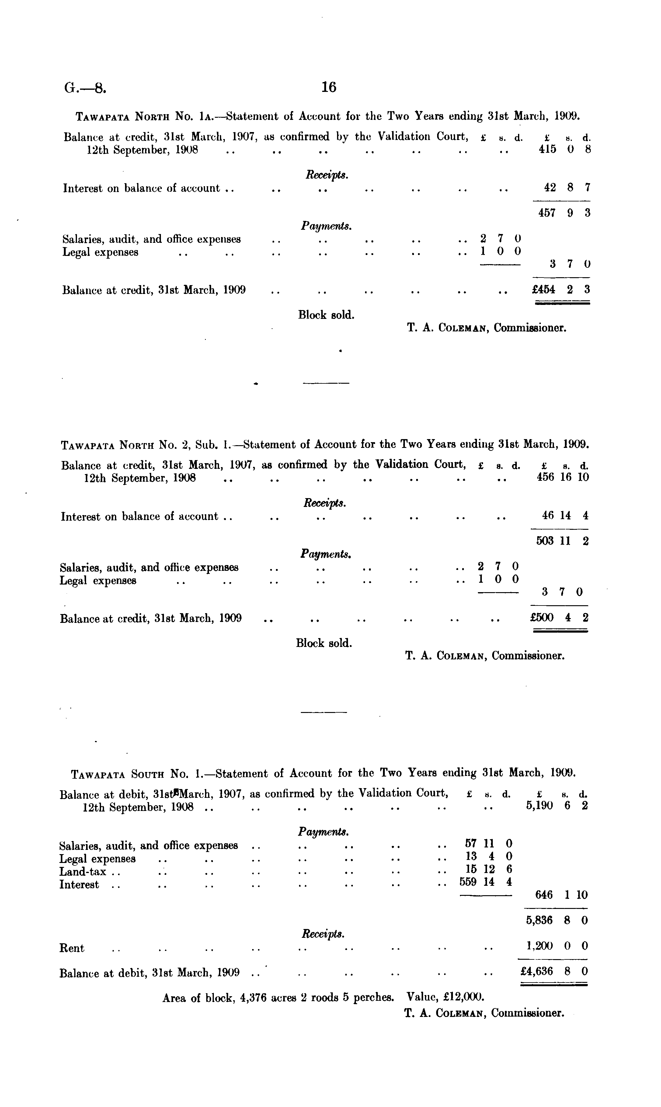 Tawapata North No. Iα. — Statement of Account for the Two Years ending 31st March, 1909. Balance ai credit, Slei March, 1907, aa confirmed by the Validation Court, £ ». d. £ s. d. 12th September, 1908 .. .. .. .. .. .. .. 415 0 8 Receipts. Interest on balance of account .. .. .. .. .. .. .. 42 8 7 457 9 3 Payments. Salaries, audit, and office expenses .. .. .. .. .. 2 7 <> Legal expenses .. .. .. .. .. .. ..100 3 7 0 Balance at credit, 31st March, 1909 .. .. .. .. .. .. £454 2 3 Block sold. T. A. Coleman, Commissioner. ■ Tawapata North No. 2, Sub. I.—Statement of Account for the Two Years ending 31st March, 1909. Balance at credit, 31st March, 1907, as confirmed by the Validation Court, £ 8 . d. £ ». d. 12th September, 1908 .. .. .. .. .. .. .. 456 16 10 Receipts. Interest on balance of account .. .. .. .. .. .. .. 46 14 4 503 11 2 Payments. Salaries, audit, and office expenses .. .. .. .. ..270 Legal expenses .. .. .. .. •. •• ..100 3 7 0 Balance at credit, 31st March, 1909 .. .. .. .. .. .. £500 4 2 Block sold. T. A. Coleman, Commissioner. Tawapata South No. I.—Statement of Account for the Two Years ending 31st March, 1909. Balance at debit, 31st"March, 1907, as confirmed by the Validation Court, £ s. d. £ b. d. 12th September, 1908 .. .. .. .. .. •. .. 5,190 6 2 Payments. Salaries, audit, and office expenses .. .. .. .. 57 11 0 Legal expenses .. .. • • • • • • • • .. 13 4 0 Land-tax 15 12 6 Interest .. .. •• •■ •• •• •• .. 559 14 4 646 1 10 5,836 8 0 Receipts. Rent 1.200 0 0 Balance at debit, 31st March, 1909 .. " .. .. .. .. • • £4,636 8 0 Area of block, 4,376 acres 2 roods 5 perches. Value, £12,000. T. A. Coleman, Commissioner.