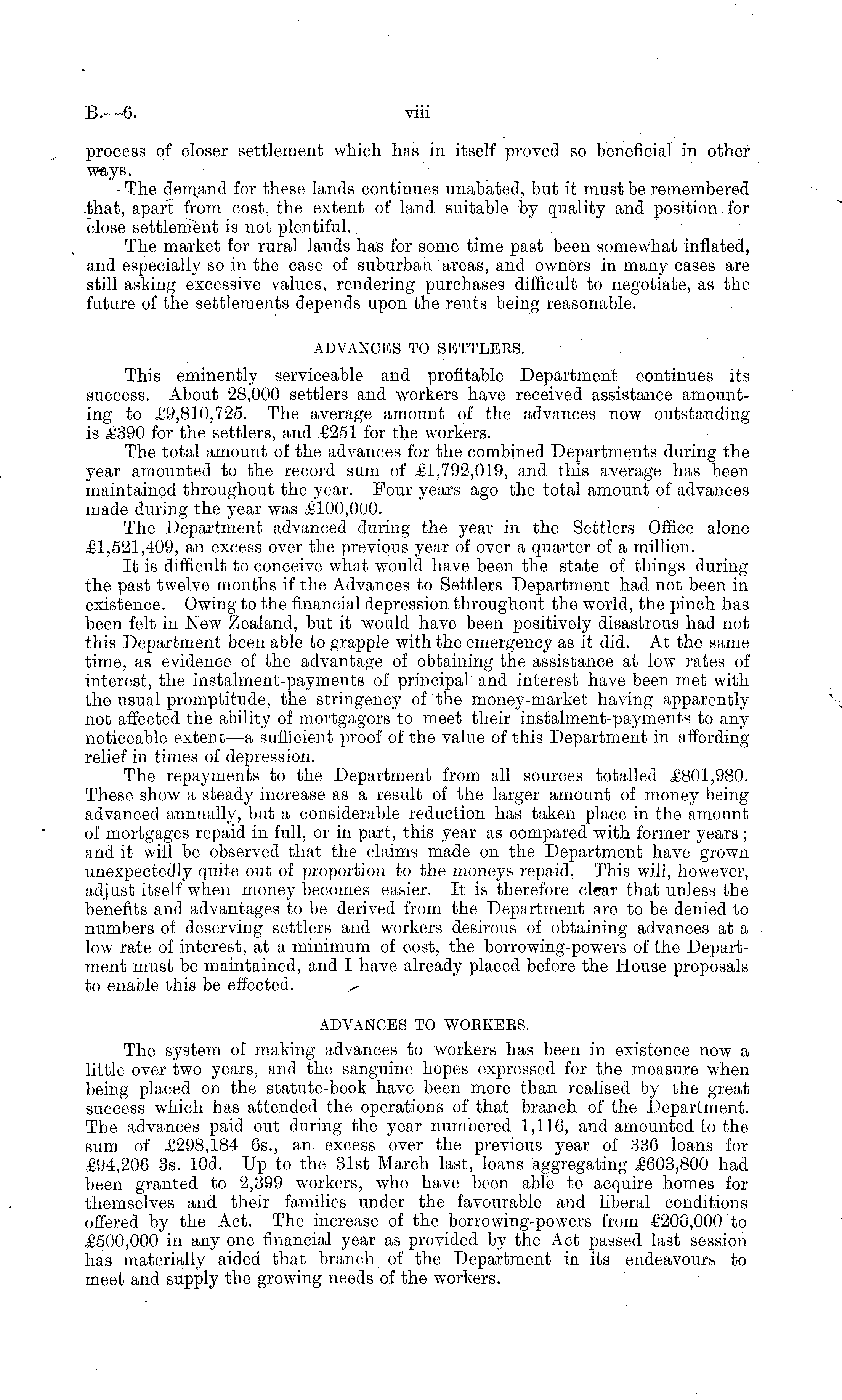 process of closer settlement which has in itself proved so beneficial in other ways. The demand for these lands continues unabated, but it must be remembered that, apart from cost, the extent of land suitable by quality and position for close settlement is not plentiful. The market for rural lands has for some time past been somewhat inflated, and especially so in the case of suburban areas, and owners in many cases are still asking excessive values, rendering purchases difficult to negotiate, as the future of the settlements depends upon the rents being reasonable. ADVANCES TO SETTLERS. This eminently serviceable and profitable Department continues its success. About 28,000 settlers and workers have received assistance amounting to £9,810,725. The average amount of the advances now outstanding is £390 for the settlers, and £251 for the workers. The total amount of the advances for the combined Departments during the year amounted to the record sum of £1,792,019, and this average has been maintained throughout the year. Four years ago the total amount of advances made during the year was £100,000. The Department advanced during the year in the Settlers Office alone £1,521,409, an excess over the previous year of over a quarter of a million. It is difficult to conceive what would have been the state of things during the past twelve months if the Advances to Settlers Department had not been in existence. Owing to the financial depression throughout the world, the pinch has been felt in New Zealand, but it would have been positively disastrous had not this Department been able to grapple with the emergency as it did. At the same time, as evidence of the advantage of obtaining the assistance at low rates of interest, the instalment-payments of principal and interest have been met with the usual promptitude, the stringency of the money-market having apparently not affected the ability of mortgagors to meet their instalment-payments to any noticeable extent —a sufficient proof of the value of this Department in affording relief in times of depression. The repayments to the Department from all sources totalled £801,980. These show a steady increase as a result of the larger amount of money beingadvanced annually, but a considerable reduction has taken place in the amount of mortgages repaid in full, or in part, this year as compared with former years ; and it will be observed that the claims made on the Department have grown unexpectedly quite out of proportion to the moneys repaid. This will, however, adjust itself when money becomes easier. It is therefore clear that unless the benefits and advantages to be derived from the Department are to be denied to numbers of deserving settlers and workers desirous of obtaining advances at a low rate of interest, at a minimum of cost, the borrowing-powers of the Department must be maintained, and I have already placed before the House proposals to enable this be effected. ADVANCES TO WORKERS. The system of making advances to workers has been in existence now a little over two years, and the sanguine hopes expressed for the measure when being placed on the statute-book have been more than realised by the great success which has attended the operations of that branch of the Department. The advances paid out during the year numbered 1,116, and amounted to the sum of £298,184 65., an excess over the previous year of 336 loans for £94,206 3s. lOd. Up to the 31st March last, loans aggregating £603,800 had been granted to 2,399 workers, who have been able to acquire homes for themselves and their families under the favourable and liberal conditions offered by the Act. The increase of the borrowing-powers from £200,000 to £500,000 in any one financial year as provided by the Act passed last session has materially aided that branch of the Department in its endeavours to meet and supply the growing needs of the workers.