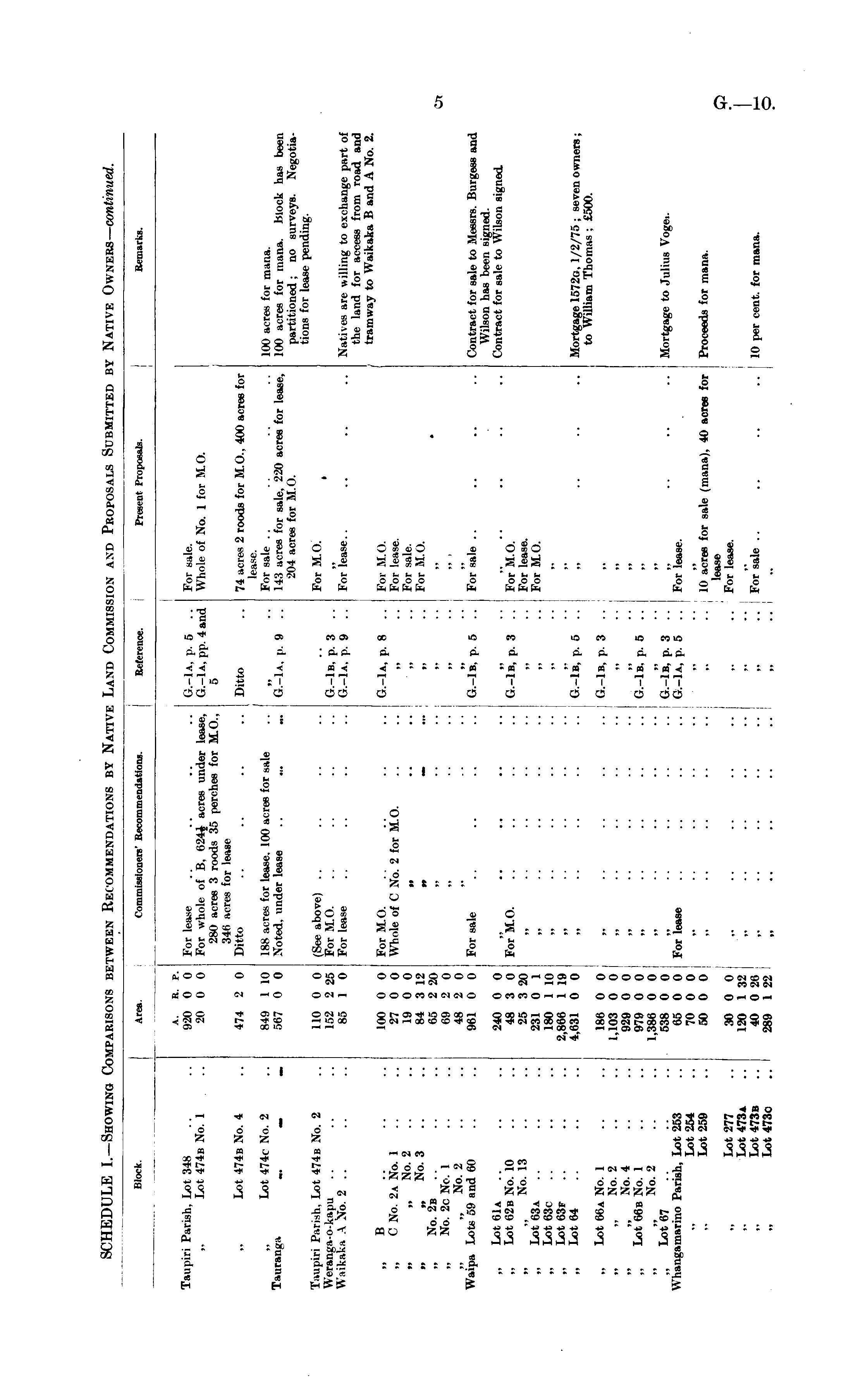 Block. Ana Commissioners' Recommendations. Reference. Present Proposals. Remarks. Taupiri Parish, Lot 348 Lot 474b No. 1 A. R. P. 920 0 0 20 0 0 For lease For whole of B. 624«} acres under lease, 280 acres 3 roods 35 perches for MO., 340 acres for lease Ditto G.-lA, p. 5 G.-l a. pp. 4 and 5 For sale. Whole of No. 1 for MO. Lot 474b No. 4 Lot 474c No. 2 Tauran.a _. _ 474 2 0 849 1 10 567 0 0 188 acres for lease. 100 acres for sale Noted, under lease Ditto G.-lA. p. 9 74 acres 2 roods for MO., 400 acres for lease. For sale 143 acres for sale, 220 acres for lease, 204 acres for II.( I. 100 acres for mana. 100 acres for mana. block has been partitioned; no surveys. Negotiations for lease pending. Taupiri Parish, Lot 474b No. 2 Weranga-o- kapu W.iikaka A No. 2 .. 110 0 0 152 2 25 85 1 0 (See above) For 11.0. For lease G.-Ib, p. 3 G.-l a, p. 9 For M.O. Natives are willing to exchange part of the land for access from road and tramway to Waikaka B and A No. 2. For lease.. B C No. 2a No. 1 „ No. 2 .. „ No. 3 No. 2b No. 2c No. 1 „ No. 2 Waipa Lots 59 and 60 100 0 0 27 0 0 19 0 0 84 3 12 65 2 20 69 2 0 48 2 0 961 0 0 For M.O. Whole of 0 No. 2 for M.O. G.-Ia, p. 8 .. Fur M.O. For lease. For sale. For M.O. .. .. •» • • • . ■_ - „ Contract for sale to Messrs. Burgess and Wilson has been signed. Contract for sale to Wilson signed .. , For sale G.-lB, p. 5 .. For sale Lot 61a Lot 62b No. 10 No. 13 Lot 63a „ Lot 63c Lot 63f Lot 64 240 0 0 48 3 0 25 3 20 231 0 1 180 1 10 2,866 1 19 4,631 0 0 For'll.O. '.'. '.'. G.-lB, p. 3 For M.O. For lease. For II. O. G.-lB, p. 5 Mortgage 1572o, 1/2/75 ; seven owners; to William Thomas : £500. Lot 66a No. 1 No. 2 No. 4 Lot 66b No. 1 No. 2 „ Lot 67 Whangamarino Parish, Lot 263 Lot 254 Lot 259 186 0 0 1,103 0 0 929 0 0 979 0 0 1,386 0 0 538 0 0 65 0 0 70 0 0 50 0 0 G.-lB, p. 3 I G.-lB, p. 5 Mortgage to Julius Vogei. For lease G.-Ib, p. 3 .'. G.-Ia, p. 5 .. For lease. 10 acres for sale (mana), 40 acres for lease For lease. Proceeds for mana. Lot 277 Lot 473a Lot 473b Lot 473c 30 0 0 120 1 32 40 0 26 289 1 22 ,. For sale 10 per cent, for mana. .. i