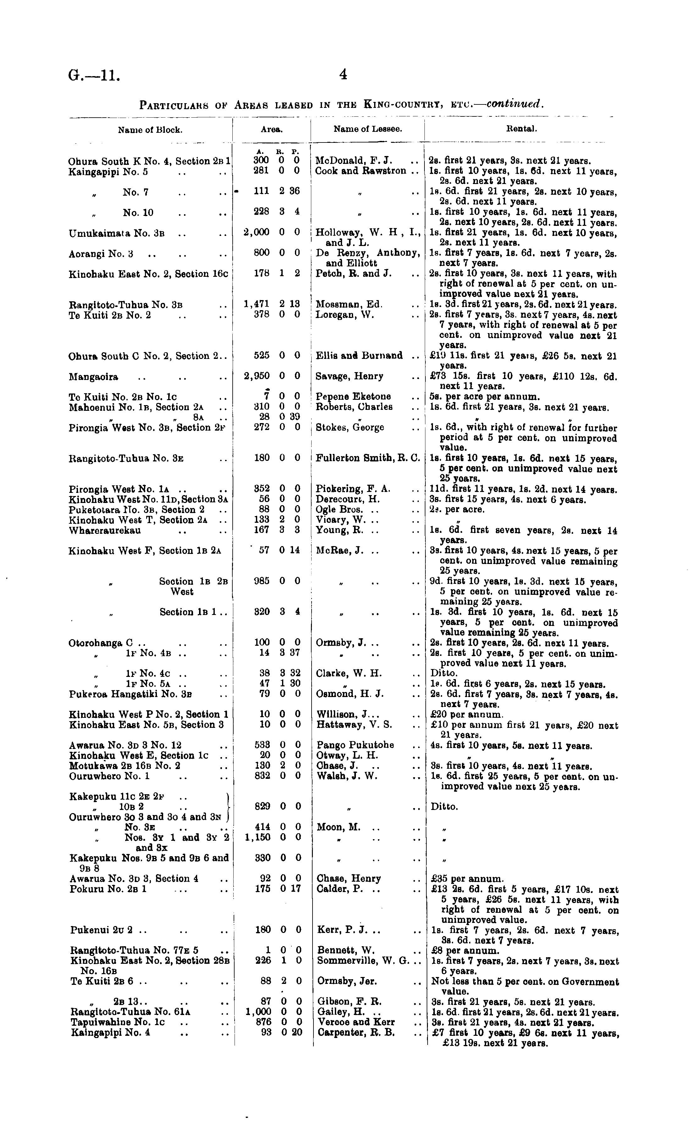 Name: of Block. Area. Area. Name of Lessee. Kontal. A. It. P. Ohura South K No. 4, Section 2b 1 300 0 0 Kaingapipi No. 5 .. .. 281 0 0 McDonald, F. J. Cook and Rawstron .. 2s. first 21 years, 3s. next 21 years. Iβ. first 10 years, Is. 6d. next 11 years, 2s. 6d. next 21 years. Is. Gd. first 21 years, 2s. next 10 years, 2s. Cd. next 11 years. Is. first 10 years, Is. 6d. next 11 years, 2s. next 10 years, 2s. 6d. next 11 years. Is. first 21 years, Is. 6d. next 10 years, 2s. next 11 years. Is. first 7 years, Is. 6d. next 7 years, 2s. next 7 years. 2s. first 10 years, 3s. next 11 years, with right of renewal at 5 per cent, on unimproved value next 21 years. Iβ. 3d.first21years,2s.6d. next 21 years. 2s. first 7 years, 3s. next 7 years, 4s. next 7 years, with right of renewal at 5 per cent, on unimproved value next 21 No. 7 .. .. - 111 2 36 No. 10 .. .. 228 3 4 a • ■ Umukaimata No. 3b .. .. 2,000 0 0 Aorangi No. 3 .. .. .. 800 0 0 Holloway, W. H , I., and J. it. Dβ Renzy, Anthony, and Elliott Fetch, R. and J. Kinohaku East No. 2, Section 16c ; 178 1 2 Rangitoto-Tuhua No. 3b .. 1,471 2 13 To Kuiti 2b No. 2 .. .. 378 0 0 Moseman, Ed. Loregan, W. Ohura South C No. 2, Section 2.. 525 0 0 Ellis and Burnand .. years. £19 11s. first 21 years, £26 5a. next 21 years. £73 15s. first 10 years, £110 12s. 6d. next 11 years. 5s. per acre per annum. Is. 6'd. first 21 years, 3s. next 21 years. Mangaoira .. .. .. 2,950 0 0 Savage, Henry To Kuiti No. 2b No. lc .. 7 0 0 Mahoenui No. Iβ, Section 2a .. 310 0 0 8a .. 28 0 39 Pirongia West No. 3b, Section 2f ' 272 0 0 Pepene Eketone Roberts, Charles Stokes, George Is. 6d., with right of renewal for further period at 5 per cent, on unimproved value. Is. first 10 years, Is. 6d. next 15 years, 5 per cent, on unimproved value next 25 years. lid. first 11 years, Is. 2d. next 14 years. 3s. firet 15 years, 4s. next 6 years. 9li per acre. Rangitoto-Tuhua No. 3e .. 180 0 0 Pullerton Smith, R. C. Pirongia West No. Iα .. .. 352 0 0 Kinohaku WestNo. 11d, Section 3a 56 0 0 Puketotara No. 3b, Seotion 2 .. 88 0 0 Kinohaku West T, Seotion 2a .. 133 2 0 Wharcraurekau .. .. 167 3 3 Piokering, F. A. Derecouri, H. Ogle Bros. Vioary, W. Young, R. .. Kinohaku Weet F, Section Iβ 2a 57 0 14 Section Iβ 2b 985 0 0 West Section Iβ 1 .. 320 3 4 Otorohanga C .. .. .. 100 0 0 If No. 4b .. .. 14 3 37 McRae, J. .. Ormsby, J. .. Is. Gd. first seven years, 2s. next 14 years. 3s. first 10 years, 4s. next 15 years, 5 per cent, on unimproved value remaining 25 years. 9d. first 10 years, Iβ. 3d. next 15 years, 5 per cent, on unimproved value remaining 25 years. Is. 3d. first 10 years, Is. 6d. next 15 years, 5 per cent, on unimproved value remaining 25 years. 2s. first 10 years, 2s. 6d. next 11 years. 2s. first 10 years, 5 per cent, on unimproved value next 11 years. Ditto. Is. (id. first 6 years, 2s. next 15 years. 2s. Od. first 7 years, 3s. next 7 years, 4s. next 7 years. £20 per annum. £10 per annum first 21 years, £20 next 21 years. 4s. first 10 years, 5s. next 11 years. If No. 4c .. .. 38 3 32 If No. 5a .. . . 47 1 30 Pukeroa Hangatiki No. 3b .. 79 0 0 Clarke, W. H. Osmond, H. J. Kinohaku West P No. 2, Seotion 1 10 0 0 Kinohaku East No. 5b, Section 3 10 0 0 Willison, J... Hattaway, V. S. Awarua No. 3d 3 No. 12 .. 533 0 0 Kinohaku West E, Section lc .. 20 0 0 Motuka'wa 2b 16n No. 2 .. 130 2 0 Ouruwhero No. 1 .. .. 832 0 0 Pango Pukutohe Otway, L. H. Chase, J. .. Walsh, J. W. 3s. first 10 years, 4s. next 11 yeare. Iβ. 6d. first 25 years, 5 per cent, on unimproved value next; 25 years. Kakepuku lie 2e 2f .. ) 10b 2 .. 829 0 0 Ouruwhero 30 3 and 3o 4 and 3n ) No. 3e .. .. 414 0 0 Nos. 3y 1 and 3v 2 1,150 0 0 and 3x Kakepuku Nos. 9b 5 and 9b 6 and 330 0 0 9b 8 Awarua No. 3d 3, Section 4 .. 92 0 0 Pokuru No. 2b 1 ... .. 175 0 17 Moon, M. .. Ditto. Chase, Henry Calder, P. .. £35 per annum. £13 2s. 6d. first 5 years, £17 10s. next 5 years, £26 5s. next 11 years, with right of renewal at 5 per cent, on unimproved value. Is. first 7 years, 2s. 6d. next 7 years, 3s. 6d. next 7 years. £8 per annum. Iβ. first 7 years, 2s. next 7 years, 3s. next 6 yeare. Not less than 5 per cent, on Government value. 3s. first 21 years, 5s. next 21 years. Is. 6d. first 21 years, 2s. 6d. next 21 years. 3e. first 21 years, 4s. next 21 years. £7 first 10 years, £9 6s. next 11 years, £13 19s. next 21 years. Kerr, P. J. .. Pukenui 2u 2 .. .. .. 180 0 0 Rangitoto-Tuhua No. 77e 5 .. 10 0 Kinohaku East No. 2, Section 28b 226 1 0 No. 16b Te Kuiti 2b 6 .. .. .. 88 2 0 Bennett, W. Sommerville, W. G. .. Ormeby, Jer. 2b 13.. .. .. 87 0 0 Rangitoto-Tuhua No. 61a .. 1,000 0 0 Tapuiwahine No. lc .. .. 876 0 0 Kaingapipi No. 4 .. .. 93 0 20 Gibson, F. R. Gailey, H. .. Vercoe and Kerr Carpenter, R. B.